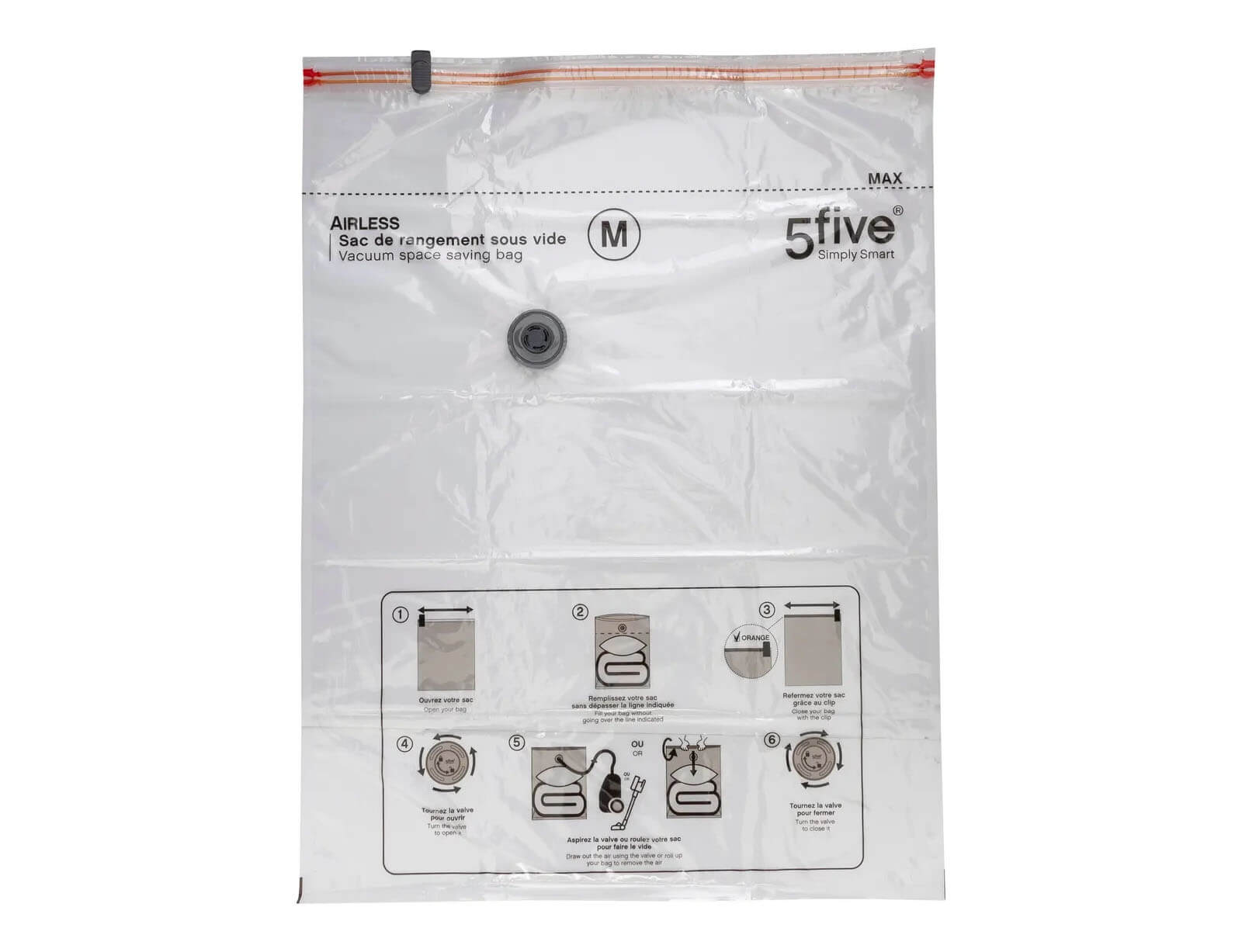 Τακτοποιήστε και οργανώστε το σπίτι σας με τη σακούλα αποθήκευσης κενού αέρος από τη 5five. Η σακούλα συρρίκνωσης κενού αέρος θα μειώσει τον όγκο των ρούχων που θέλετε να αποθηκεύσετε και θα σας προσφέρει όχι μόνο εξοικονόμηση χώρου αλλά και απόλυτη προστασία των ρούχων σας. Είναι αεροστεγής, προστατεύει από σκόνη, υγρασία, μυρωδιές, ακάρεα και σκόρο. Ανοίξτε το καπάκι της βαλβίδας, ενεργοποιήστε την ηλεκτρική σκούπα για να απορροφήσει όλο τον αέρα.