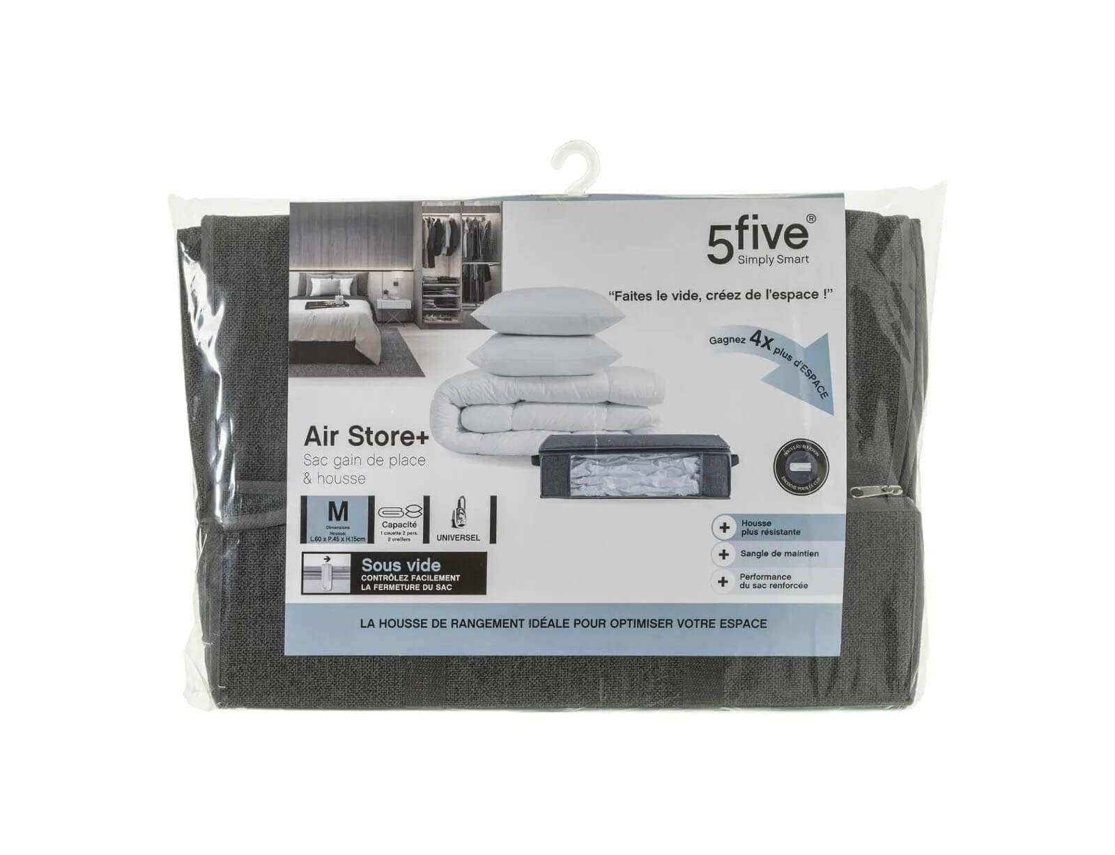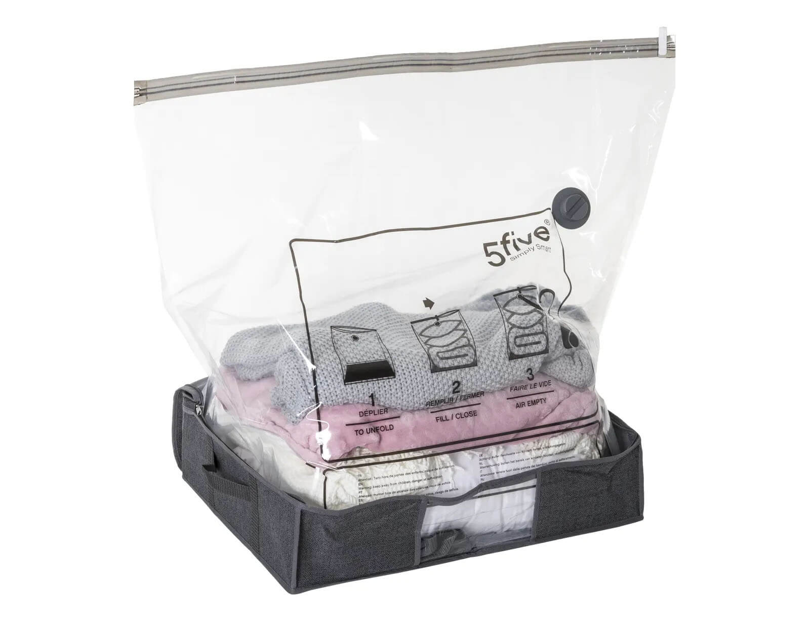 Τακτοποιήστε και οργανώστε το σπίτι σας με τη θήκη αποθήκευσης από τη 5five. Διαθέτει σακούλα συρρίκνωσης κενού αέρος, η οποία θα μειώσει τον όγκο των ρούχων που θέλετε να αποθηκεύσετε και θα σας προσφέρει όχι μόνο εξοικονόμηση χώρου αλλά και απόλυτη προστασία των ρούχων σας. Είναι αεροστεγής, προστατεύει από σκόνη, υγρασία, μυρωδιές, ακάρεα και σκόρο. Ανοίξτε το καπάκι της βαλβίδας, ενεργοποιήστε την ηλεκτρική σκούπα για να απορροφήσει όλο τον αέρα.