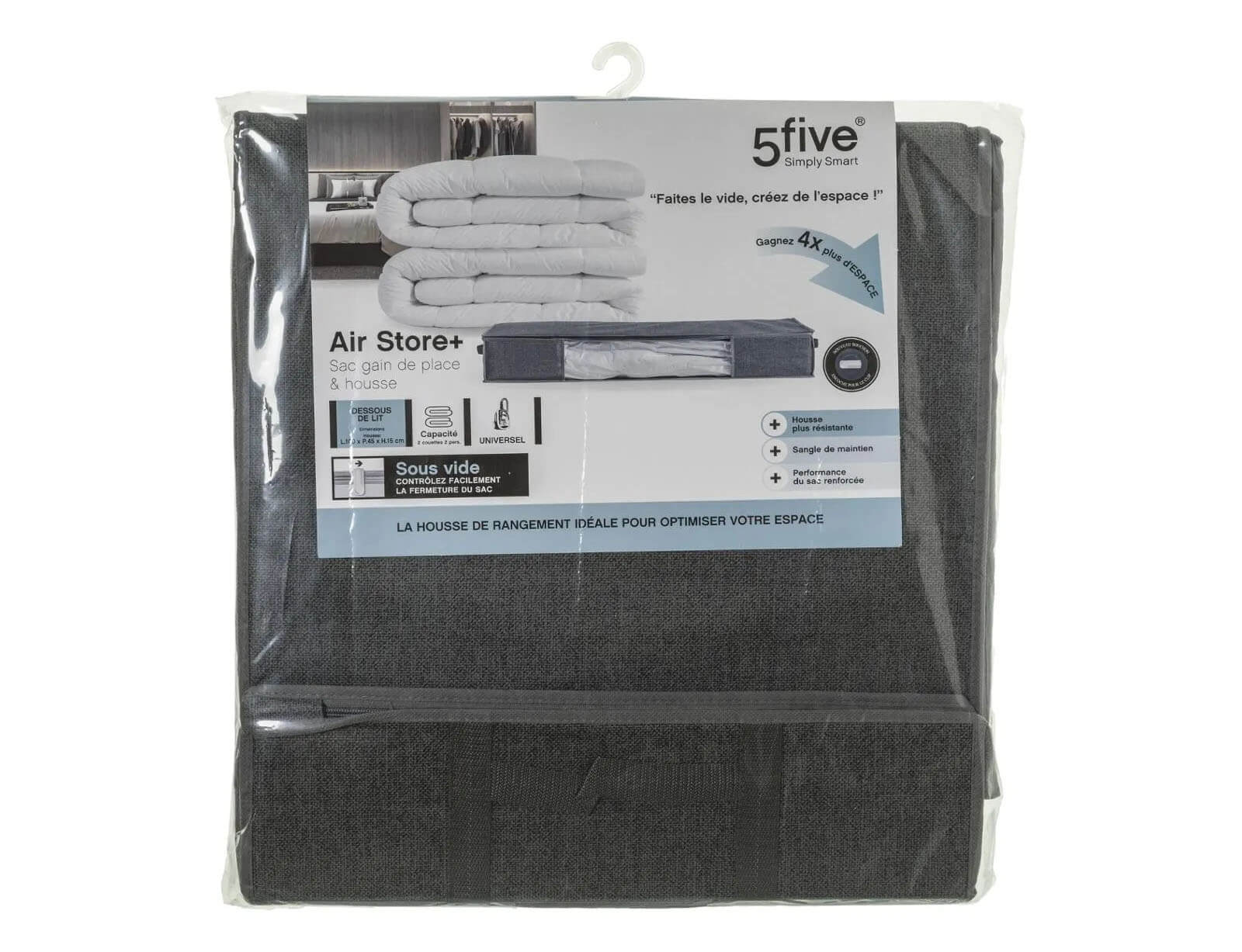 Τακτοποιήστε και οργανώστε το σπίτι σας με τη θήκη αποθήκευσης από τη 5five. Διαθέτει σακούλα συρρίκνωσης κενού αέρος, η οποία θα μειώσει τον όγκο των ρούχων που θέλετε να αποθηκεύσετε και θα σας προσφέρει όχι μόνο εξοικονόμηση χώρου αλλά και απόλυτη προστασία των ρούχων σας. Είναι αεροστεγής, προστατεύει από σκόνη, υγρασία, μυρωδιές, ακάρεα και σκόρο. Ανοίξτε το καπάκι της βαλβίδας, ενεργοποιήστε την ηλεκτρική σκούπα για να απορροφήσει όλο τον αέρα.