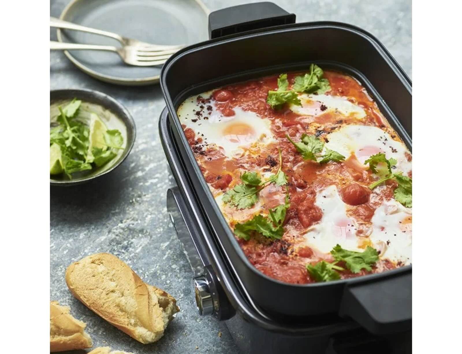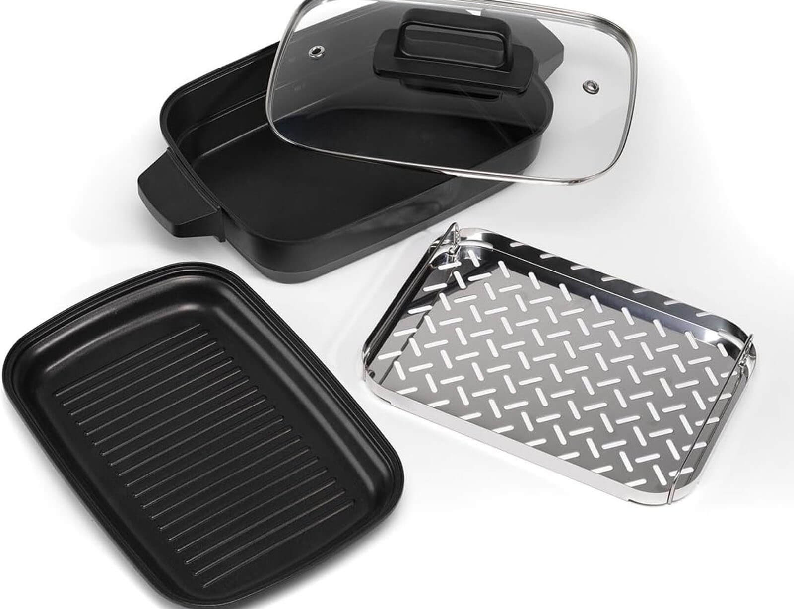 Ζεσταίνεται σε λιγότερο από 6 λεπτά και με εύρος θερμοκρασίας 90 ̊C -220 ̊C, το οποίο μπορεί να ελεγχθεί με τον επιλογέα θερμοκρασίας, είναι τέλειος για όλους τους τύπους μαγειρέματος, από το απαιτητικό μαγείρεμα μέχρι το απαλό ψήσιμο. Έρχεται με εναλλασσόμενα αντικολλητικά σκεύη για ψήσιμο, μαγείρεμα ή μαγείρεμα στον ατμό, τα οποία μπορούν να στοιβάζονται μαζί με το γυάλινο καπάκι, για εύκολη αποθήκευση. Τα σκεύη και το γυάλινο καπάκι πλένονται στο πλυντήριο πιάτων για εύκολο καθάρισμα.