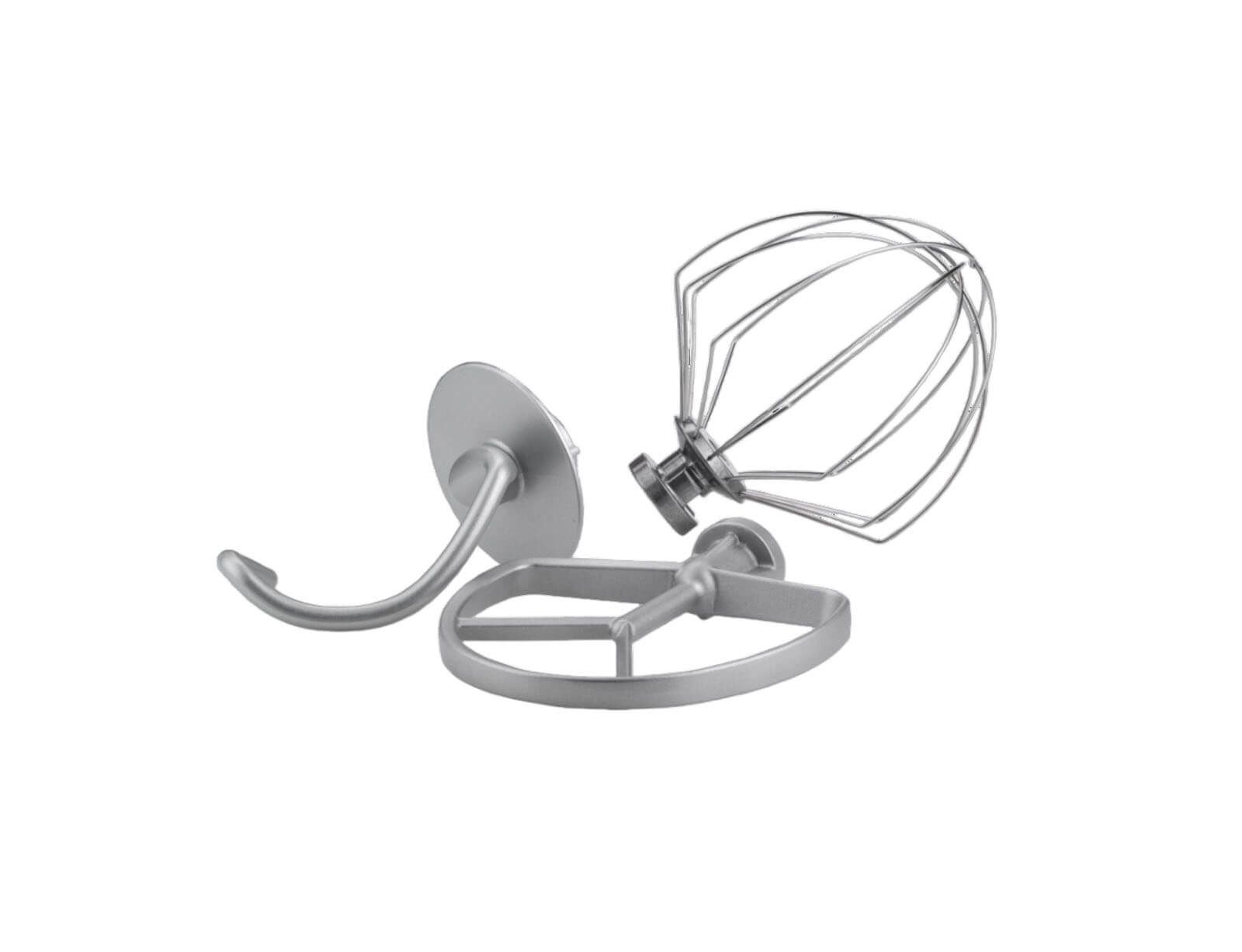 - Περιλαμβάνει χτυπητήρι-σύρμα για ελαφρύ χτύπημα, επίπεδο εξάρτημα για ανάμειξη, γάντζος ζύμης για ζύμωμα, προστατευτικό πιτσιλίσματος με στόμιο εκροής.