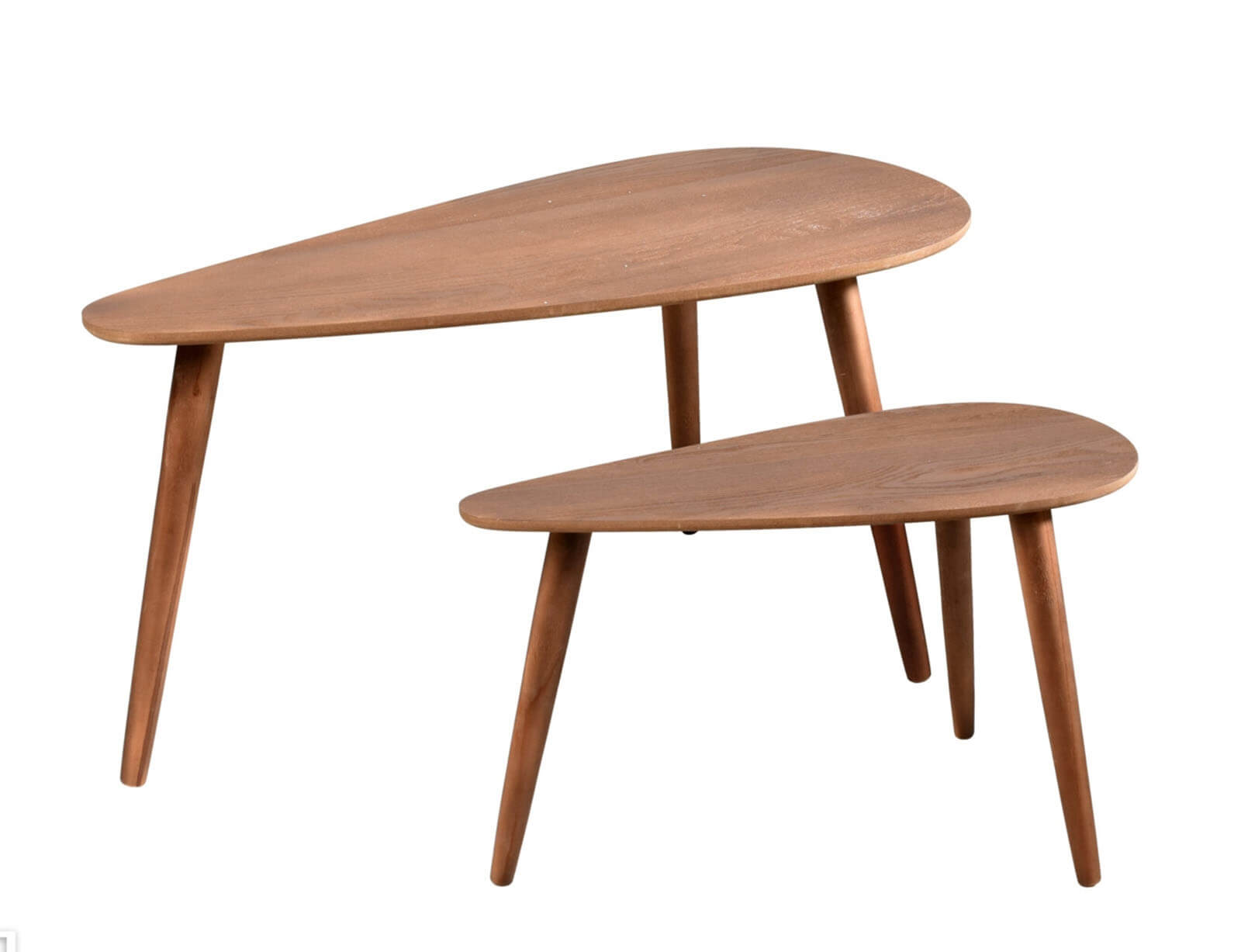 Το σετ βοηθητικά τραπεζάκια σαλονιού είναι ιδανικό για τοποθέτηση στο πλάι του καναπέ αλλά και σε διαφορετικά σημεία του σπιτιού προσφέροντας επιπλέον χώρο για την τοποθέτηση διακοσμητικών ή άλλων μικροαντικειμένων. Το σετ αποτελείται από δύο τραπεζάκια διαφορετικών μεγεθών σε τριγωνικό σχήμα και θα δώσουν στο χώρο μια μοντέρνα και μίνιμαλ αισθητική. Είναι κατασκευασμένα από MDF και διαθέτουν 3 πόδια από ξύλο καρυδιάς, για περισσότερη σταθερότητα.