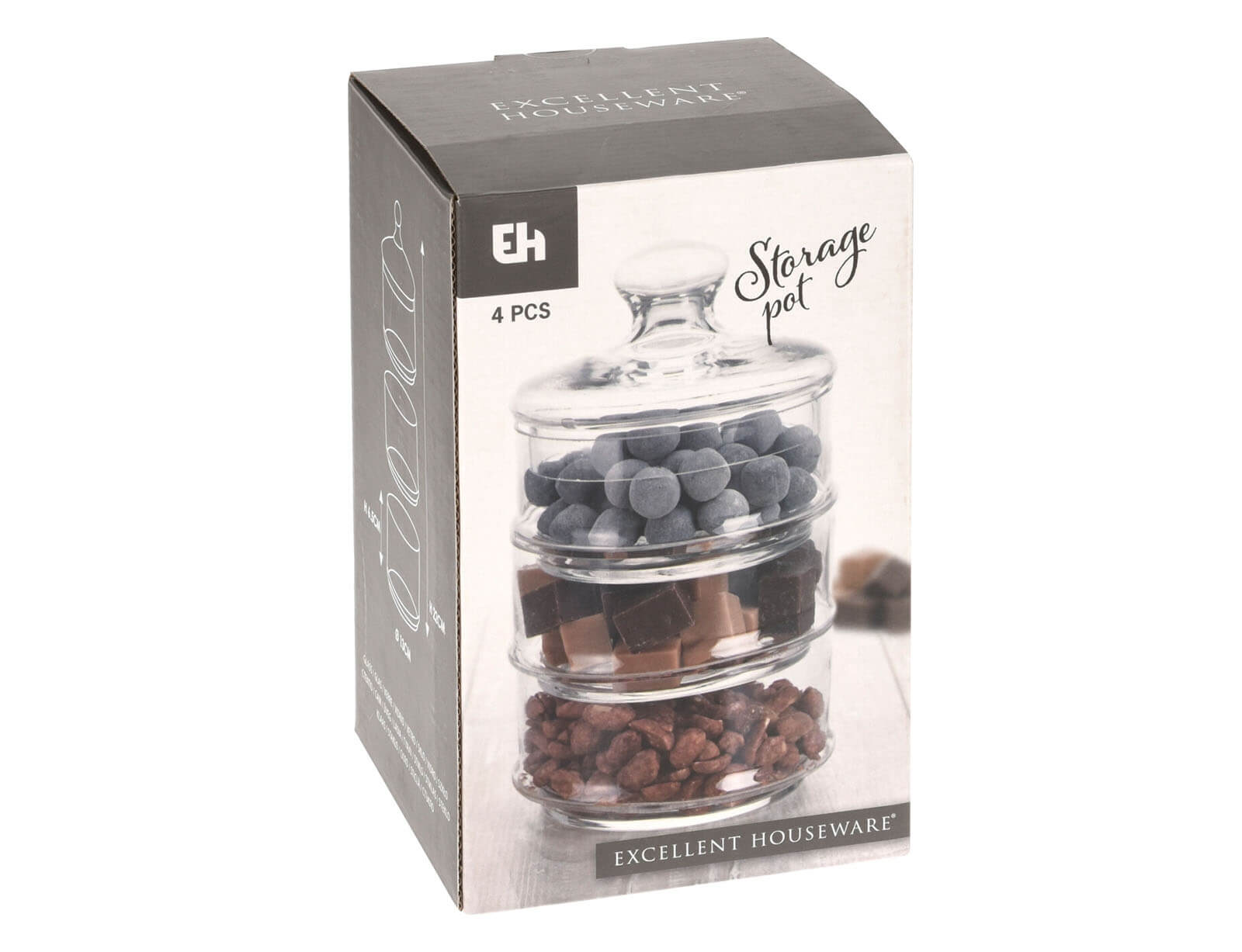 Με το γυάλινο δοχείο της εταιρείας Excellent Houseware μπορείτε να οργανώσετε την κουζίνα σας, να διακοσμήσετε το σπίτι και το τραπέζι σας ή ακόμα και να αποθηκεύσετε τρόφιμα ή τα αγαπημένα σας γλυκίσματα. Αποτελείται από 3 δοχεία, τα οποία στοιβάζονται το ένα πάνω στο άλλο για περισσότερη εξοικονόμηση χώρου. Διαθέτει καπάκι, το οποίο κλείνει αεροστεγώς, με αποτέλεσμα να μην αλλοιώνονται τα τρόφιμα από την υγρασία, τη μούχλα, τη σκόνη και άλλους ρύπους. Επίσης, το φαγητό σας θα παραμείνει πιο φρέσκο με το αρχικό άρωμα για μεγαλύτερο χρονικό διάστημα. Δεν συνίσταται η χρήση του σε φούρνο μικροκυμάτων ή σε κατάψυξη.