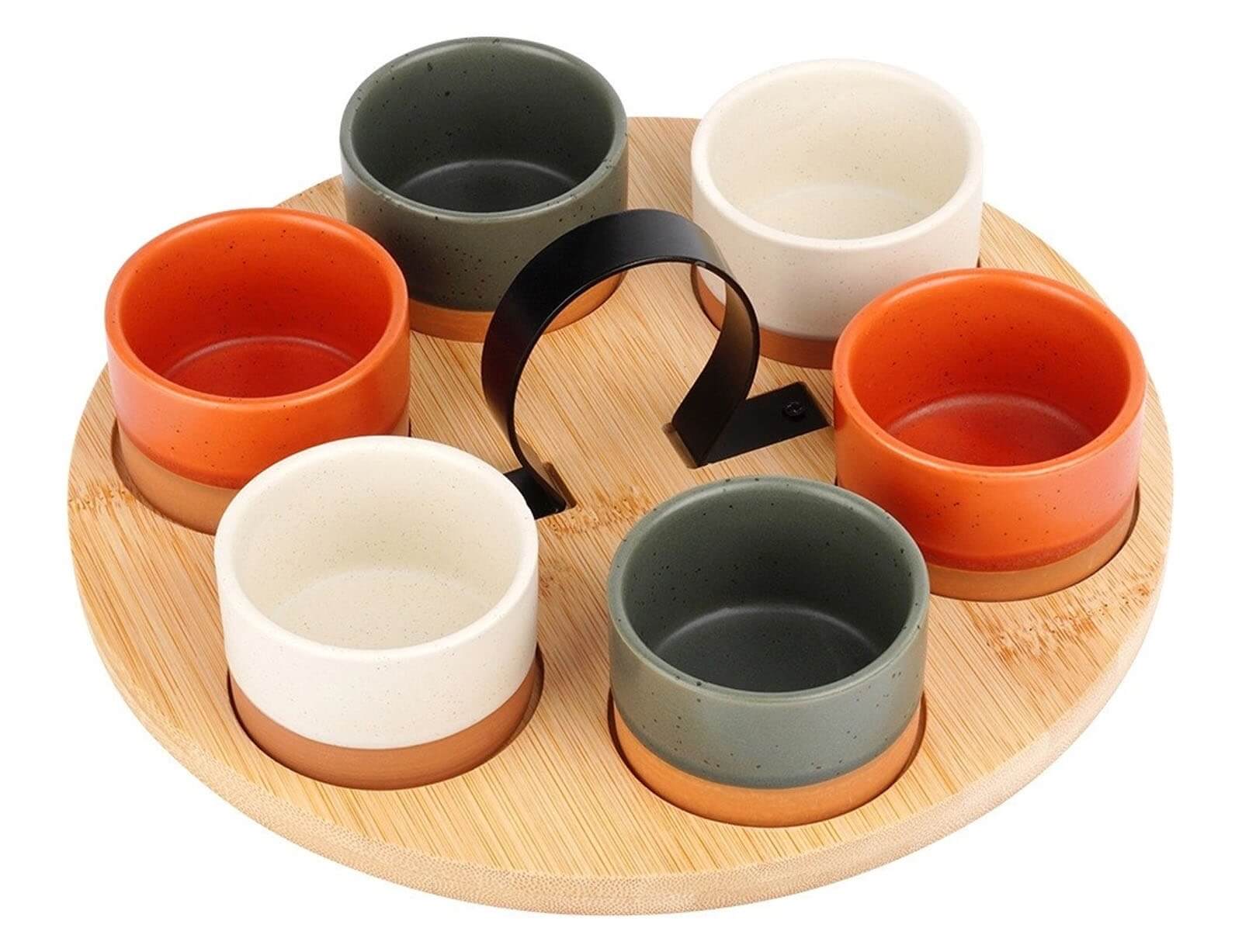 Σερβίρετε τα αγαπημένα σας σνακ ή σάλτσες με το σετ σερβιρίσματος από την Excellent Houseware. Το σετ αποτελείται από 6 μπολ διαφορετικών μεγεθών σε αποχρώσεις τερακότας, γκρι και λευκό και έναν ξύλινο δίσκο. Ο δίσκος διαθέτει εσοχές για να παραμένουν σταθερά τα μπολ και λαβή για να τον μεταφέρετε πιο εύκολα και σταθερά. Τα μπολ είναι κατασκευασμένα από κεραμικό υλικό και ο δίσκος από ξύλο μπαμπού.