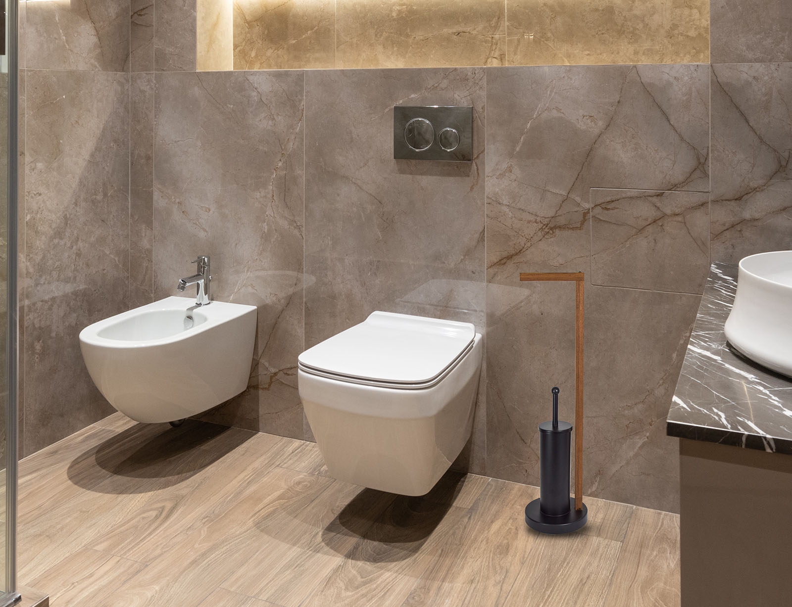 Ανανεώστε το μπάνιο σας με τη Βάση Χαρτιού Τουαλέτας με Πιγκάλ από τη Sepio! Με minimal σχεδιασμό και μοντέρνο μαύρο χρώμα, ταιριάζει απόλυτα σε κάθε στυλ διακόσμησης, προσφέροντας άνεση και οργάνωση στον χώρο σας. Η βάση είναι κατασκευασμένη από υψηλής ποιότητας μαύρο ατσάλι και ξύλο με πιστοποίηση FSC. Η βάση έχει μια συμπαγή στρογγυλή βάση, που εξασφαλίζει σταθερότητα. Το δοχείο της βούρτσας διαθέτει προστατευτικό πλαστικό δοχείο που προστατεύει από τη σκουριά και διευκολύνει τον καθαρισμό. Το ελαφρύ πλαίσιο σάς επιτρέπει να μετακινείτε εύκολα τη βάση σε ένα βολικό μέρος.