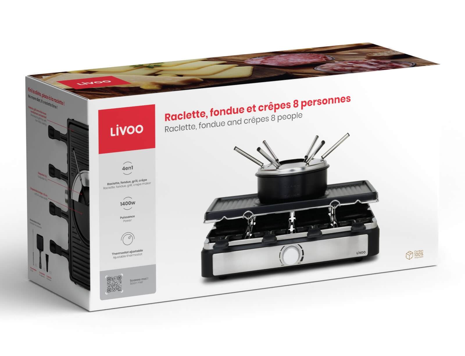 Ανακαλύψτε την Γκριλιέρα Raclette & Φοντύ Livoo DOC313 και απολαύστε 4 σε 1 γευστική εμπειρία με την οικογένεια και τους φίλους σας! Ιδανική για 8 άτομα, αυτή η πολυλειτουργική συσκευή σας επιτρέπει να απολαύσετε raclette, fondue, κρέπες και γκρίλ σε μία μόνο συσκευή!