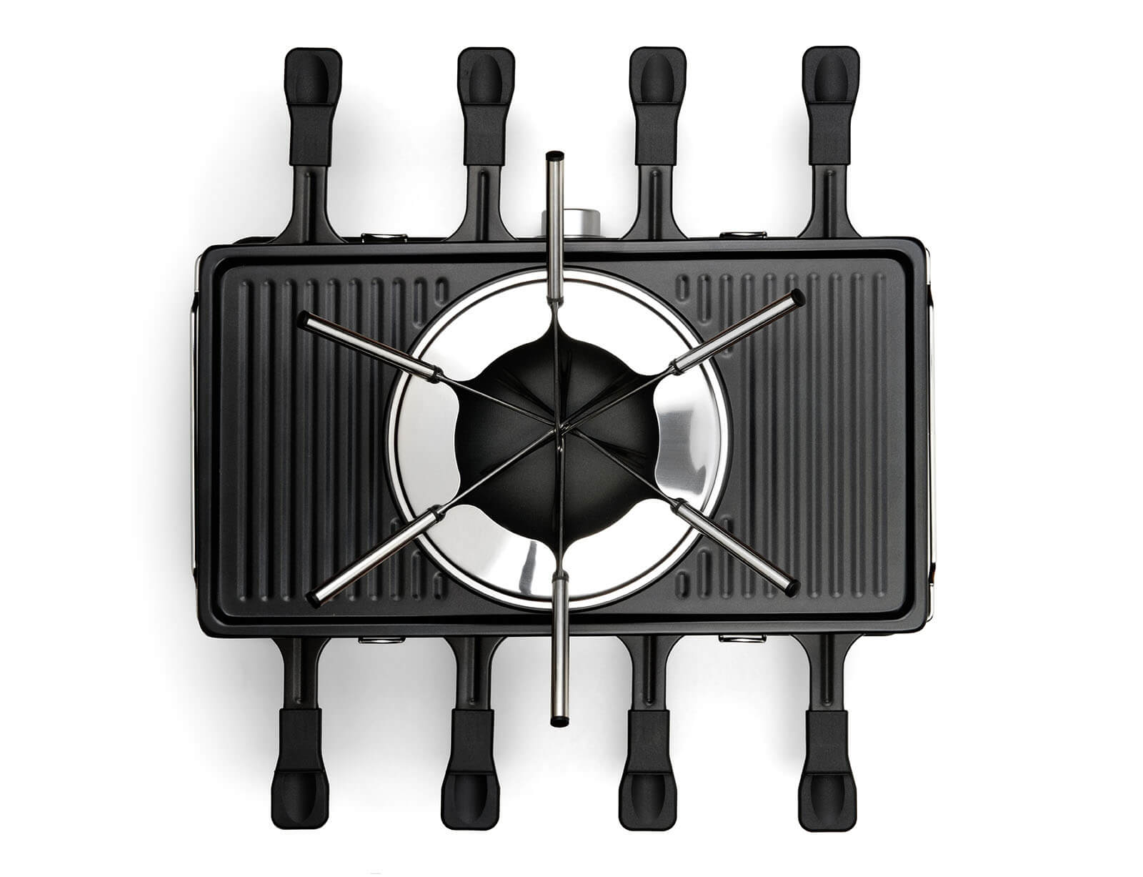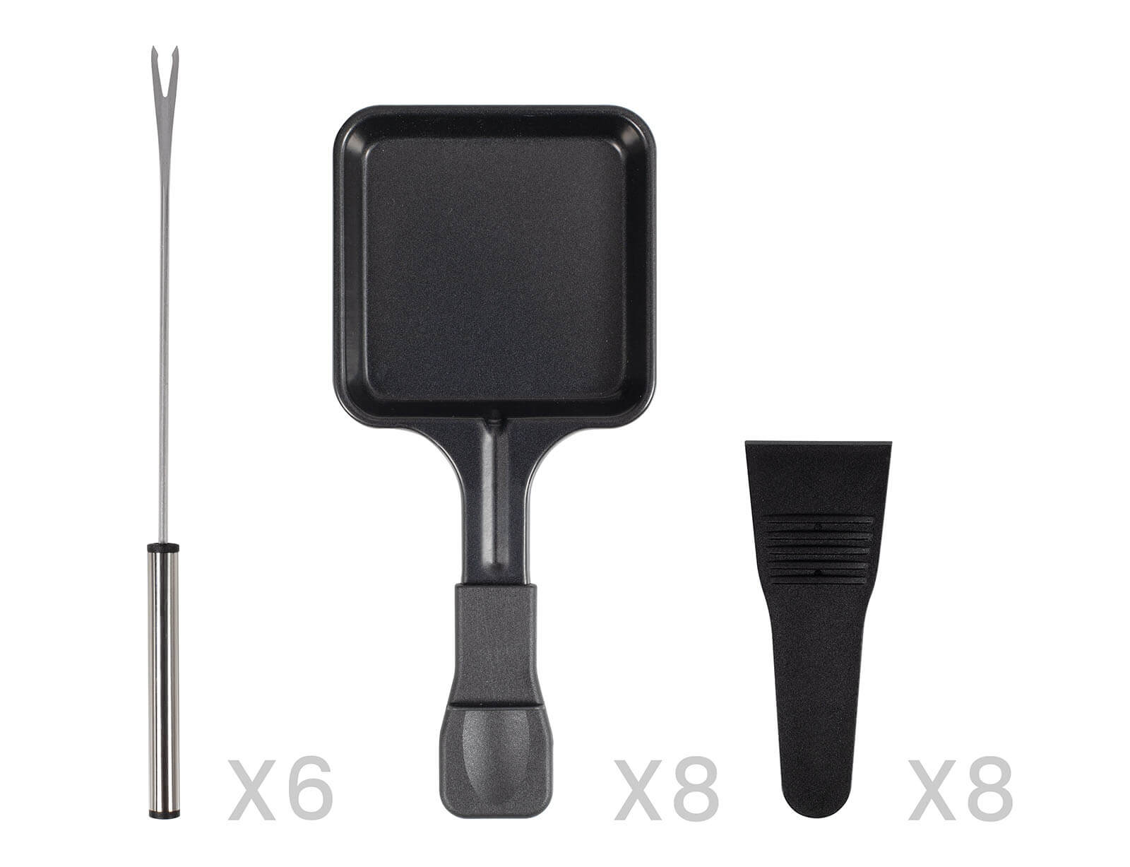 Η συσκευή περιλαμβάνει 1 caquelon 1,6L για το fondue με γιακά κατά των πιτσιλιών, 6 πιρούνια και 8 σπάτουλες, καθώς και 8 caquelon με αντικολλητική επίστρωση. Για σταθερότητα και ασφάλεια, διαθέτει 4 αντιολισθητικά πόδια που εξασφαλίζουν σταθερότητα κατά τη διάρκεια του μαγειρέματος.