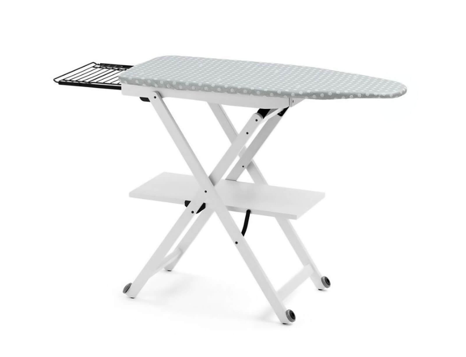 Ανακαλύψτε την Stirocomodo ARiT, τη σιδερώστρα που συνδυάζει αντοχή, λειτουργικότητα και κομψότητα! Κατασκευασμένη από συμπαγές ξύλο οξιάς, προσφέρει σταθερότητα και διαχρονική αισθητική. Η ρυθμιζόμενη κατασκευή της σας επιτρέπει να προσαρμόσετε το ύψος της σε τέσσερα επίπεδα (84 - 88 - 91 - 93 cm), έτσι ώστε να ταιριάζει απόλυτα στις ανάγκες σας και να κάνει το σιδέρωμα πιο άνετο, μειώνοντας την καταπόνηση της μέσης και της πλάτης σας. Η επιφάνεια της είναι κατασκευασμένη από γαλβανισμένο μέταλλο με διάτρητη σχεδίαση, επιτρέποντας τη βέλτιστη κυκλοφορία του ατμού. Έτσι, το ύφασμα δεν συγκρατεί υγρασία και το σιδέρωμα γίνεται πιο αποτελεσματικό και γρήγορο. Παράλληλα, διαθέτει ένα επιπλέον ευρύχωρο ράφι, ιδανικό για να τοποθετείτε ρούχα, πετσέτες ή αξεσουάρ σιδερώματος, κρατώντας τα όλα οργανωμένα και σε κοντινή απόσταση και τέσσερα ροδάκια με λάστιχο για να μπορείτε να την μετακινείτε πιο εύκολα, όταν είναι κλειστή, χωρίς να γρατσουνίσετε το δάπεδο σας. Το βαμβακερό κάλυμμα της είναι τυπωμένο και επικαλυμμένο με επεξεργασμένο αλουμίνιο, που το καθιστά ανθεκτικό στη θερμότητα, διατηρώντας πάντα την άψογη εμφάνισή του και συμβάλλοντας στη βελτίωση της απόδοσης του σιδερώματος.