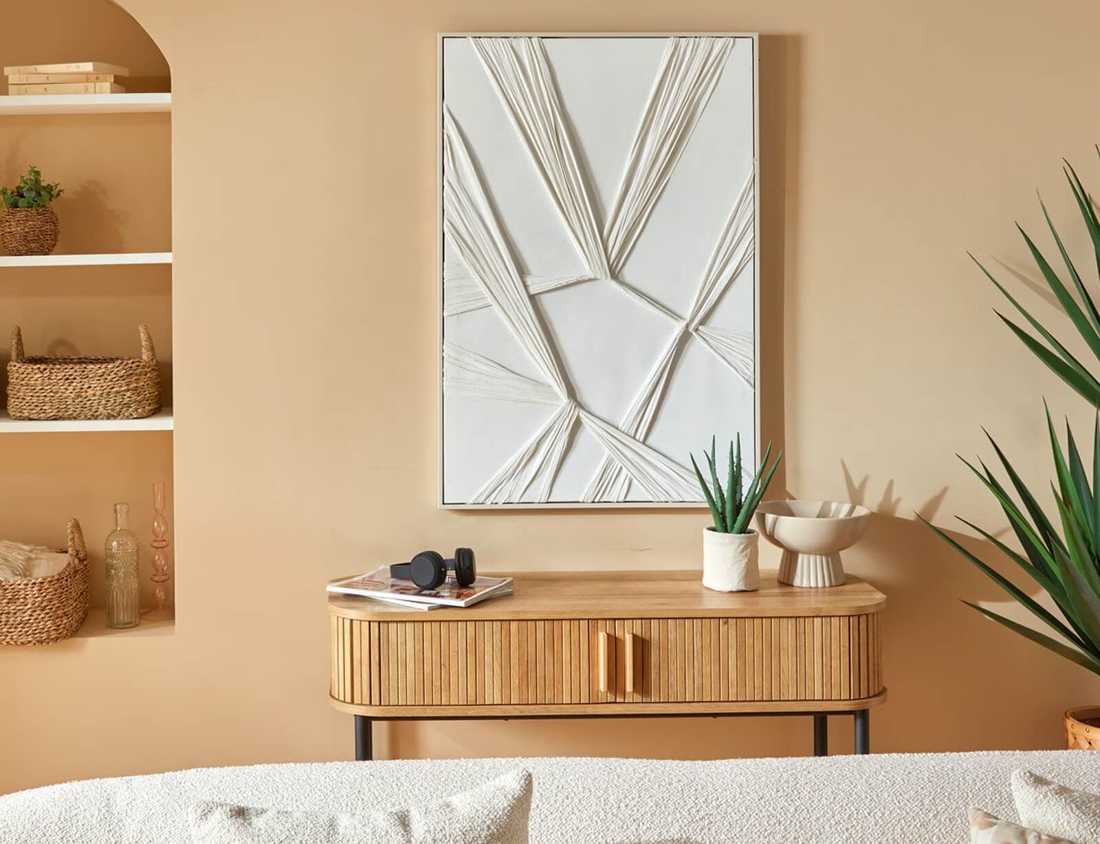 Ανανεώστε και αναβαθμίστε τη διακόσμηση του χώρου σας με το διακοσμητικό πίνακα από την Atmosphera. H λευκή απόχρωση του θα δώσει μια κομψή και minimal πινελιά στο χώρο σας. Τα ανάγλυφα σχέδια του παίζουν με το φως και δημιουργούν μια μοναδική αίσθηση ανάλογα με την ώρα. Περιμετρικά του καμβά υπάρχει ένα ξύλινο πλαίσιο, το οποίο δημιουργεί βάθος και τονίζει περισσότερο το τρισδιάστατο στοιχείο. Μπορεί να τοποθετηθεί είτε κάθετα είτε οριζόντια.