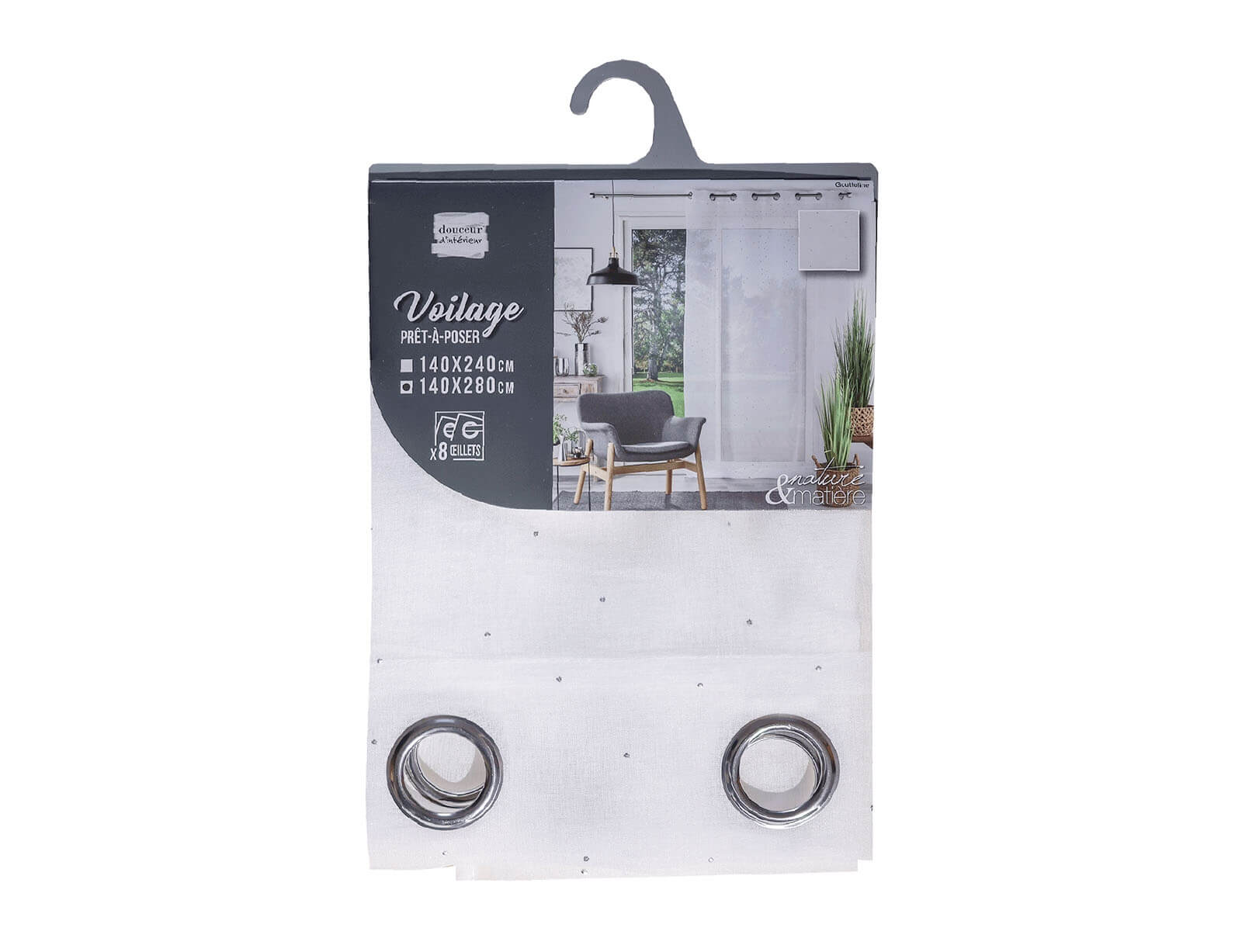 Είναι κατασκευασμένη από ύφασμα βουάλ, ένα πολύ ελαφρύ, διάφανο ύφασμα με ίνες από πολυεστέρα για μεγαλύτερη ανθεκτικότητα. Για την καλύτερη φροντίδα της κουρτίνας σας συνίσταται να ακολουθήσετε τις οδηγίες στην ετικέτα.