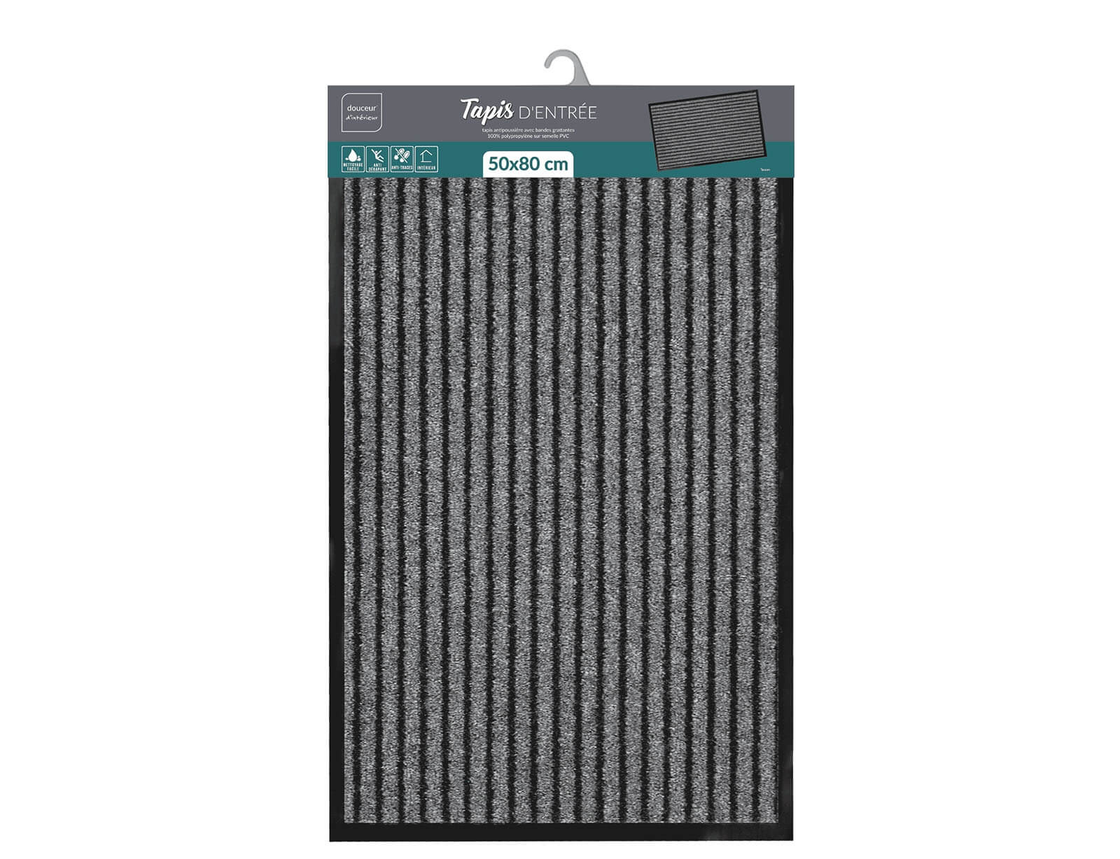 Ανανεώστε την είσοδο του σπιτιού σας με το χαλάκι Toscan Douceur d'intérieur, την ιδανική επιλογή για όσους αναζητούν λειτουργικότητα και κομψότητα. Κατασκευασμένο από υψηλής ποιότητας πλαστικό, το χαλάκι είναι ανθεκτικό και ειδικά σχεδιασμένο να παγιδεύει τη σκόνη και τη βρωμιά, διατηρώντας το χώρο σας καθαρό και τακτοποιημένο, ενώ το αντιολισθητικό υπόστρωμα εξασφαλίζει σταθερότητα και ασφάλεια ακόμα και σε υγρές ή ολισθηρές επιφάνειες, για να έχετε πλήρη έλεγχο στην είσοδό σας. Απαιτεί ελάχιστη συντήρηση, αφού μπορείτε να το σκουπίσετε με την ηλεκτρική σκούπα. Έτσι, θα εξοικονομήσετε χρόνο στο καθάρισμα και η είσοδός σας θα φαίνεται πάντα τακτοποιημένη. Οι γκρι ρίγες πάνω σε ανθρακί φόντο προσδίδουν στο χαλάκι μια μοντέρνα και κομψή εμφάνιση, που ταιριάζει άψογα σε κάθε είδος διακόσμησης.