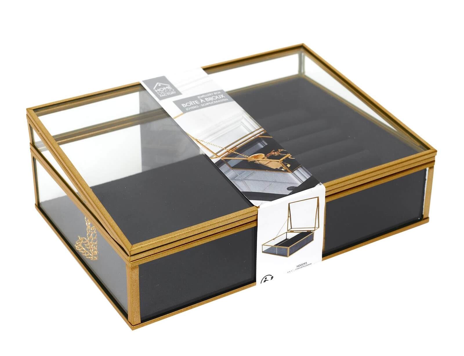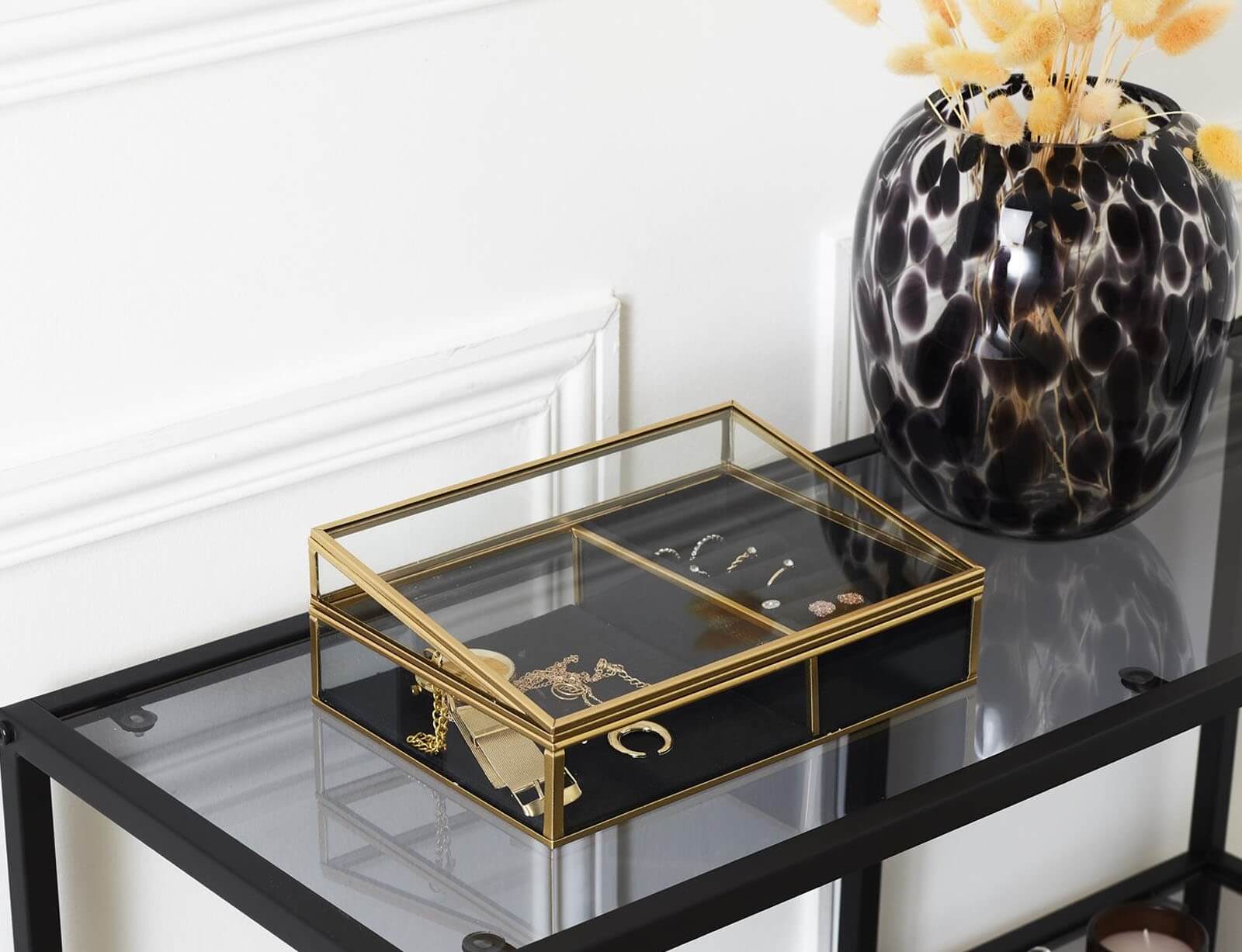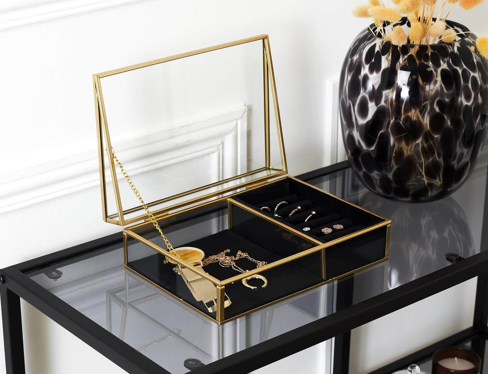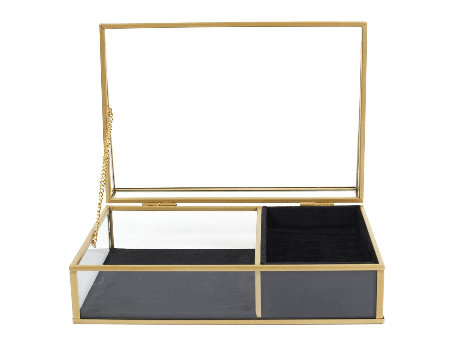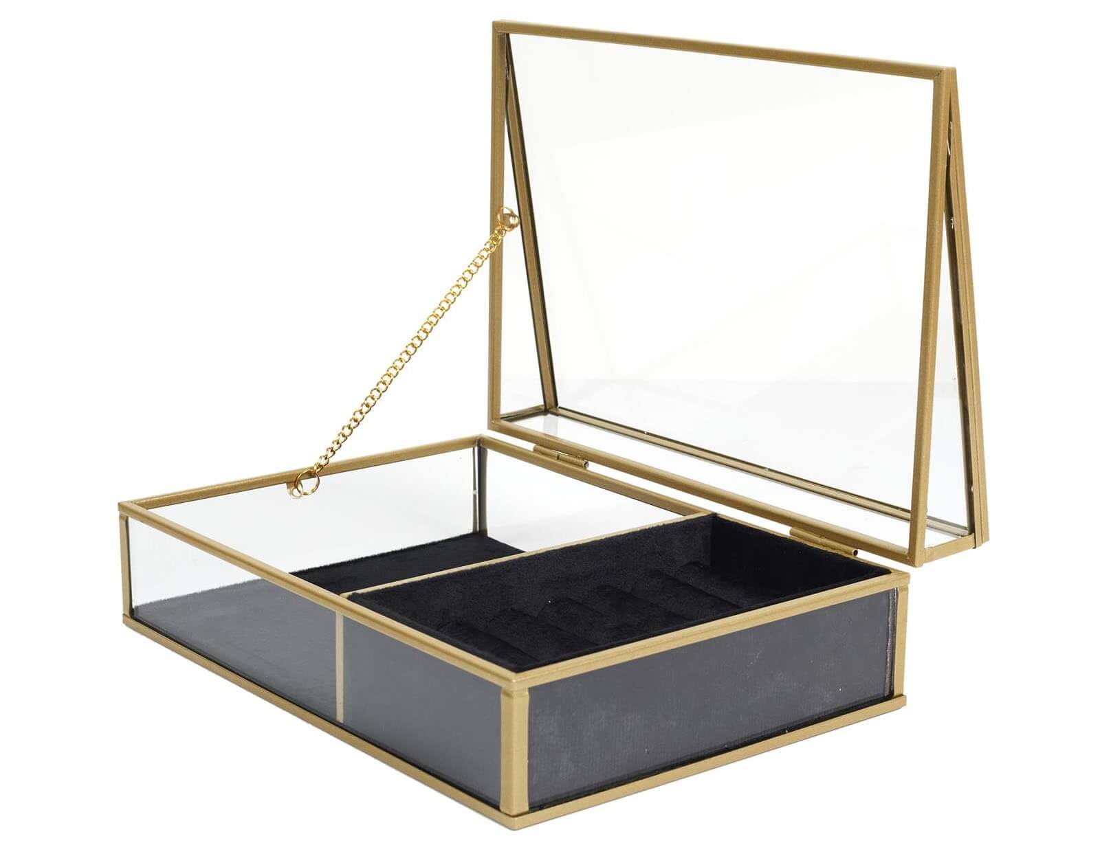 Γυάλινη Κοσμηματοθήκη Home Deco Factory με διαχωριστικά, θήκη για δαχτυλίδια και διαστάσεις 23x16x8cm