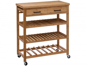 Οργανώστε έξυπνα τον χώρο σας με το πρακτικό και κομψό τρόλεϊ κουζίνας Klaus από τη Home Deco Factory. Διαθέτει δύο ευρύχωρα ράφια, θήκη για μπουκάλια, άνετη επιφάνεια εργασίας από ξύλο και πρακτικό συρτάρι για την αποθήκευση μικροαντικειμένων όπως μαχαιροπίρουνα, πετσέτες ή αξεσουάρ μαγειρικής. Οι διαστάσεις του το καθιστούν ιδανικό ακόμη και για μικρές κουζίνες, ενώ οι τέσσερις τροχοί με φρένα προσφέρουν μέγιστη ευκολία στη μετακίνηση και απόλυτη σταθερότητα.