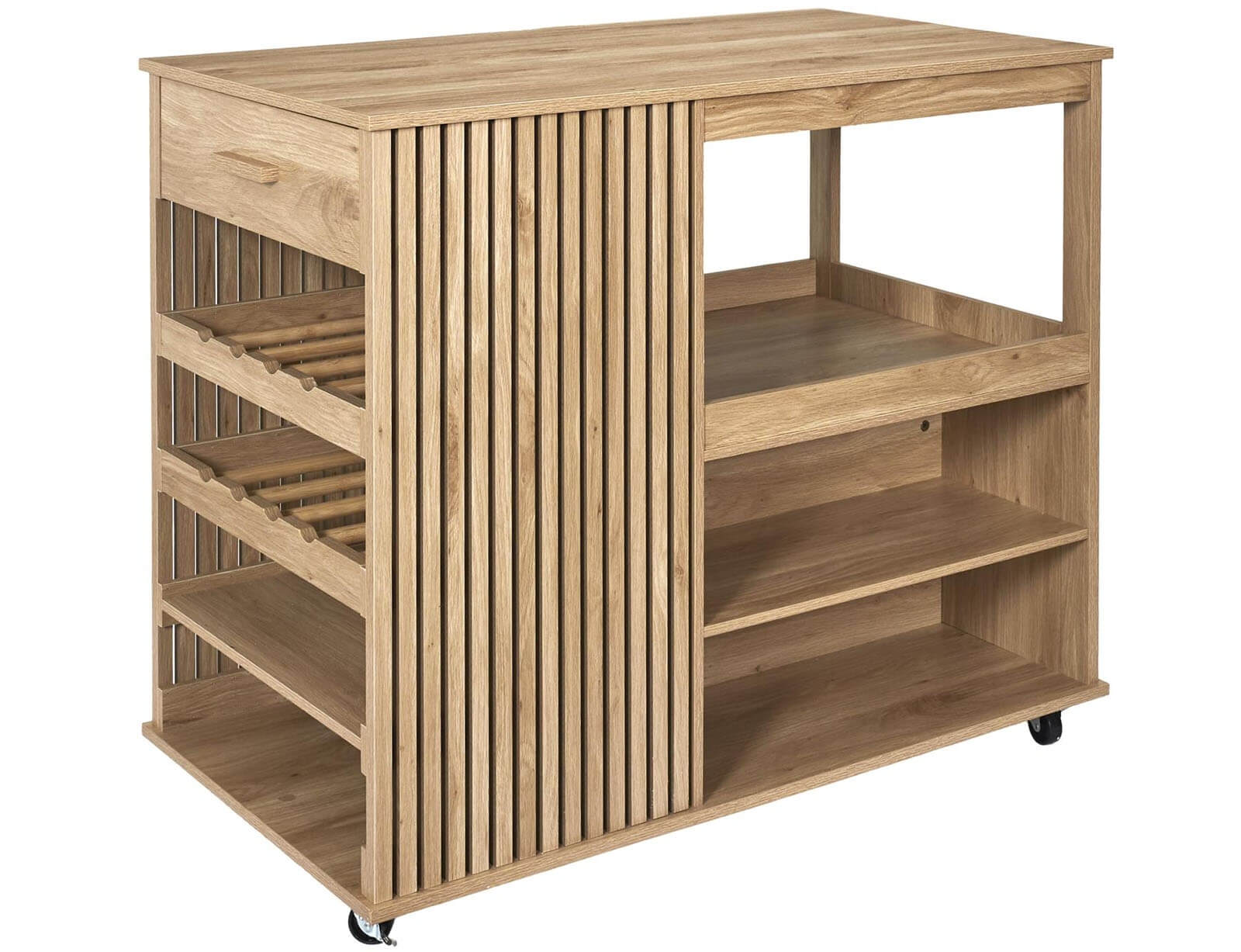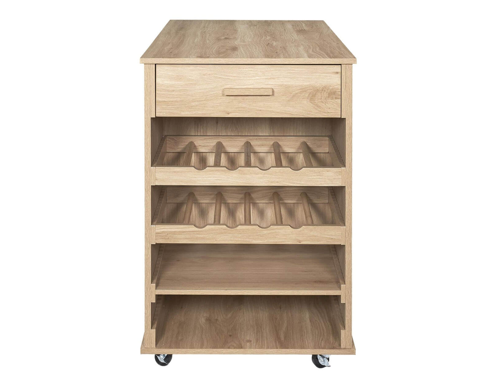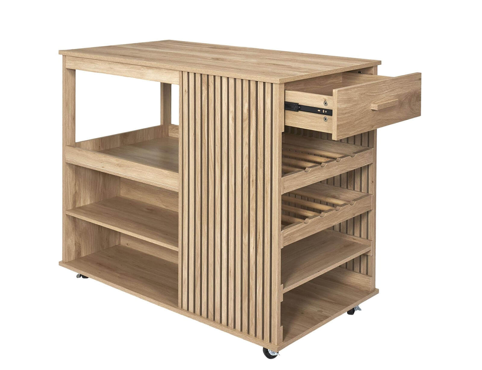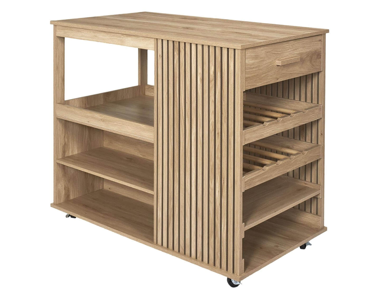 Η νησίδα κουζίνας Klaus από την Home Deco Factory είναι η απόλυτη επιλογή για όσους αναζητούν έναν συνδυασμό λειτουργικότητας, αισθητικής και ευελιξίας. Με τον μοντέρνο σχεδιασμό της και τις πρακτικές της δυνατότητες, μεταμορφώνει τον χώρο της κουζίνας σας σε ένα άνετο, εργονομικό και οργανωμένο περιβάλλον. Κατασκευασμένη από μοριοσανίδα και MDF υψηλής ποιότητας, προσφέρει σταθερότητα και αντοχή στη χρήση, ενώ η λεία επιφάνειά της καθαρίζεται εύκολα, κάνοντάς την ιδανική για καθημερινή χρήση. Χάρη στους τροχούς της, μπορείτε να μετακινείτε τη νησίδα εύκολα όπου τη χρειάζεστε και είναι εξοπλισμένη με ένα συρτάρι για τα καθημερινά σας σκεύη, ανοικτά ράφια για γρήγορη πρόσβαση σε μπολ, πιάτα ή υλικά και ειδικές θέσεις για μπουκάλια, ιδανικές για κρασιά, λάδια ή dressing.