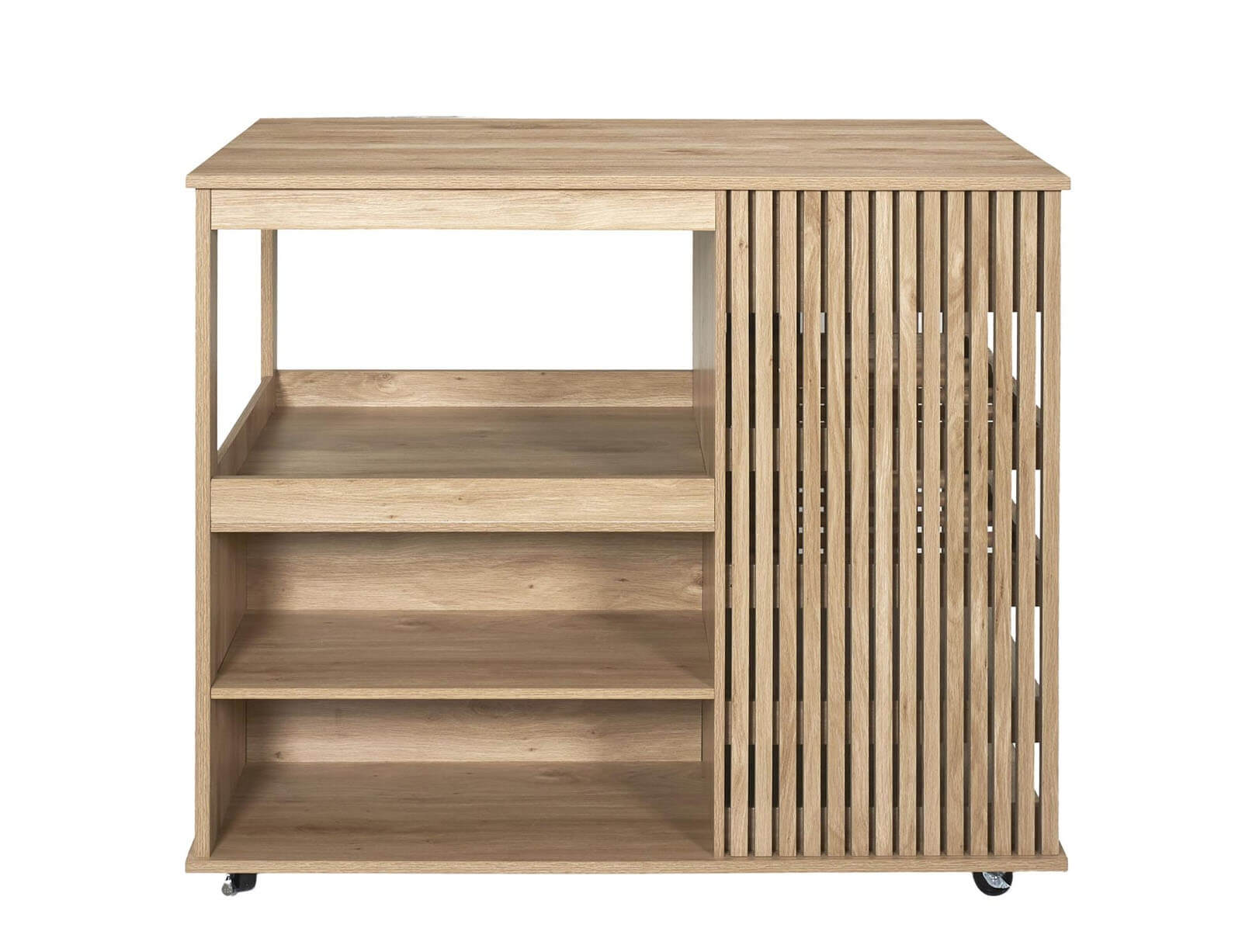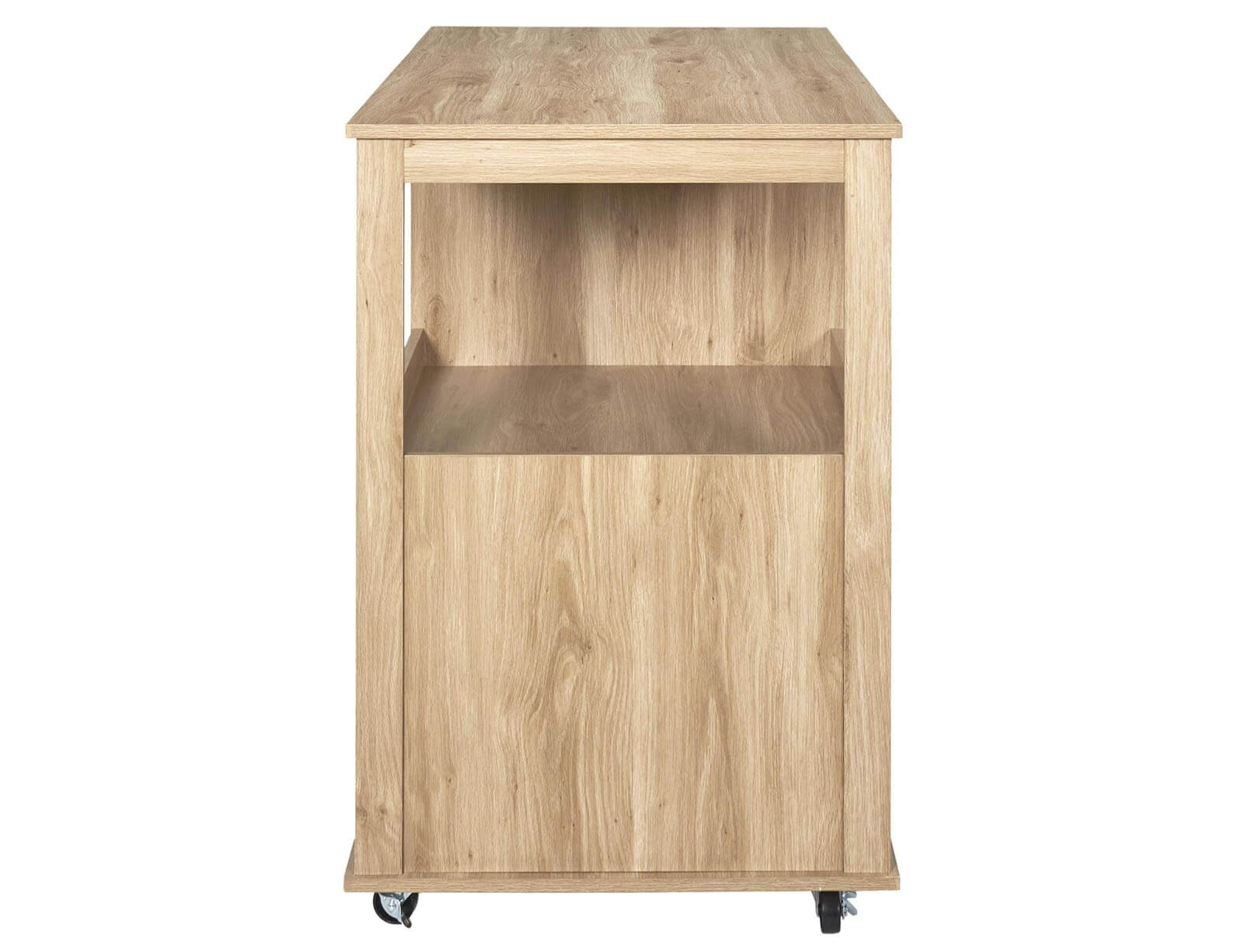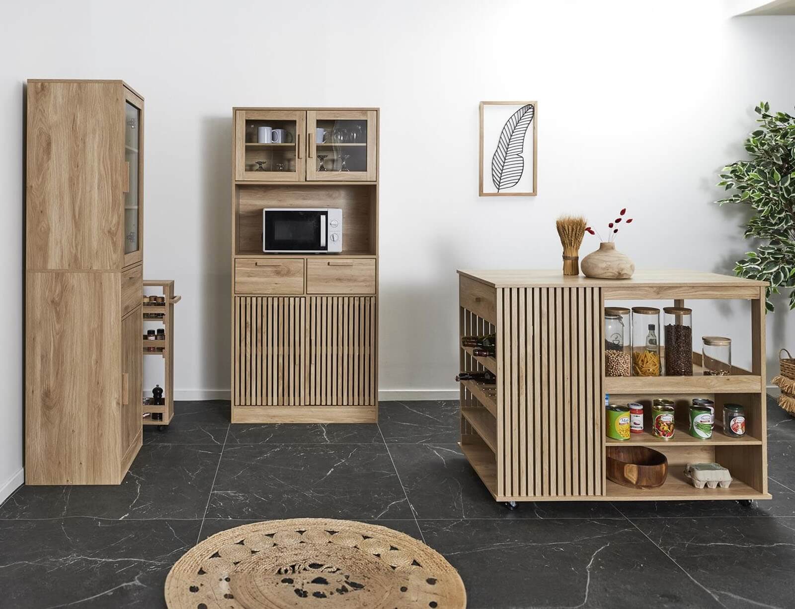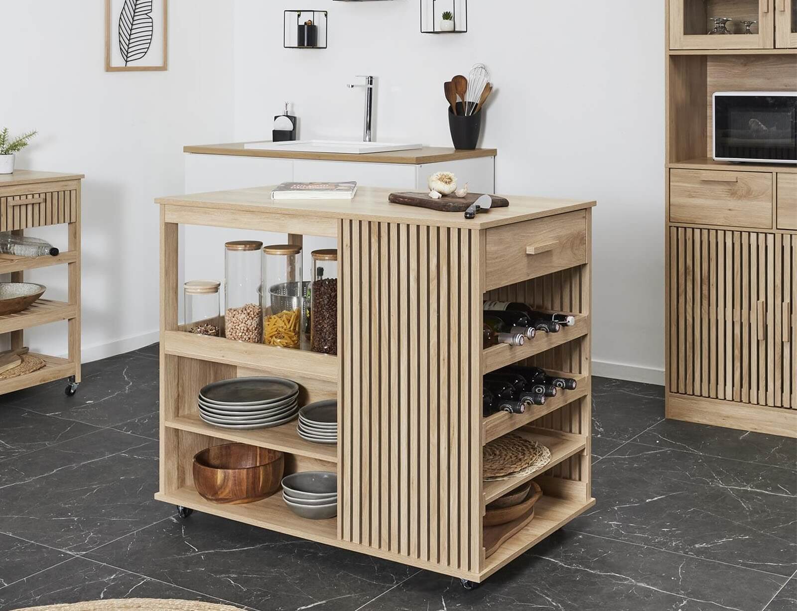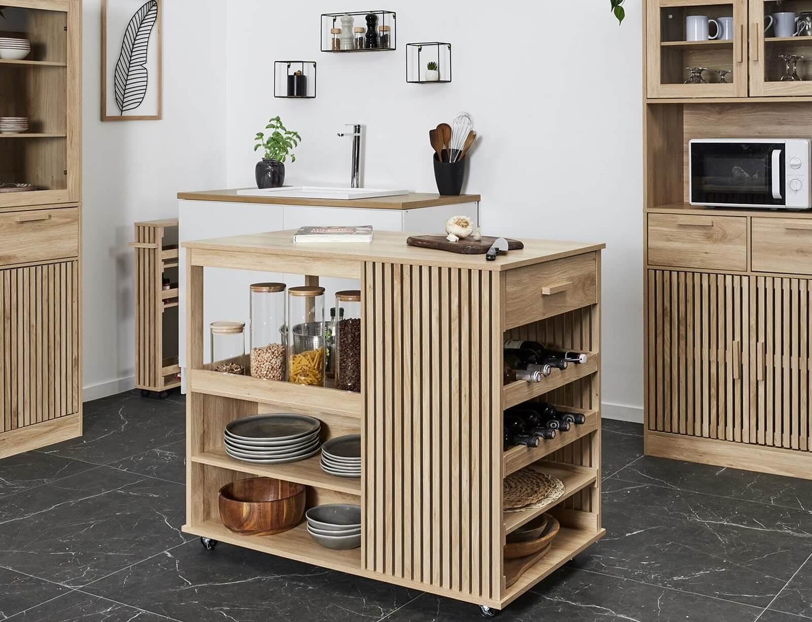 Η νησίδα κουζίνας Klaus από την Home Deco Factory είναι η απόλυτη επιλογή για όσους αναζητούν έναν συνδυασμό λειτουργικότητας, αισθητικής και ευελιξίας. Με τον μοντέρνο σχεδιασμό της και τις πρακτικές της δυνατότητες, μεταμορφώνει τον χώρο της κουζίνας σας σε ένα άνετο, εργονομικό και οργανωμένο περιβάλλον. Κατασκευασμένη από μοριοσανίδα και MDF υψηλής ποιότητας, προσφέρει σταθερότητα και αντοχή στη χρήση, ενώ η λεία επιφάνειά της καθαρίζεται εύκολα, κάνοντάς την ιδανική για καθημερινή χρήση. Χάρη στους τροχούς της, μπορείτε να μετακινείτε τη νησίδα εύκολα όπου τη χρειάζεστε και είναι εξοπλισμένη με ένα συρτάρι για τα καθημερινά σας σκεύη, ανοικτά ράφια για γρήγορη πρόσβαση σε μπολ, πιάτα ή υλικά και ειδικές θέσεις για μπουκάλια, ιδανικές για κρασιά, λάδια ή dressing.
