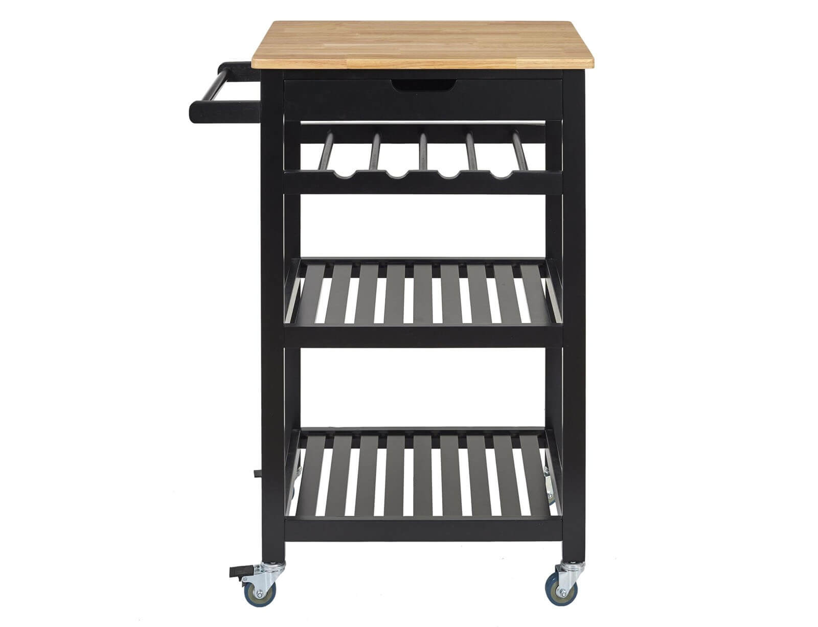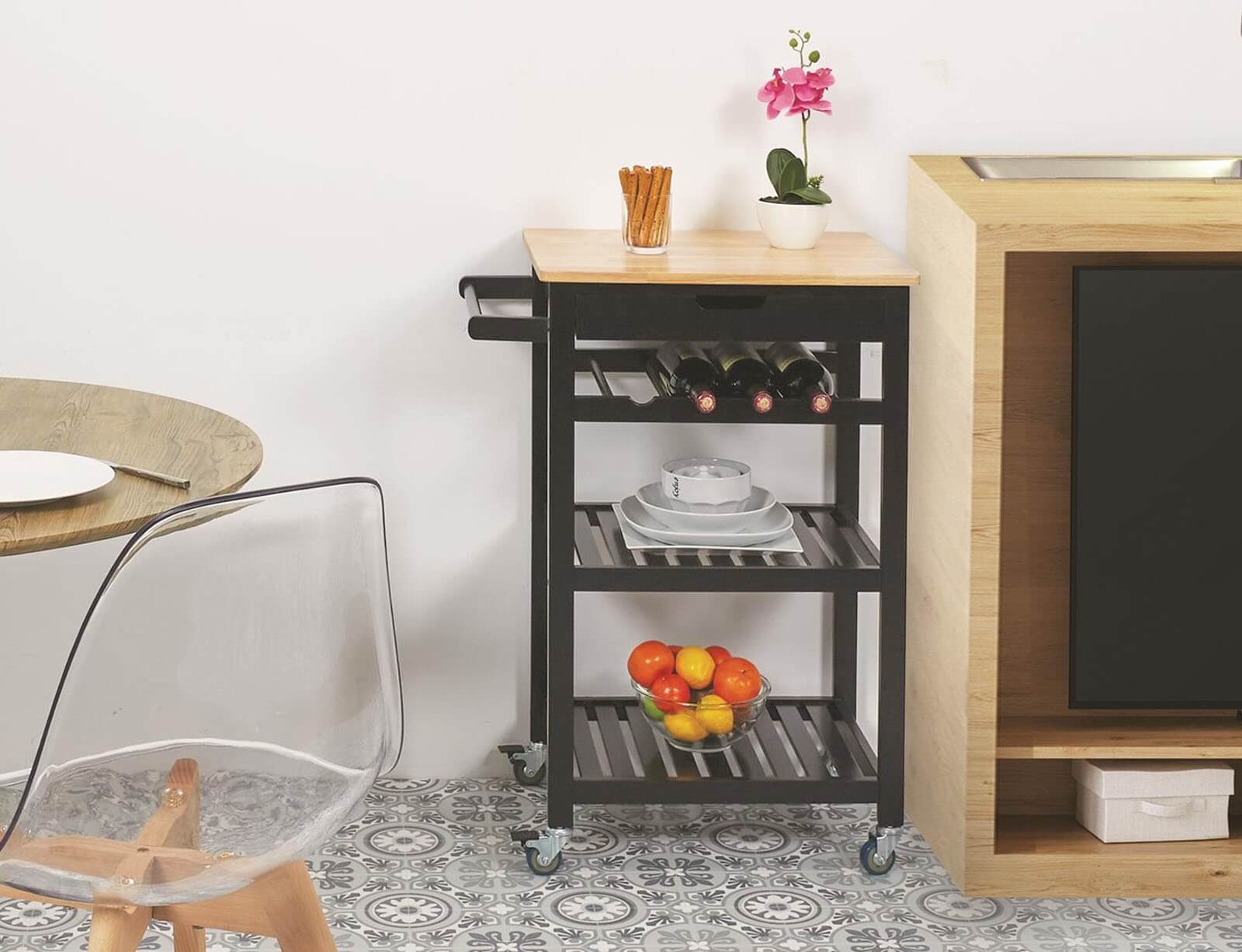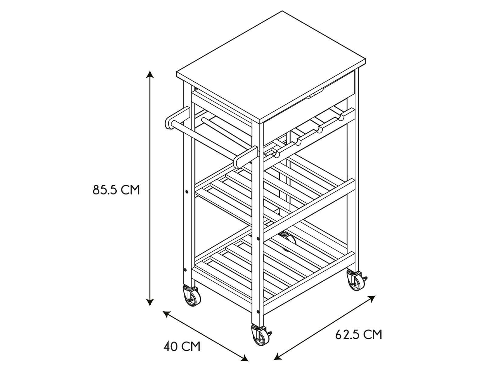 Οργανώστε έξυπνα τον χώρο σας με το πρακτικό και κομψό τρόλεϊ κουζίνας από τη Home Deco Factory. Διαθέτει δύο ευρύχωρα ράφια, θήκη για μπουκάλια, άνετη επιφάνεια εργασίας από ξύλο και πρακτικό συρτάρι για την αποθήκευση μικροαντικειμένων όπως μαχαιροπίρουνα, πετσέτες ή αξεσουάρ μαγειρικής. Οι διαστάσεις του το καθιστούν ιδανικό ακόμη και για μικρές κουζίνες, ενώ οι τέσσερις τροχοί με φρένα προσφέρουν μέγιστη ευκολία στη μετακίνηση και απόλυτη σταθερότητα.