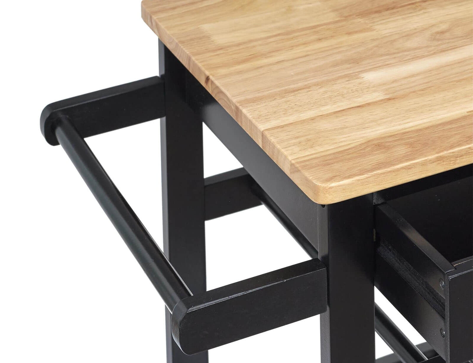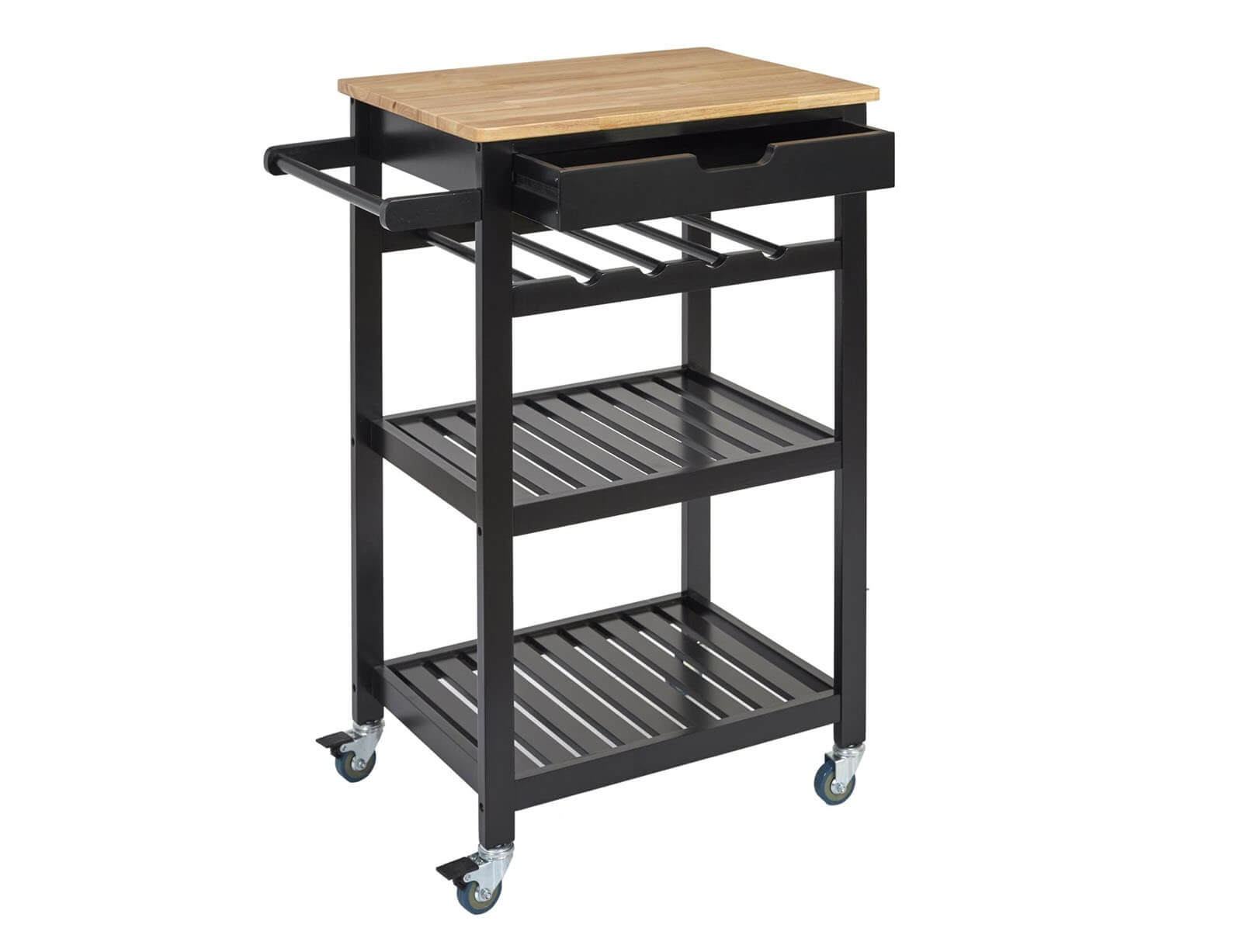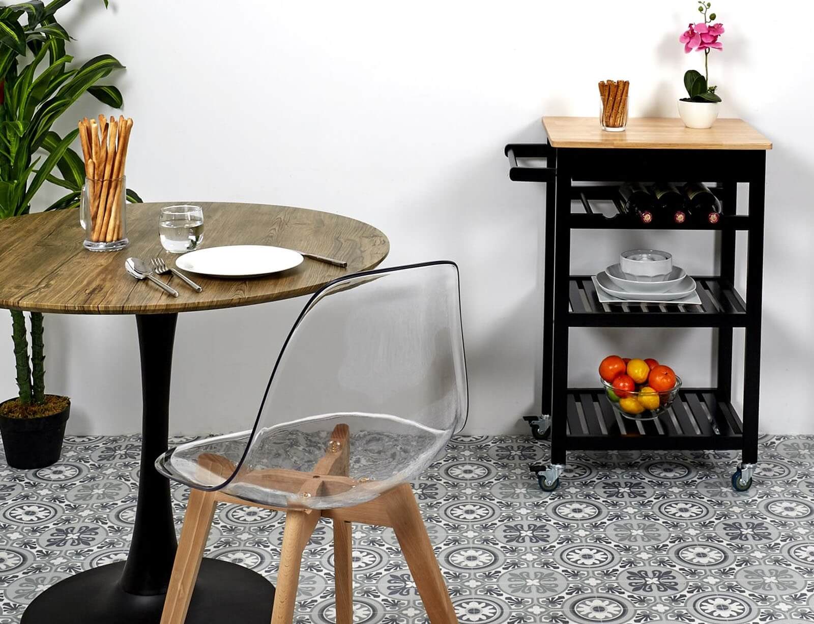 Οργανώστε έξυπνα τον χώρο σας με το πρακτικό και κομψό τρόλεϊ κουζίνας από τη Home Deco Factory. Διαθέτει δύο ευρύχωρα ράφια, θήκη για μπουκάλια, άνετη επιφάνεια εργασίας από ξύλο και πρακτικό συρτάρι για την αποθήκευση μικροαντικειμένων όπως μαχαιροπίρουνα, πετσέτες ή αξεσουάρ μαγειρικής. Οι διαστάσεις του το καθιστούν ιδανικό ακόμη και για μικρές κουζίνες, ενώ οι τέσσερις τροχοί με φρένα προσφέρουν μέγιστη ευκολία στη μετακίνηση και απόλυτη σταθερότητα.