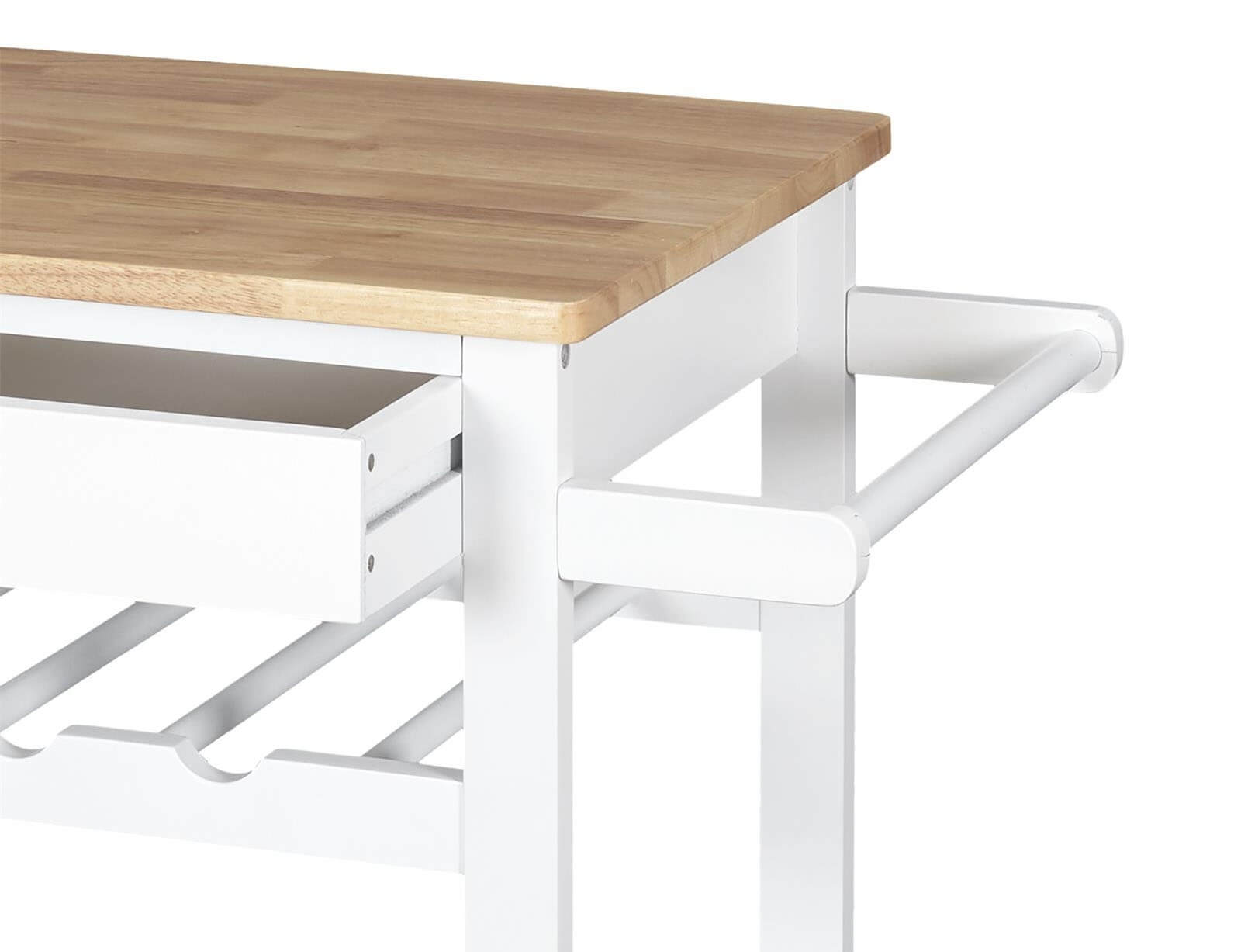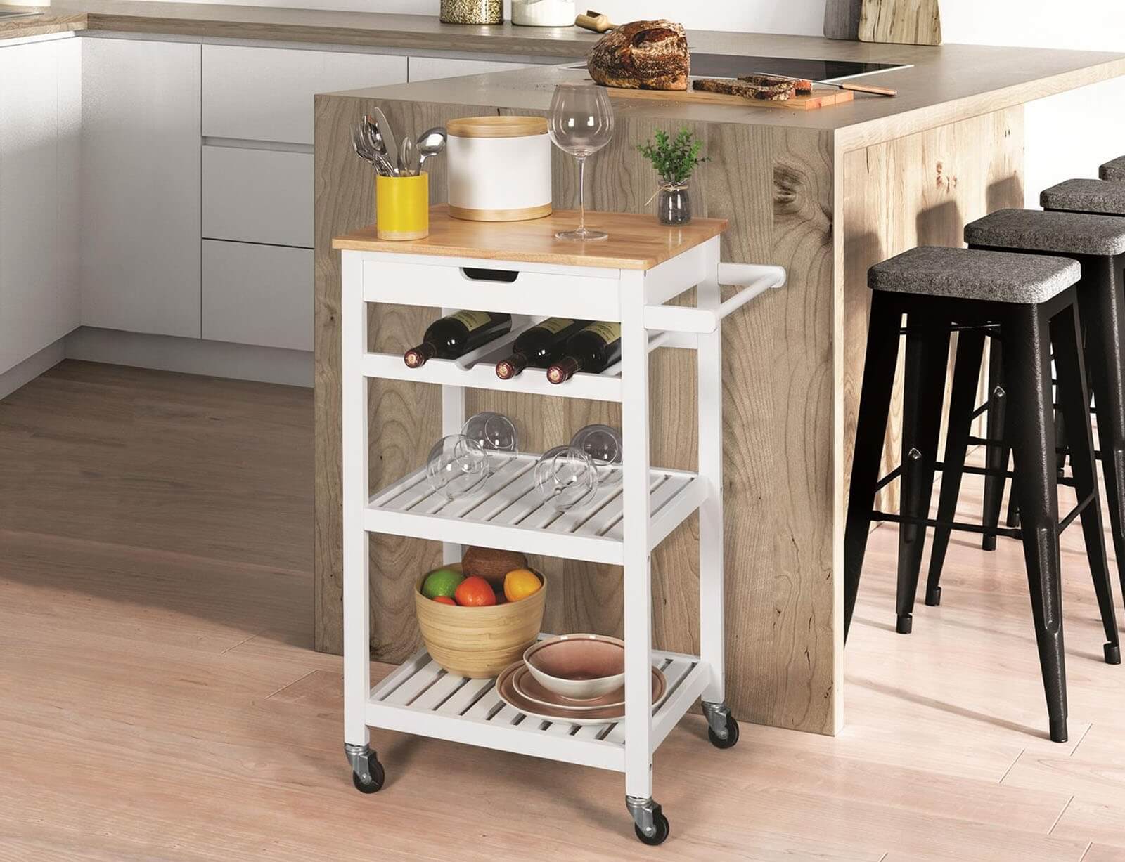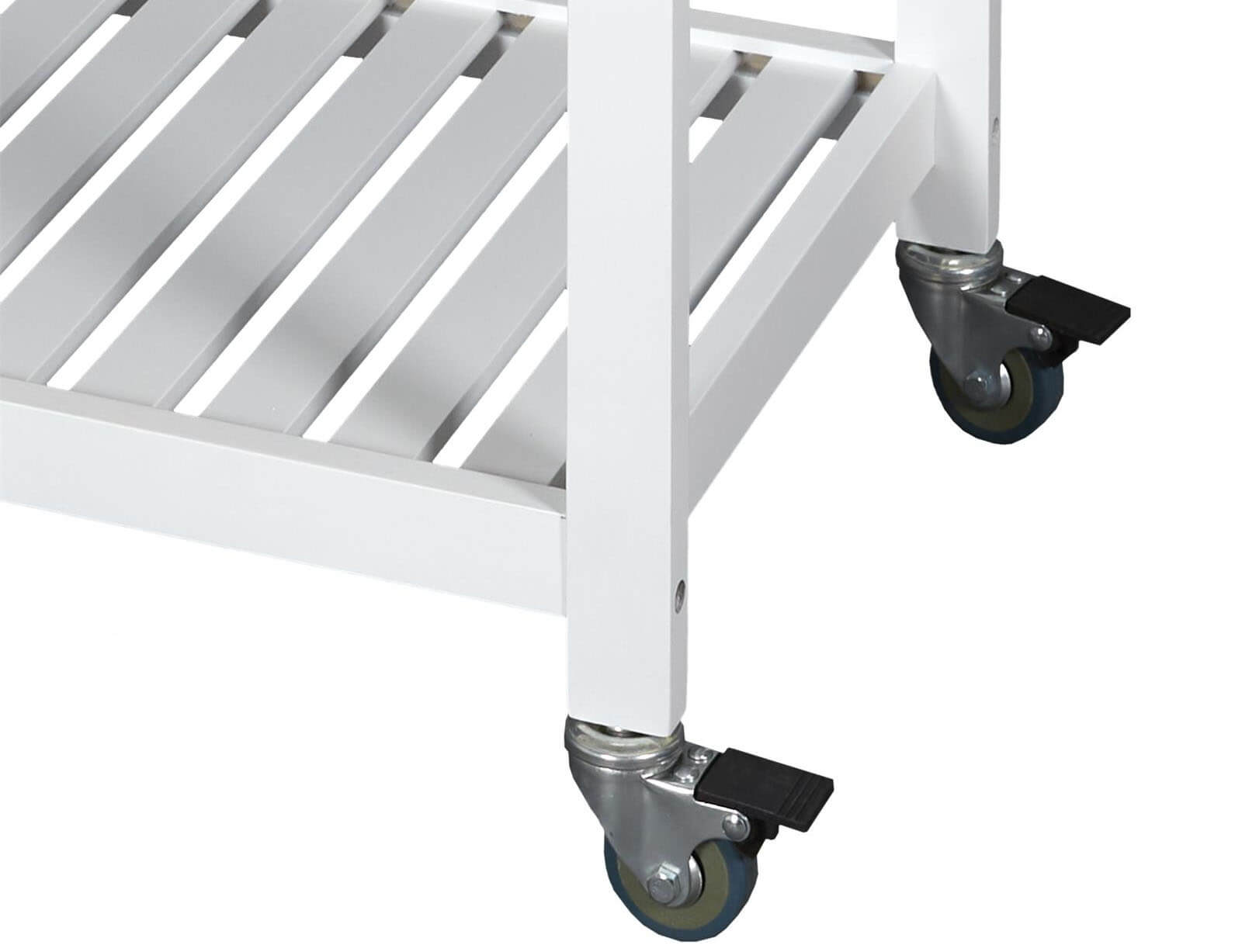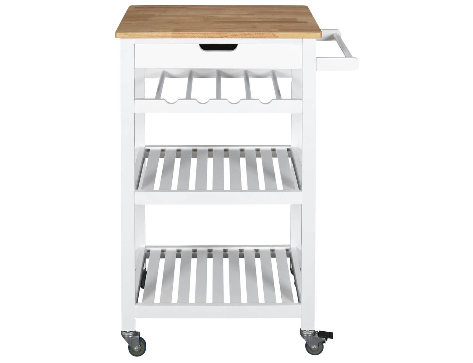 Οργανώστε έξυπνα τον χώρο σας με το πρακτικό και κομψό τρόλεϊ κουζίνας από τη Home Deco Factory. Διαθέτει δύο ευρύχωρα ράφια, θήκη για μπουκάλια, άνετη επιφάνεια εργασίας από ξύλο και πρακτικό συρτάρι για την αποθήκευση μικροαντικειμένων όπως μαχαιροπίρουνα, πετσέτες ή αξεσουάρ μαγειρικής. Οι διαστάσεις του το καθιστούν ιδανικό ακόμη και για μικρές κουζίνες, ενώ οι τέσσερις τροχοί με φρένα προσφέρουν μέγιστη ευκολία στη μετακίνηση και απόλυτη σταθερότητα.