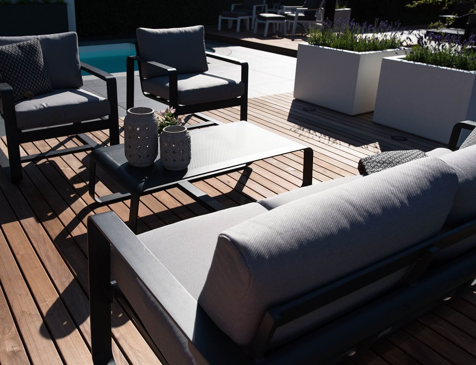 Τα μαξιλάρια καθίσματος και πλάτης είναι φτιαγμένα από ίνες ολεφίνης 270gr/m², ένα υλικό με προδιαγραφές όπως αδιαβροχοποίηση, xρωματοανθεκτικότητα στο φως, και την υπεριώδη ακτινοβολία (UV 97%), με μεγάλη αντοχή στην τριβή και 100% αντιβακτηριακή προστασία, στο χλωριωμένο νερό της πισίνας, απωθητικότητα στο χώμα και τους λεκέδες, αντίσταση από υγρασίες και μούχλα.
