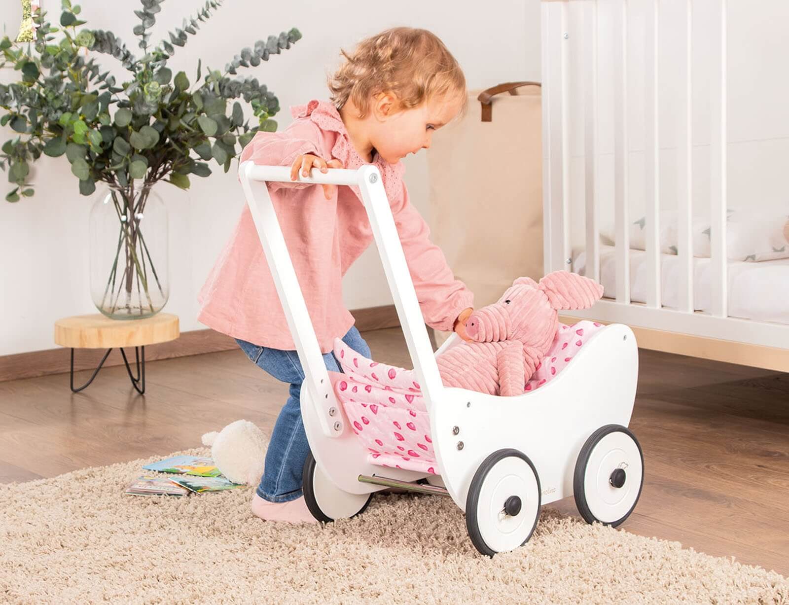 Το ξύλινο καρότσι για κούκλες Trixi Pinolino είναι η ιδανική επιλογή για τα πρώτα βήματα του παιδιού σας, προσφέροντας ασφάλεια και διασκέδαση. Ιδανικό για να μεταφέρουν τις αγαπημένες τους κούκλες και λούτρινα, ενθαρρύνει το δημιουργικό παιχνίδι και τη φαντασία. Περιλαμβάνει και πάπλωμα Herzchen σε ροζ απόχρωση. Με κομψό σχεδιασμό σε λευκό χρώμα και στιβαρή ξύλινη κατασκευή, αυτό το καρότσι θα γίνει ο αγαπημένος σύντροφος παιχνιδιού των μικρών σας. Χάρη στο ενσωματωμένο σύστημα φρένων, εξασφαλίζει σταθερότητα και ελεγχόμενη κίνηση, βοηθώντας τα παιδιά να αναπτύξουν τις κινητικές τους δεξιότητες με ασφάλεια. Οι άνετες διαστάσεις του το καθιστούν εύχρηστο και κατάλληλο για παιδιά 1 έτους και άνω.