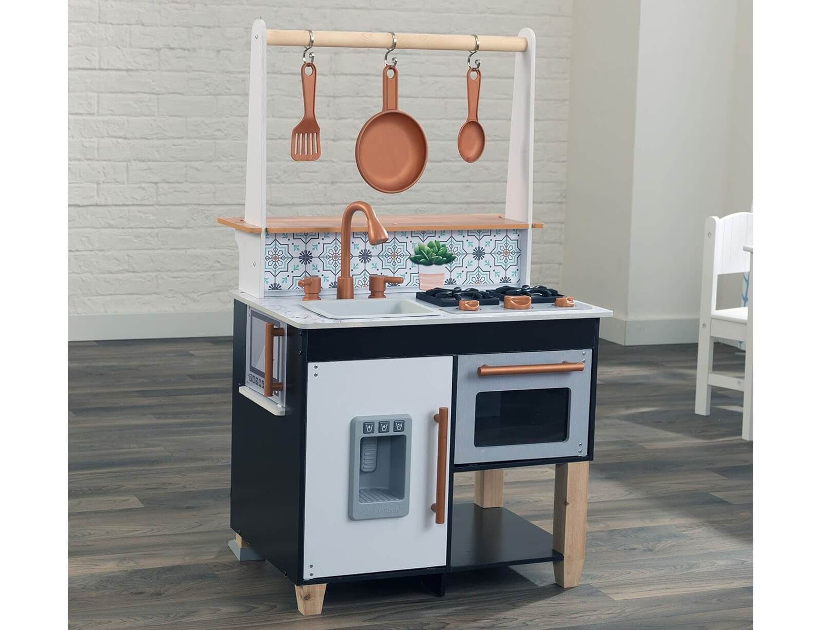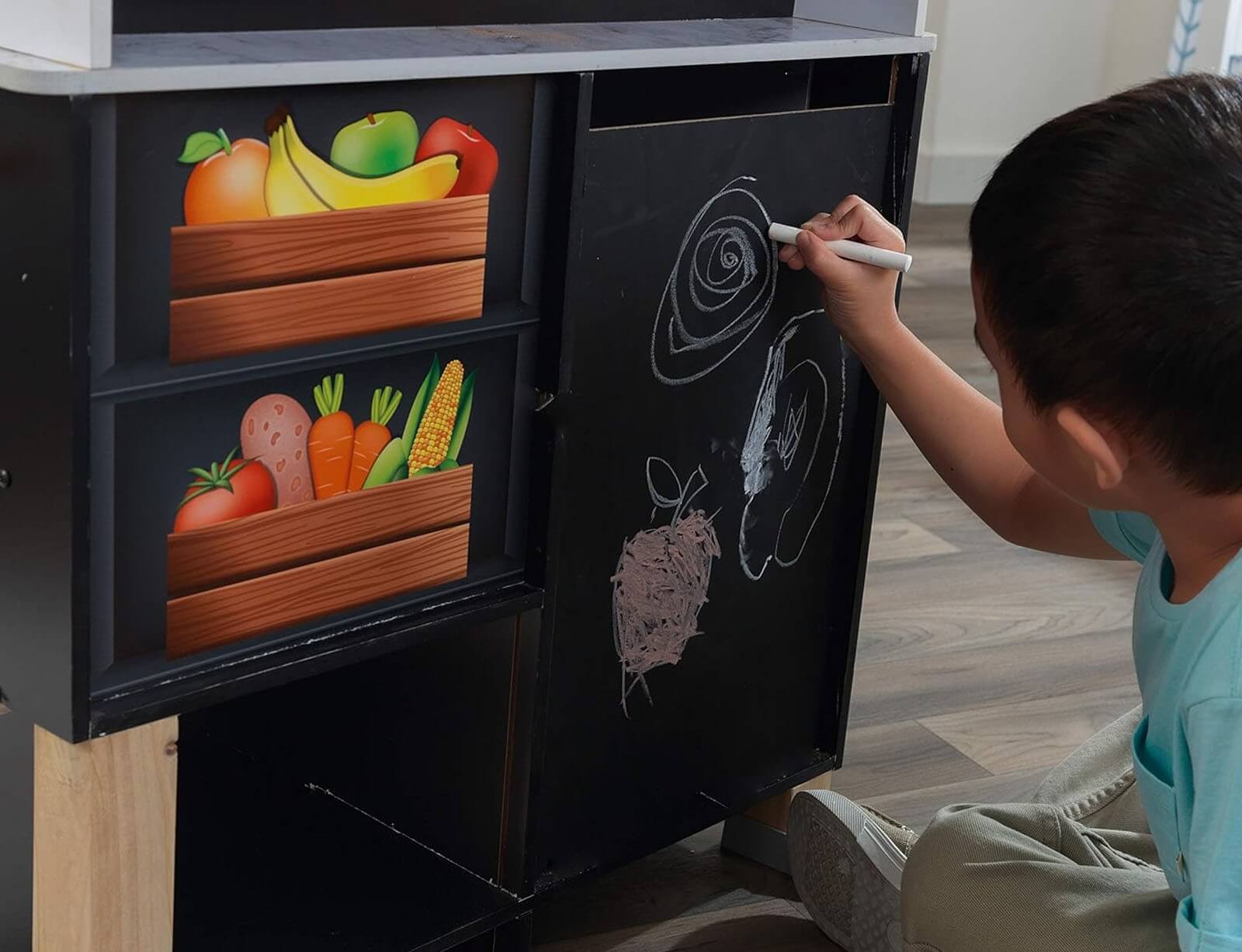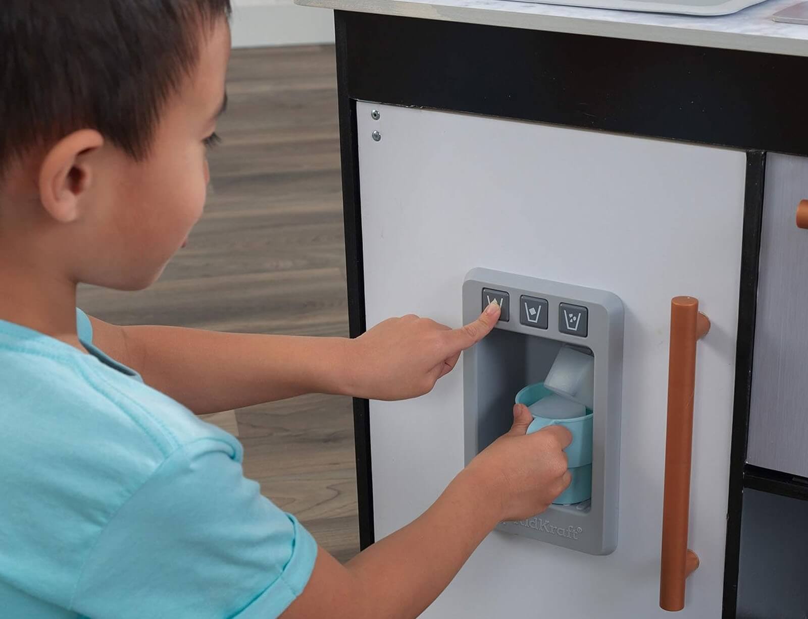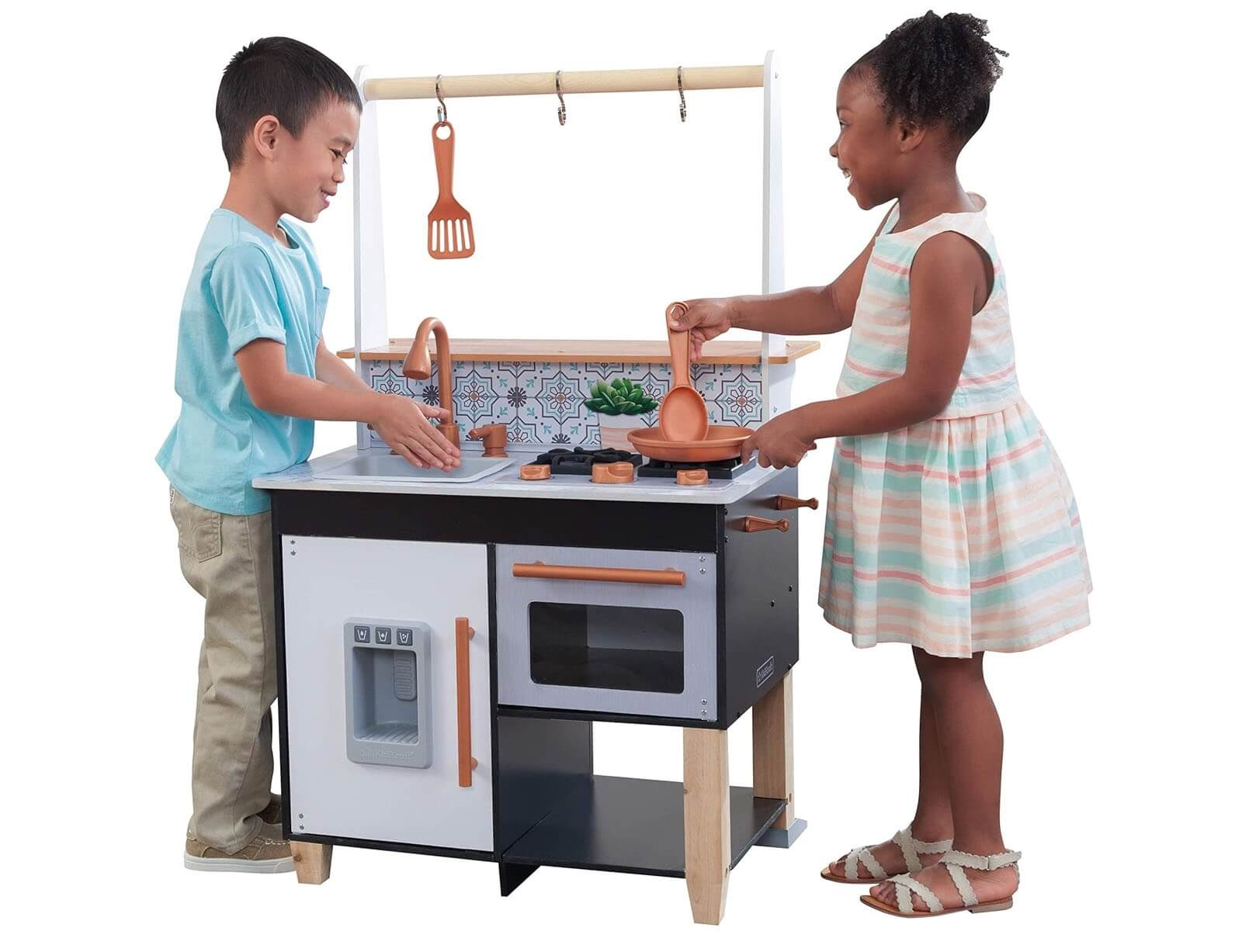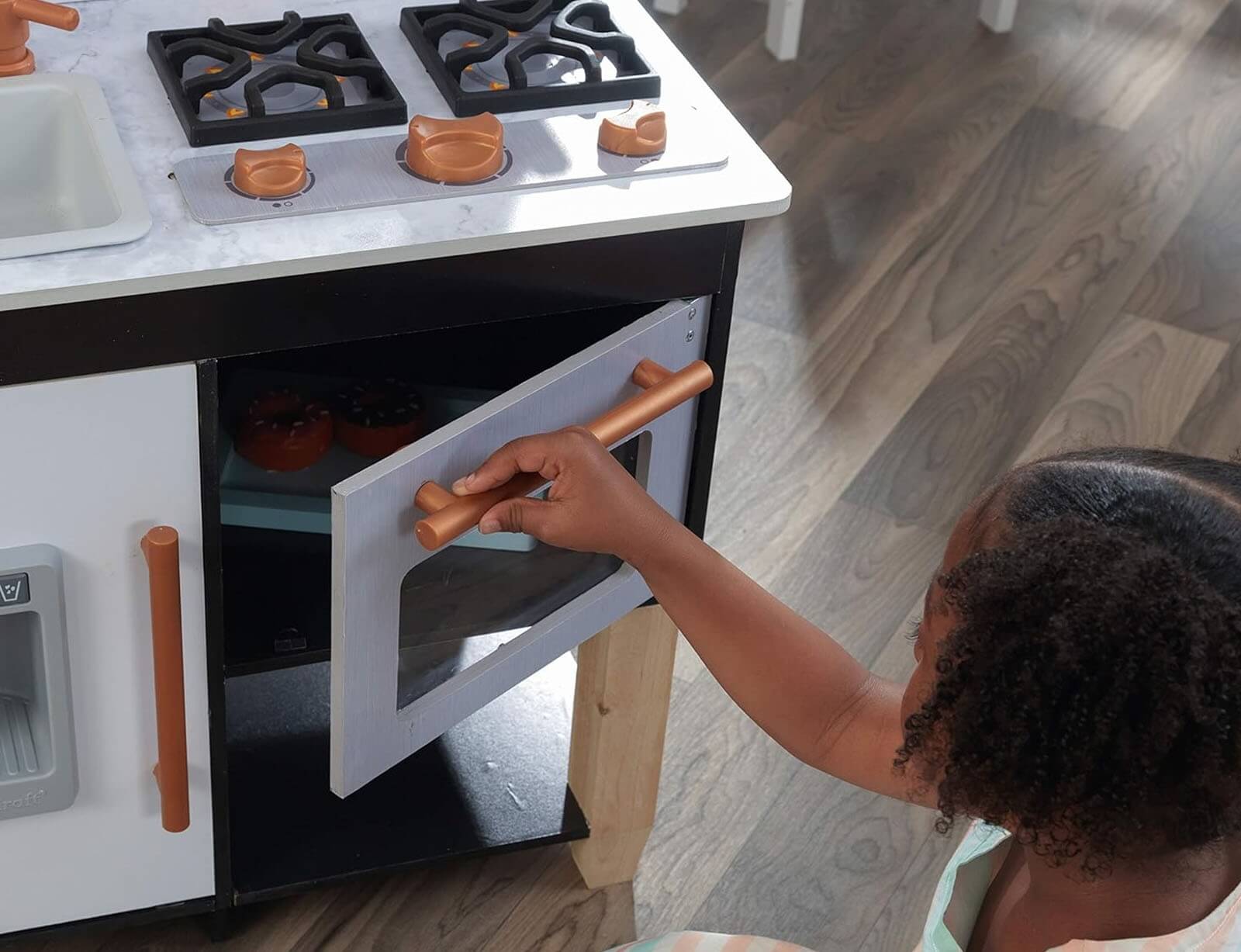 Η κουζίνα Artisan Kitchen Island από την KidKraft είναι ιδανική για μικρούς σεφ που αγαπούν να παίζουν ρόλους και να εξυπηρετούν επισκέπτες με τα φαγητά τους, ενώ αναπτύσσουν πολύτιμες δεξιότητες κοινωνικοποίησης και συνεργασίας. Τα παιδιά μπορούν να παρατηρήσουν το ένα το άλλο, να μάθουν πώς να προσεγγίζουν τα τρόφιμα, να τα προετοιμάζουν και να τα σερβίρουν! Αυτή η κουζίνα είναι φτιαγμένη από υψηλής ποιότητας ξύλο και διαθέτει σταθερή κατασκευή, για ατελείωτες ώρες δημιουργικού παιχνιδιού. Με τον ρεαλιστικό σχεδιασμό της, περιλαμβάνει λειτουργικές πόρτες ψυγείου και φούρνου (μικροκυμάτων και κλασικού), που ανοίγουν και κλείνουν με φυσικό τρόπο, καθώς και κρεμαστάρια στο πλάι για τα αξεσουάρ κουζίνας. Ο αποθηκευτικός χώρος κάτω από τον φούρνο επιτρέπει την τακτοποίηση των σκευών και αξεσουάρ μαγειρικής. Οι μαύρες επιφάνειες είναι καλυμμένες με μπογιά μαυροπίνακα, πάνω στην οποία μπορεί να γράψει το μικρό σας! Τα τηγανάκια, το κουτάλι, η σπάτουλα μαγειρέματος και οι πετσέτες κουζίνας μπορούν να κρεμαστούν στο επάνω ή στα πλαϊνά άγκιστρα. Κατσαρόλες και οποιαδήποτε μεγαλύτερα πιάτα μπορούν να αποθηκευτούν στο ράφι κάτω από το φούρνο. Χάρη στην τεχνολογία EZ Kraft Assembly™, η συναρμολόγηση γίνεται γρήγορα και εύκολα, αφήνοντας περισσότερο χρόνο για διασκέδαση!