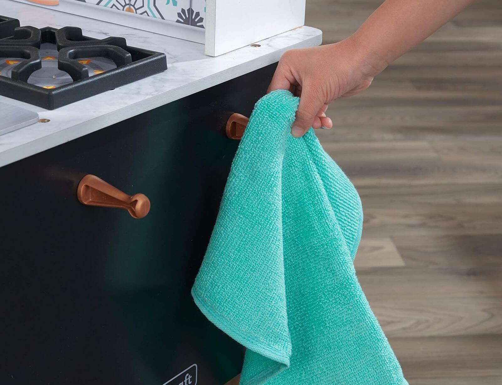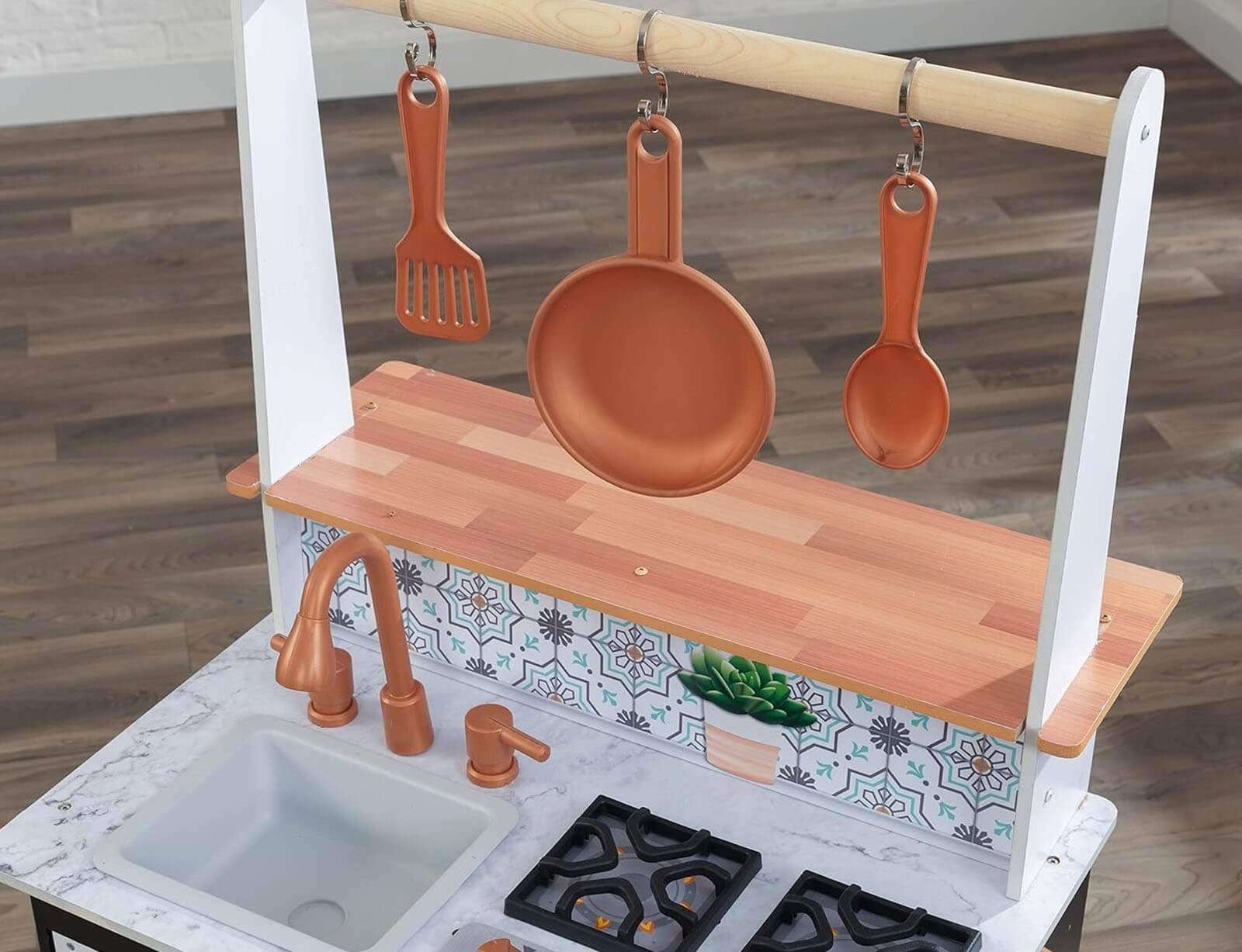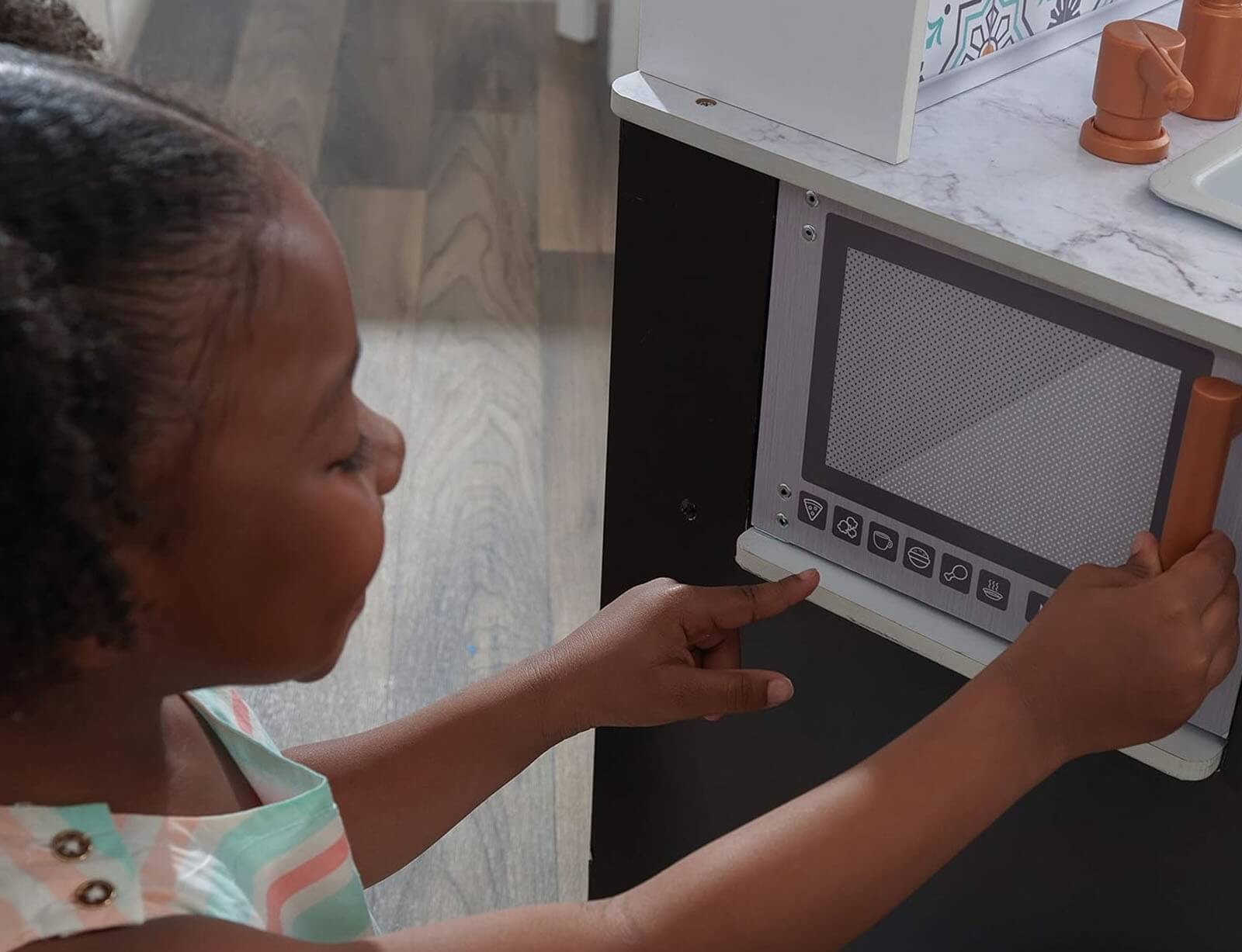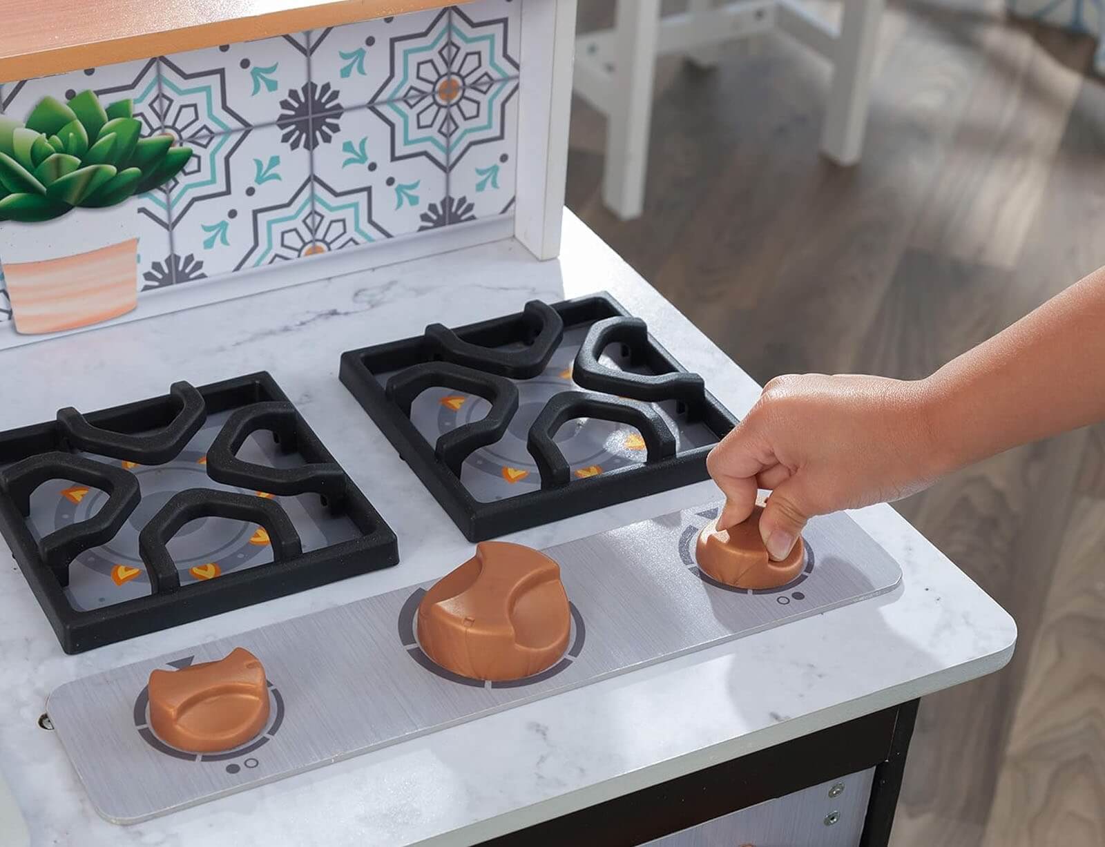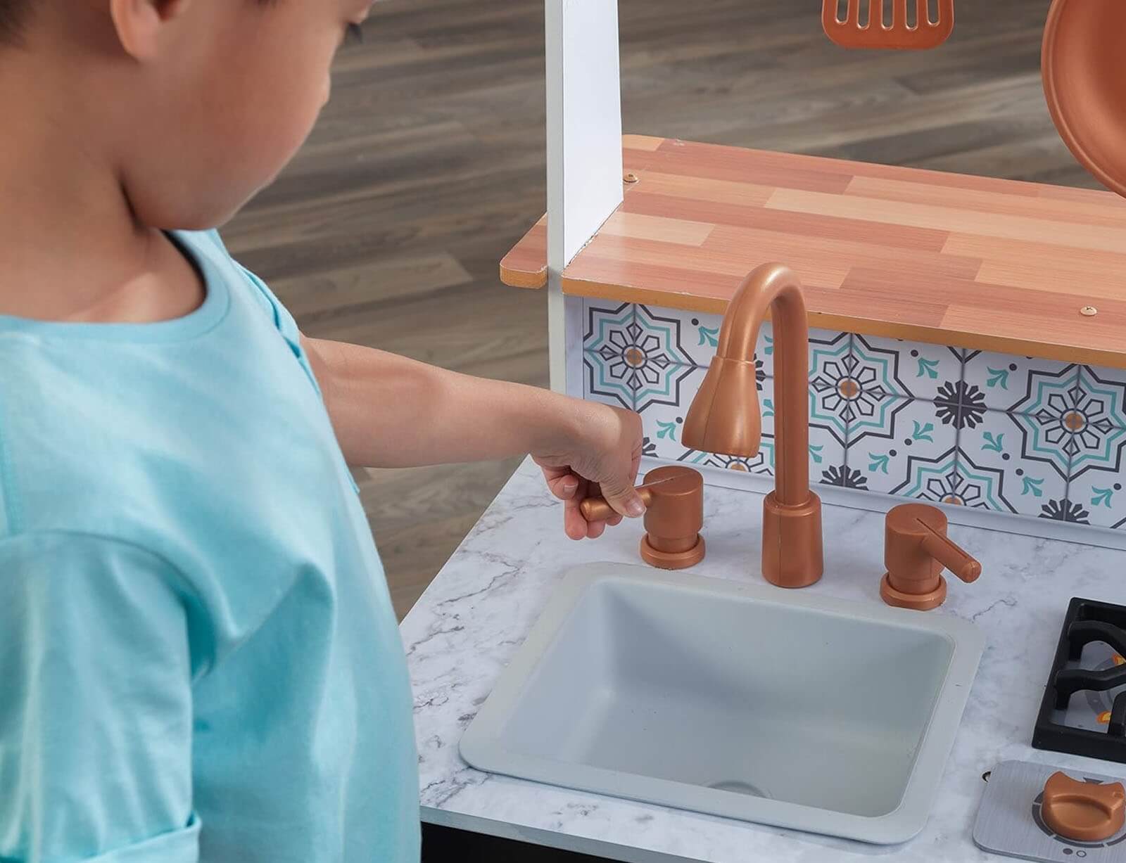 Η κουζίνα Artisan Kitchen Island από την KidKraft είναι ιδανική για μικρούς σεφ που αγαπούν να παίζουν ρόλους και να εξυπηρετούν επισκέπτες με τα φαγητά τους, ενώ αναπτύσσουν πολύτιμες δεξιότητες κοινωνικοποίησης και συνεργασίας. Τα παιδιά μπορούν να παρατηρήσουν το ένα το άλλο, να μάθουν πώς να προσεγγίζουν τα τρόφιμα, να τα προετοιμάζουν και να τα σερβίρουν! Αυτή η κουζίνα είναι φτιαγμένη από υψηλής ποιότητας ξύλο και διαθέτει σταθερή κατασκευή, για ατελείωτες ώρες δημιουργικού παιχνιδιού. Με τον ρεαλιστικό σχεδιασμό της, περιλαμβάνει λειτουργικές πόρτες ψυγείου και φούρνου (μικροκυμάτων και κλασικού), που ανοίγουν και κλείνουν με φυσικό τρόπο, καθώς και κρεμαστάρια στο πλάι για τα αξεσουάρ κουζίνας. Ο αποθηκευτικός χώρος κάτω από τον φούρνο επιτρέπει την τακτοποίηση των σκευών και αξεσουάρ μαγειρικής. Οι μαύρες επιφάνειες είναι καλυμμένες με μπογιά μαυροπίνακα, πάνω στην οποία μπορεί να γράψει το μικρό σας! Τα τηγανάκια, το κουτάλι, η σπάτουλα μαγειρέματος και οι πετσέτες κουζίνας μπορούν να κρεμαστούν στο επάνω ή στα πλαϊνά άγκιστρα. Κατσαρόλες και οποιαδήποτε μεγαλύτερα πιάτα μπορούν να αποθηκευτούν στο ράφι κάτω από το φούρνο. Χάρη στην τεχνολογία EZ Kraft Assembly™, η συναρμολόγηση γίνεται γρήγορα και εύκολα, αφήνοντας περισσότερο χρόνο για διασκέδαση!