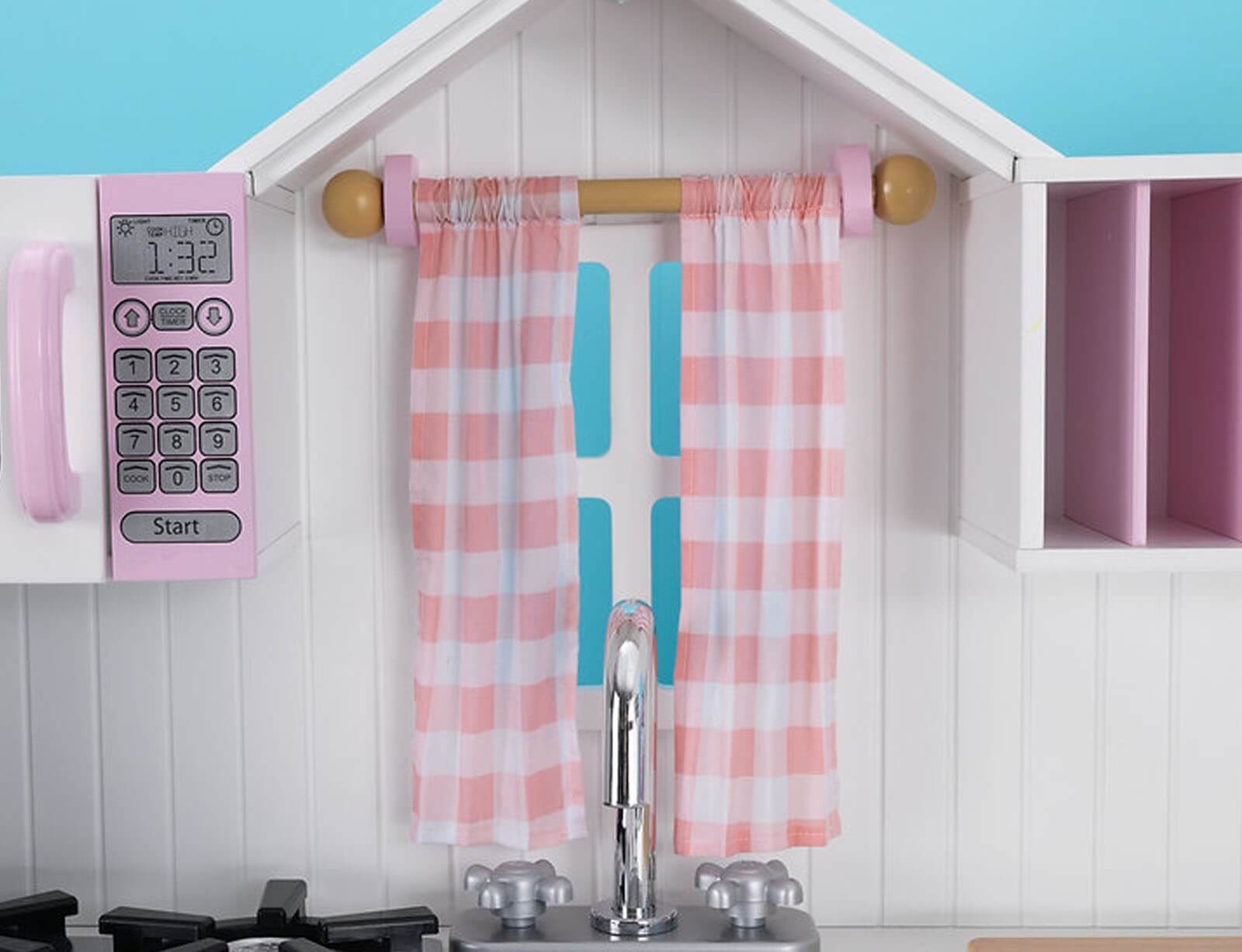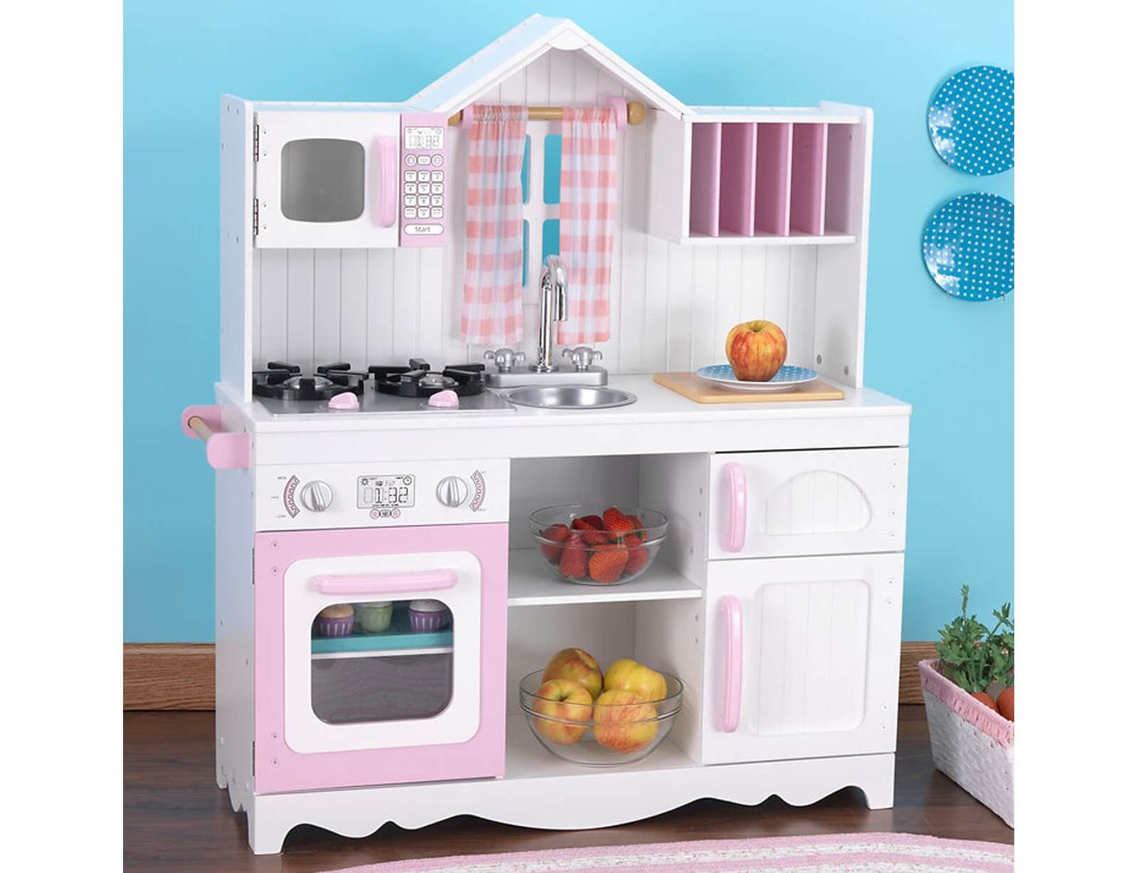 Η κουζίνα Modern Country από την KidKraft είναι η ιδανική κουζίνα για μικρούς σεφ που θέλουν να ανακαλύψουν τη χαρά της μαγειρικής και του παιχνιδιού! Το μοντέρνο σχέδιο με country αίσθηση συνδυάζει την κομψότητα με την πρακτικότητα, κάνοντάς την ιδανική για κάθε παιδικό δωμάτιο ή playroom. Η κουζίνα διαθέτει φούρνο και φούρνο μικροκυμάτων με λειτουργικές πόρτες που ανοίγουν και κλείνουν για ρεαλιστικό παιχνίδι. Η εστία κουζίνας με κουμπιά που γυρίζουν και κάνουν κλικ προσφέρει μια αληθοφανή εμπειρία μαγειρικής, ενώ η κουρτίνα από ύφασμα πάνω από το νεροχύτη δίνει μια ζεστή και φιλόξενη αίσθηση στον χώρο. Ο πάγκος εργασίας και η ξύλινη βάση παρέχουν άφθονο χώρο για τα παιχνίδια και τις δημιουργίες του παιδιού, ενώ οι δύο ντουλάπια αποθήκευσης που ανοίγουν και κλείνουν εξασφαλίζουν εύκολη και πρακτική οργάνωση. Η κουζίνα διαθέτει 7 επιπλέον αποθηκευτικούς χώρους, ιδανικούς για να αποθηκεύει το παιδί όλα τα μικρά αξεσουάρ μαγειρικής του, ενώ η κρεμάστρα για ρολό κουζίνας προσφέρει ακόμη περισσότερη λειτουργικότητα. Ο αφαιρούμενος νεροχύτης επιτρέπει εύκολο καθάρισμα, κάνοντάς την κουζίνα ακόμα πιο πρακτική και εύκολη στη συντήρηση.