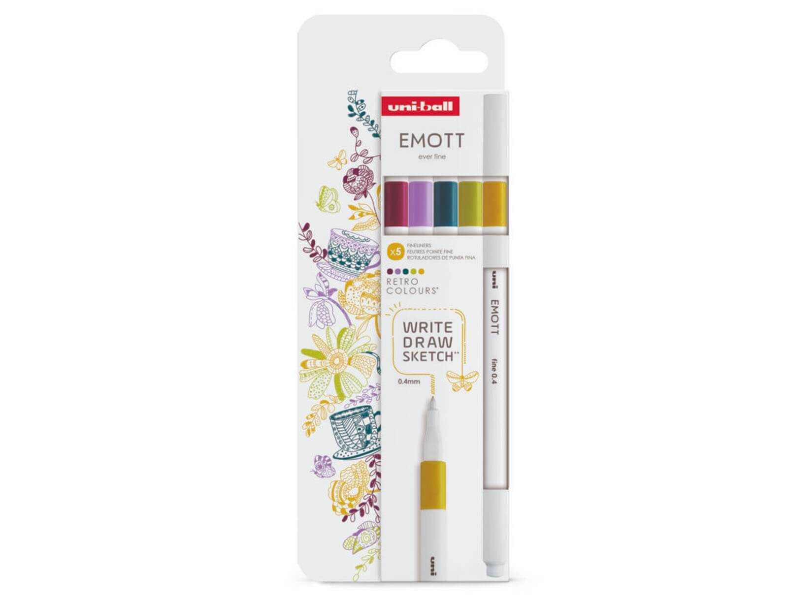 Ταξιδέψτε πίσω στο στυλ με το σετ Uni-Ball Emott Retro Colours, που συνδυάζει κομψότητα με σύγχρονη ακρίβεια. Οι 5 ρετρό αποχρώσεις φέρνουν vintage αίσθηση σε κάθε δημιουργία, ιδανικές για γραφιστική με χαρακτήρα, ρετρό σημειώσεις και σχεδιασμό με ταυτότητα. Το σετ προσφέρει εξαιρετική ποιότητα γραφής με ακρίβεια 0,4mm και ανθεκτικό μελάνι που δεν ξεθωριάζει. Ο εργονομικός τετράγωνος σχεδιασμός αποτρέπει την κύλιση, ενώ το μοντέρνο λευκό σώμα προσθέτει μια κομψή αισθητική στο γραφείο ή το δημιουργικό σας περιβάλλον.