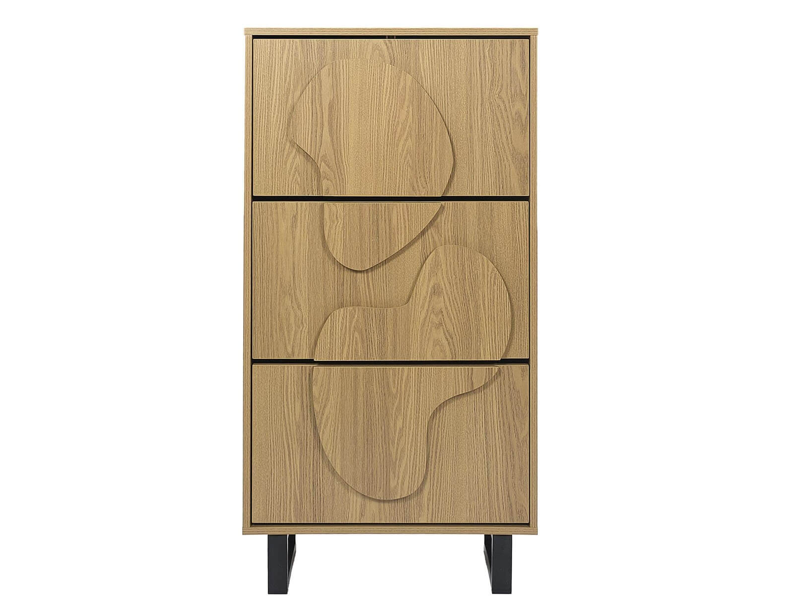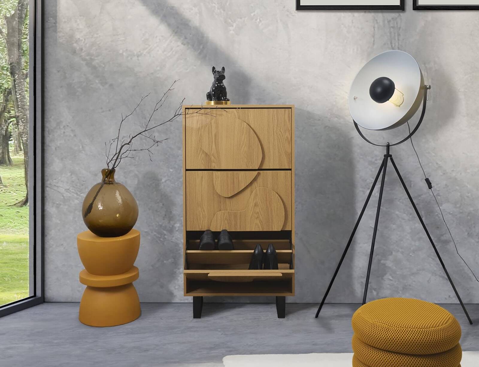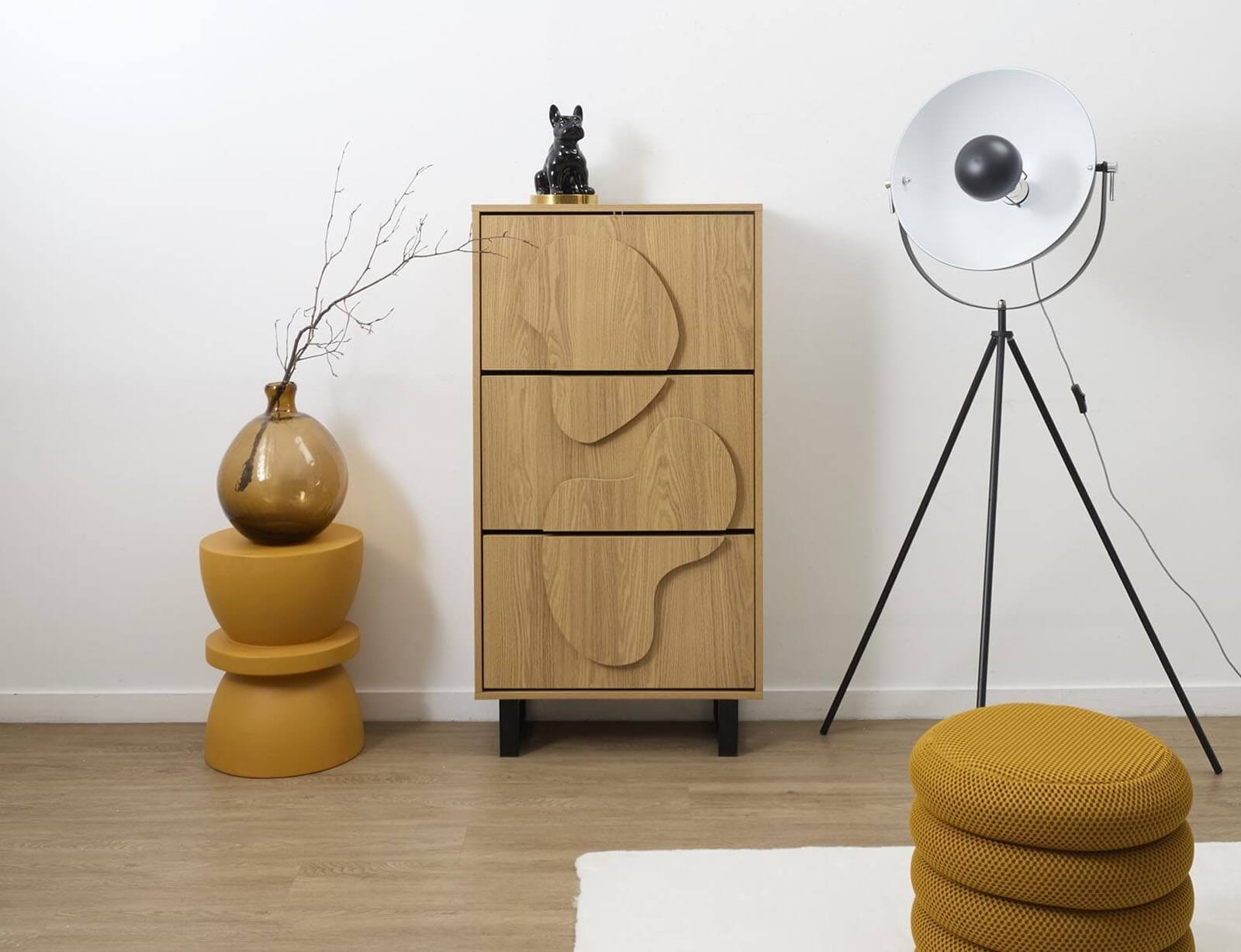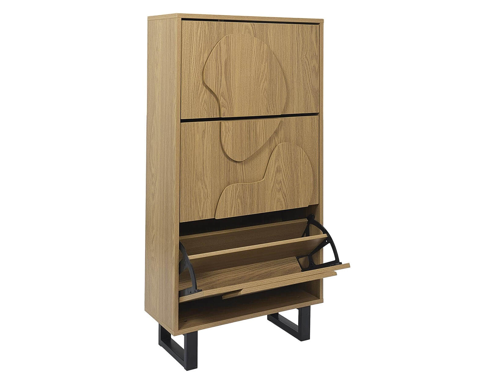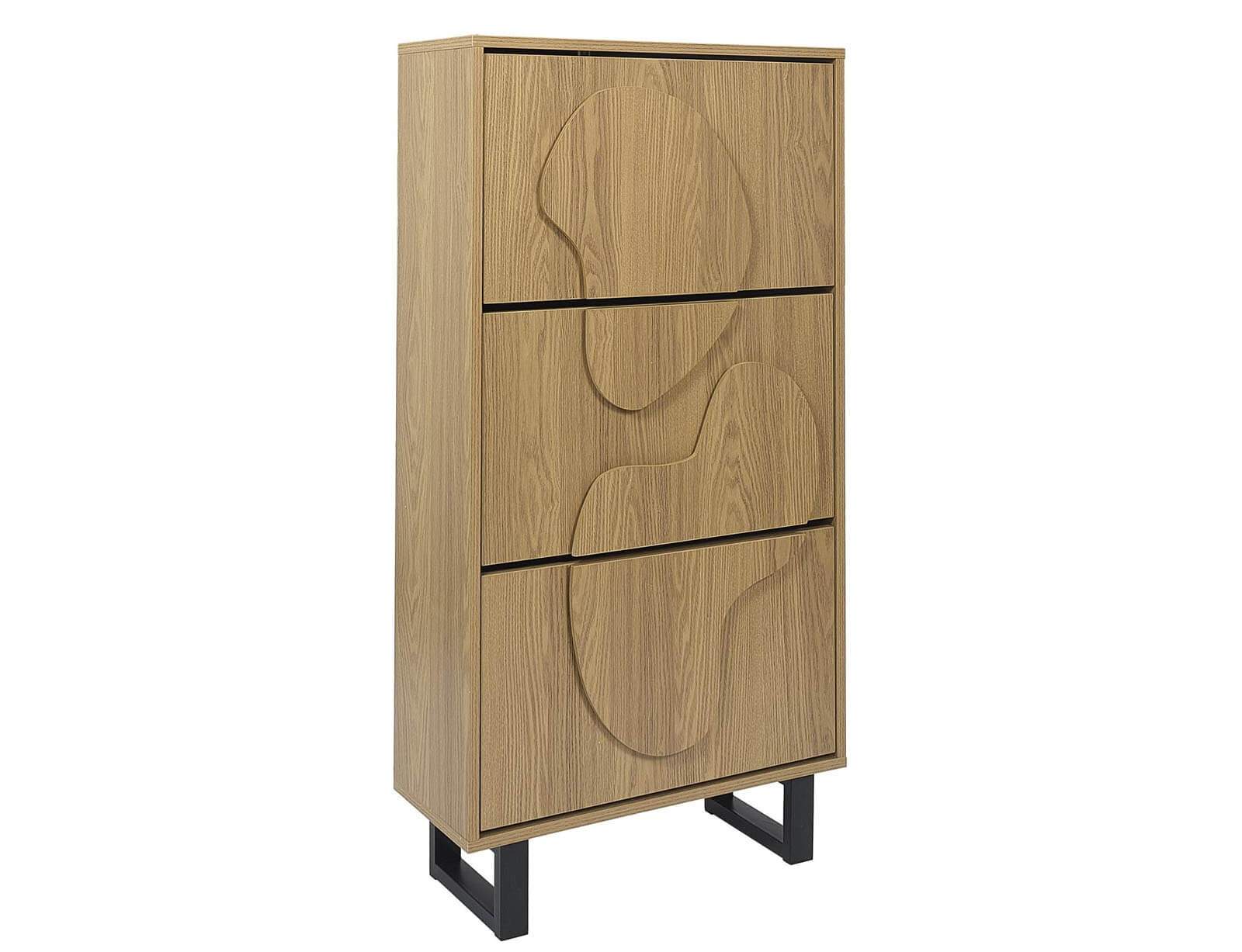 Οργανώστε τα παπούτσια σας και κρατήστε το χώρο σας τακτοποιημένο με την παπουτσοθήκη Calypso από τη Home Deco Factory. Διαθέτει 3 ράφια και κάθε ράφι αποτελείται από 2 επίπεδα, στα οποία μπορείτε να τοποθετήσετε από αθλητικά μέχρι ψηλοτάκουνα παπούτσια. Χωράει έως και 18 ζευγάρια παπούτσια και θα δώσει μια νότα φυσικότητας και μινιμαλισμού στο χώρου σας. Είναι κατασκευασμένη από MDF με ιδιαίτερο σχέδιο κατά μήκος της πόρτας, το οποίο προσθέτει επιπλέον ομορφιά και στηρίζεται σε πόδια από μέταλλο που δένουν αρμονικά με το σύνολο.