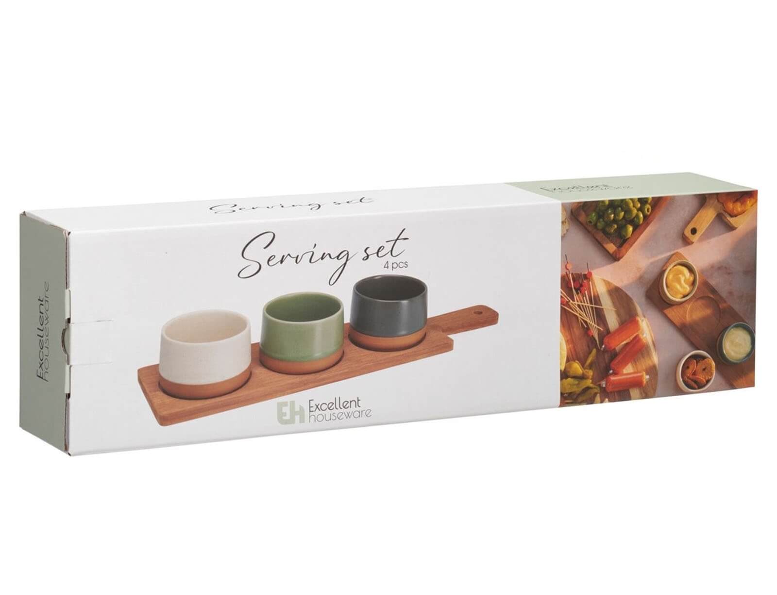 Σερβίρετε τα αγαπημένα σας σνακ ή σάλτσες με το σετ σερβιρίσματος από την Excellent Houseware. Το σετ αποτελείται από 3 μπολ ίδιου μεγέθους σε τρεις αποχρώσεις και έναν ξύλινο δίσκο. Ο δίσκος διαθέτει εσοχές για να παραμένουν σταθερά τα μπολ. Τα μπολ είναι κατασκευασμένα από κεραμικό υλικό και ο δίσκος από ξύλο μπαμπού.