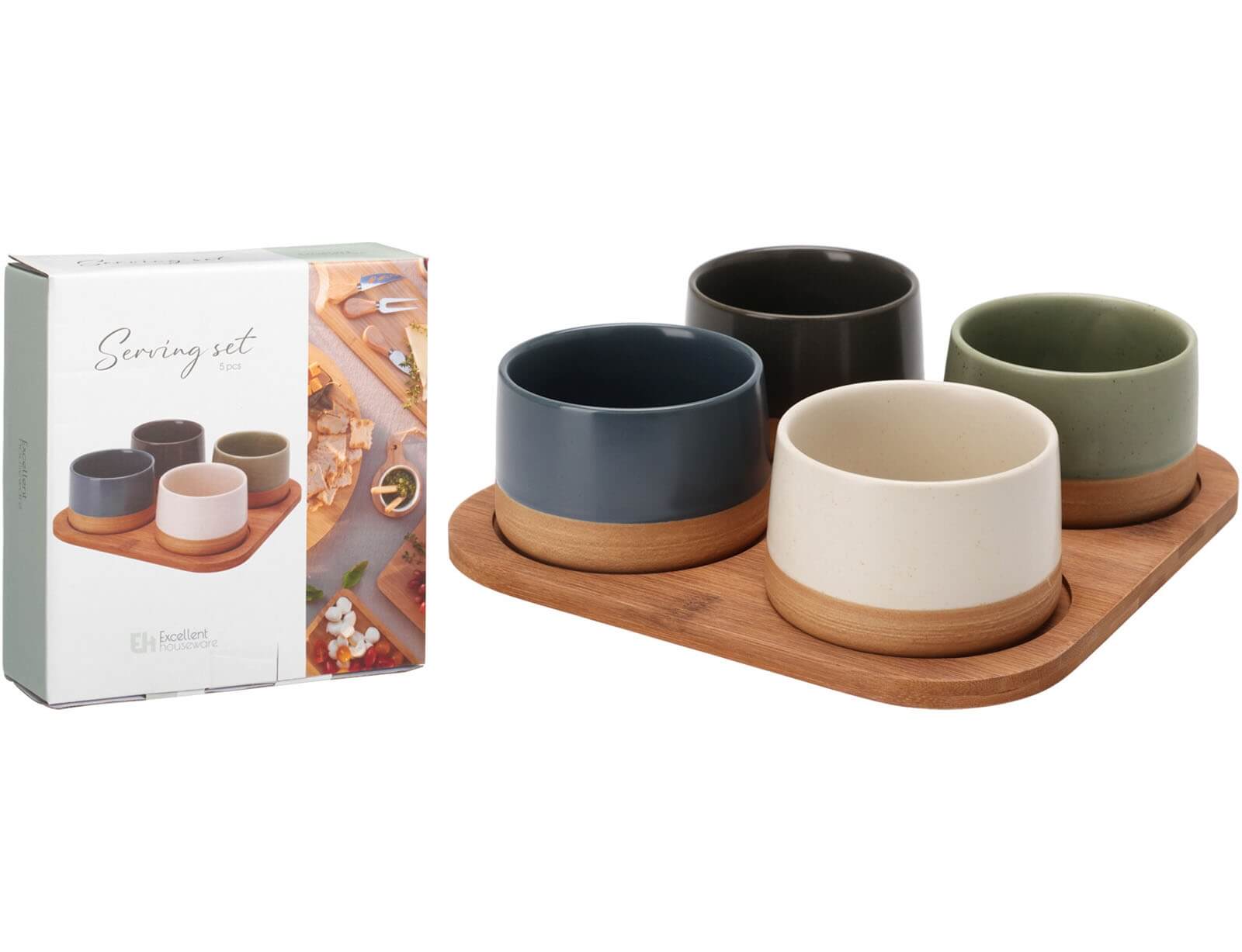 Σερβίρετε τα αγαπημένα σας σνακ ή σάλτσες με το σετ σερβιρίσματος από την Excellent Houseware. Το σετ αποτελείται από 4 μπωλ διαφορετικών μεγεθών σε αποχρώσεις μπλε, μπαύρο, πράσινο και λευκό και έναν ξύλινο δίσκο. Ο δίσκος διαθέτει εσοχές για να παραμένουν σταθερά τα μπωλ. Τα μπωλ είναι κατασκευασμένα από κεραμικό υλικό και ο δίσκος από ξύλο μπαμπού.