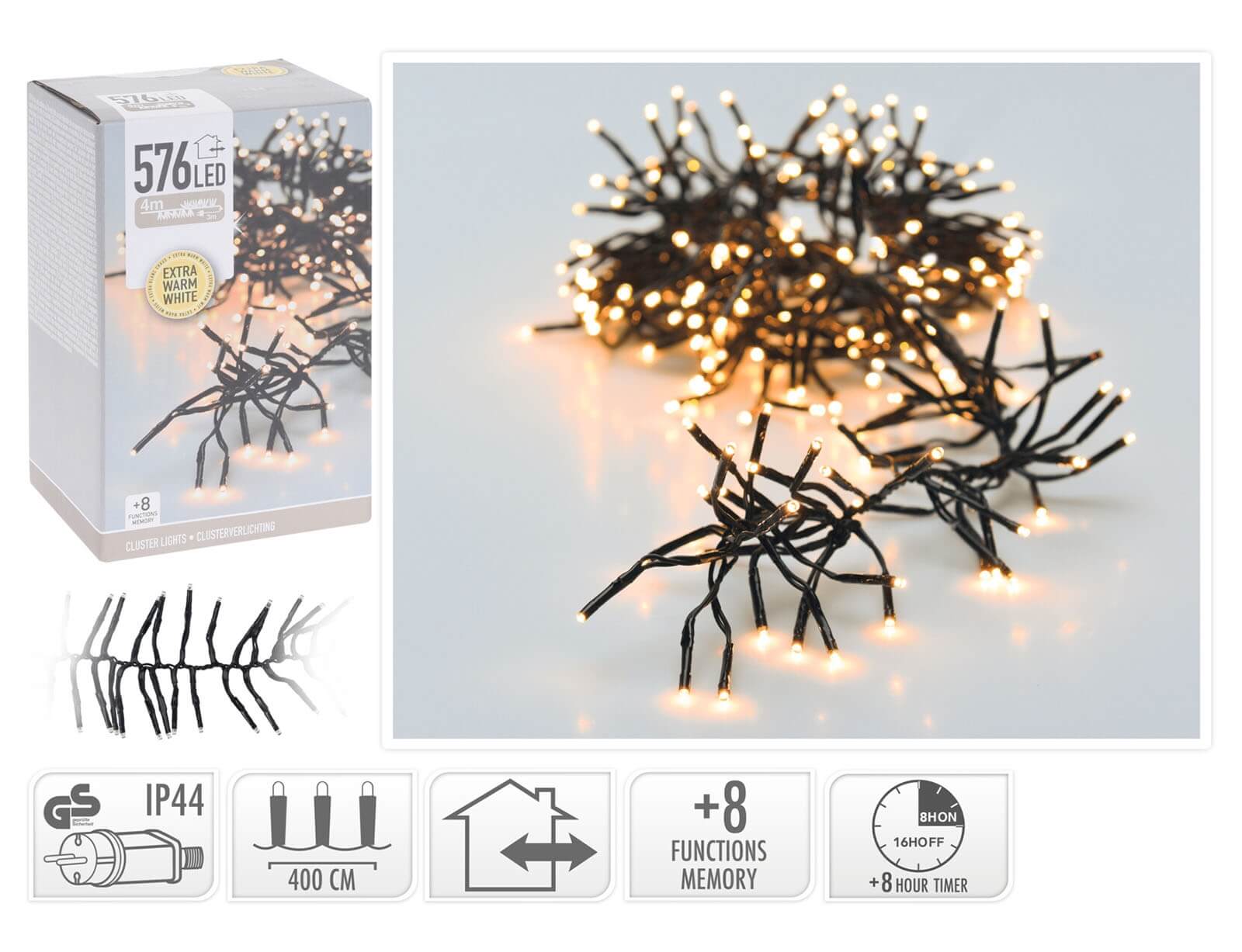 Διαθέτει αντάπτορα, 8 προγράμματα, χρονοδιακόπτη 8 ωρών και το καλώδιο έχει μήκος 4m και επιπλέον 3 μέτρα καλώδιο επέκτασης. Έχουν βαθμό στεγανότητας IP44 που τα καθιστά κατάλληλα και για εξωτερικούς χώρους. Η μικρή απόσταση μεταξύ των λαμπτήρων σας επιτρέπει να διακοσμήσετε πλούσια όποιο σημείο του σπιτιού επιθυμείτε.