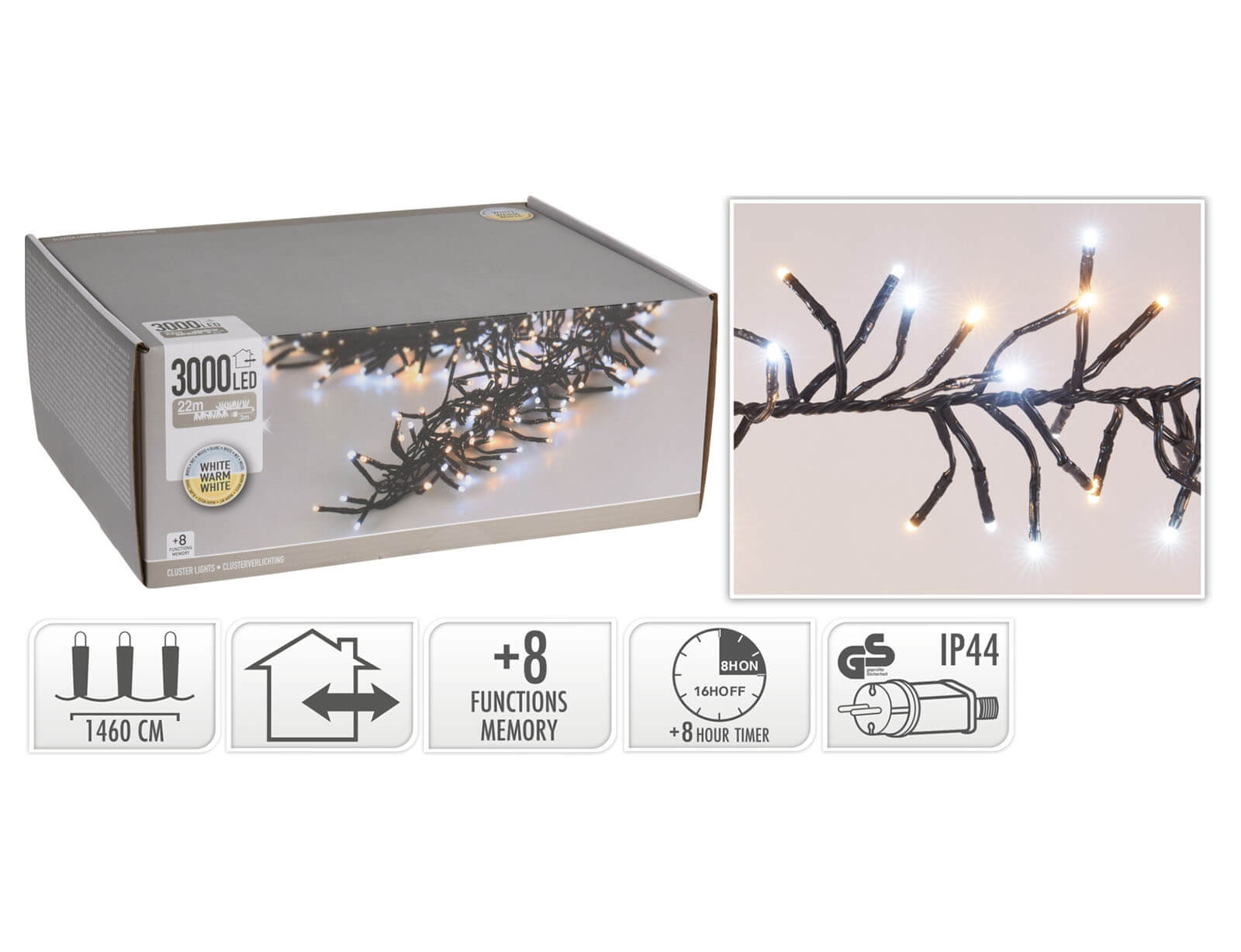 3000 Φωτάκια LED - 21.8 Μέτρα + 3 Μέτρα σύνδεσης, Κανονική Διάταξη, με χειριστήριο, 8 προγράμματα, Μαύρο καλώδιο PVC - Λευκό, Θερμό Λευκό