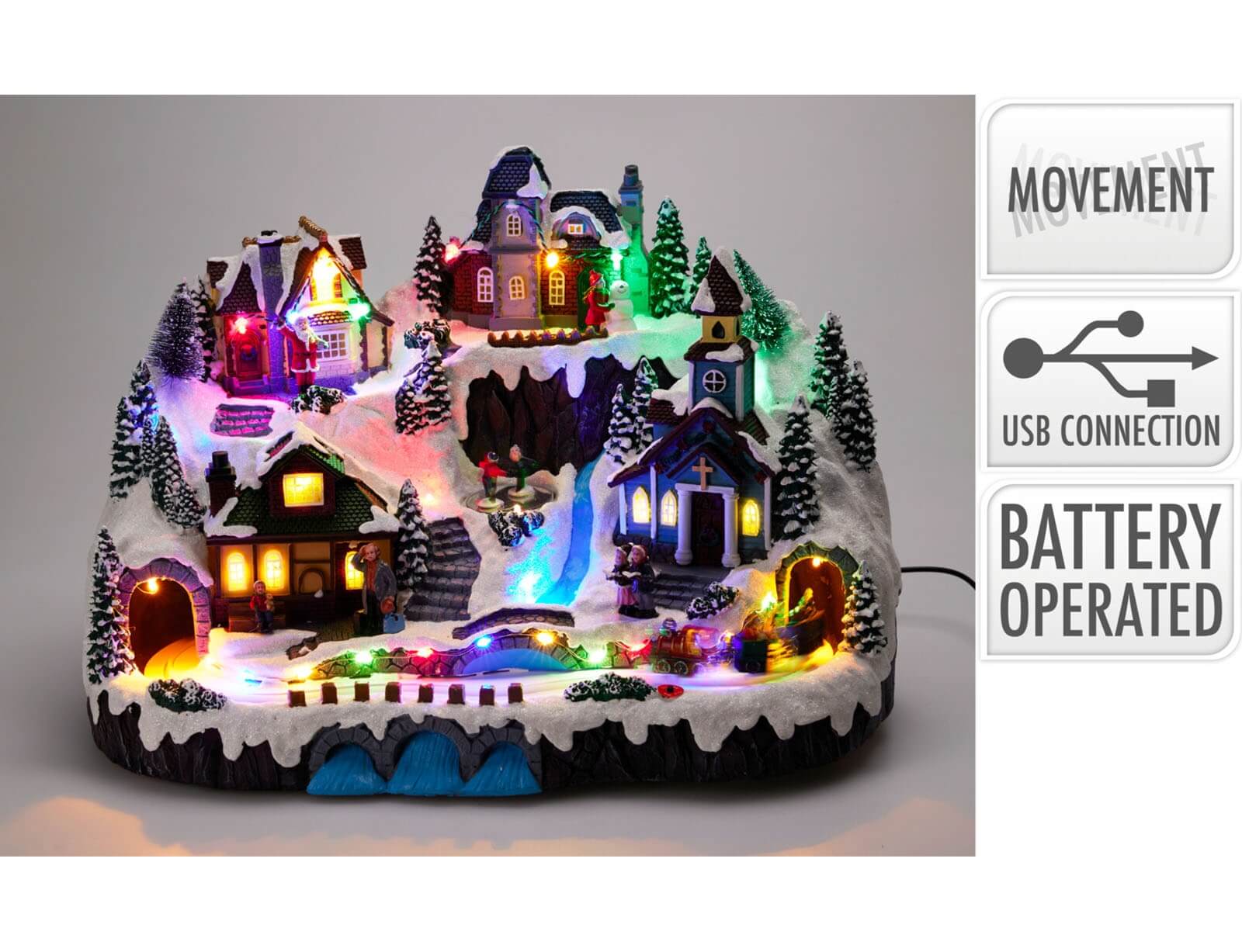 Φέρτε τη μαγεία των Χριστουγέννων στο σπίτι σας με το μοναδικό χριστουγεννιάτικο διακοσμητικό χωριό! Ο φωτισμός αποτελείται από 34 πολύχρωμους λαμπτήρες LED διαμέτρου 3 mm, τοποθετημένους σε απόσταση 25 mm, οι οποίοι δημιουργούν ένα ζεστό και γιορτινό φως, φωτίζοντας κάθε γωνιά του χωριού και ενισχύοντας τη μαγευτική ατμόσφαιρα. Το χωριό μπορεί να λειτουργήσει είτε με το συμπεριλαμβανόμενο καλώδιο USB μέσω του βύσματος 3.5 mm DC jack, είτε με 3 μπαταρίες AA carbon zinc που περιλαμβάνονται, προσφέροντας ευκολία και ευελιξία στη χρήση.