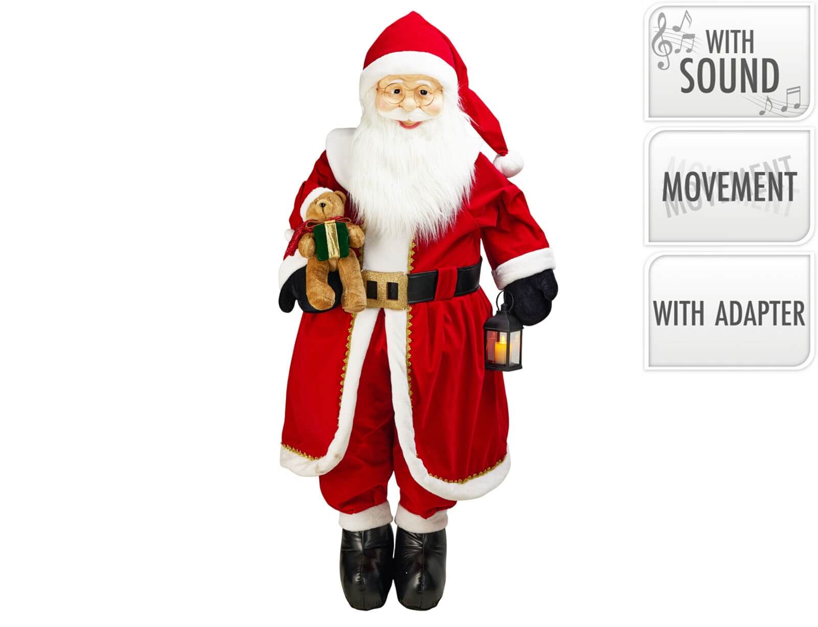 Φέρτε τη μαγεία των Χριστουγέννων στον χώρο σας με αυτόν τον εντυπωσιακό διακοσμητικό Άγιο Βασίλη που κινείται, παίζει μουσική και φωτίζεται με πολύχρωμα LED. Ο διακοσμητικός Άγιος Βασίλης διαθέτει αισθητήρα ήχου, ο οποίος ενεργοποιεί αυτόματα την κίνηση, τη μουσική και τον φωτισμό με οποιονδήποτε ήχο στον χώρο, όπως για παράδειγμα χειροκρότημα, φωνές, μουσική κτλ. Με ύψος 200 cm., το εντυπωσιακό του μέγεθος τον καθιστά πρωταγωνιστή σε κάθε χώρο, ενώ χάρη στην πτυσσόμενη κατασκευή του (σώμα & κεφάλι διπλώνουν), αποθηκεύεται εύκολα μετά τις γιορτές.