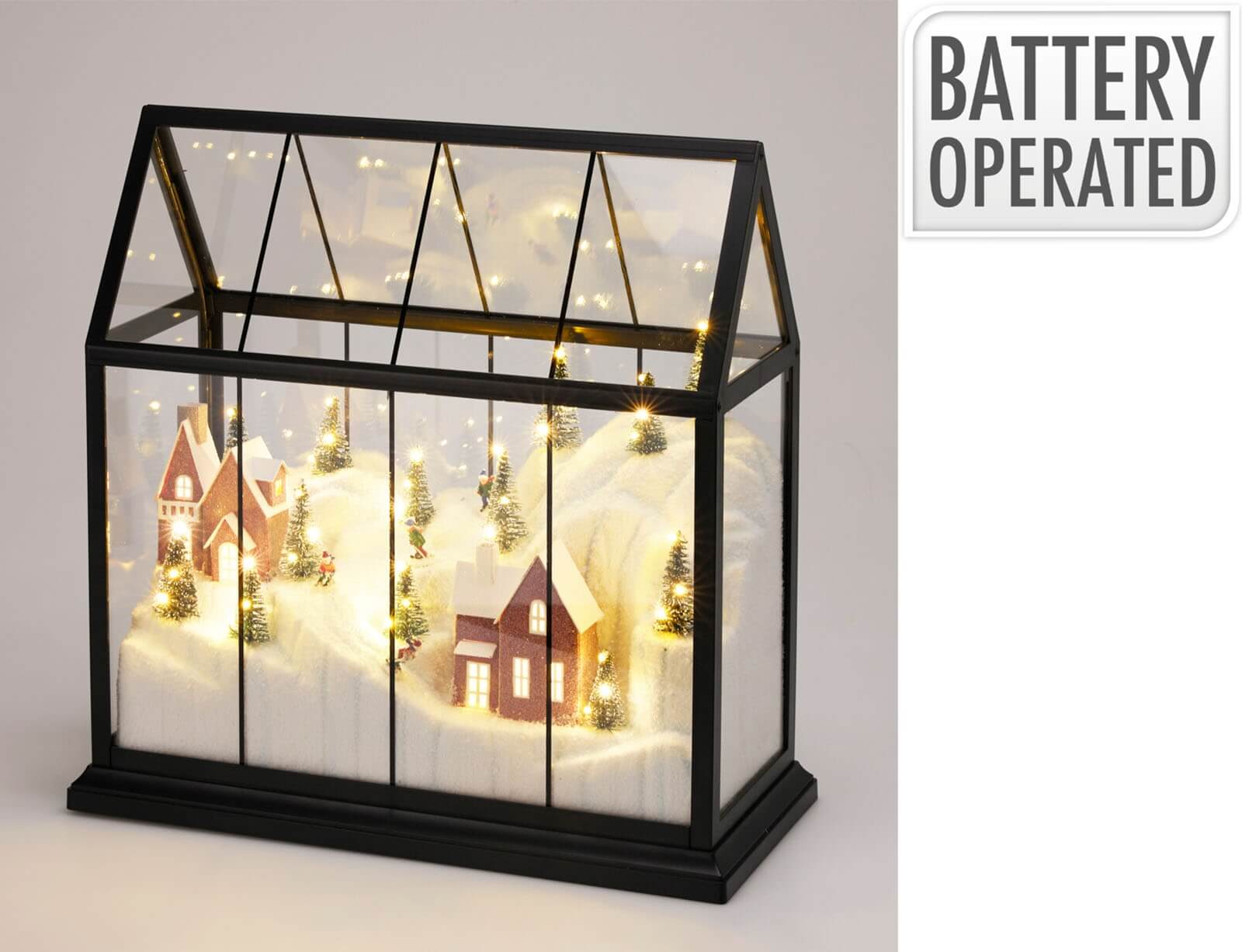 Με αυτό το εντυπωσιακό διακοσμητικό χωριό με LED, η μαγεία των γιορτών ζωντανεύει μπροστά σας! Στο εσωτερικό του αποκαλύπτεται ένα παραμυθένιο χειμωνιάτικο σκηνικό με μικρά σπιτάκια, δέντρα, γιορτινές λεπτομέρειες και σκιέρ. Τα 47 φωτάκια LED που λαμπυρίζουν προσθέτουν μια μαγευτική λάμψη, κάνοντας το διακοσμητικό να μοιάζει με αληθινό παραμύθι μέσα σε γυάλινη βιτρίνα. Ο κομψός μαύρος σκελετός αναδεικνύει ακόμη περισσότερο το σκηνικό, χαρίζοντας μοντέρνα αισθητική που ταιριάζει σε κάθε στυλ διακόσμησης. Λειτουργεί με 2 μπαταρίες ΑΑ (δεν περιλαμβάνονται), ώστε να μπορείτε να το τοποθετήσετε οπουδήποτε, χωρίς καλώδια. Εύκολο στη χρήση, εντυπωσιακό στην εμφάνιση, είναι ένα στολίδι που θα λατρέψουν μικροί και μεγάλοι.