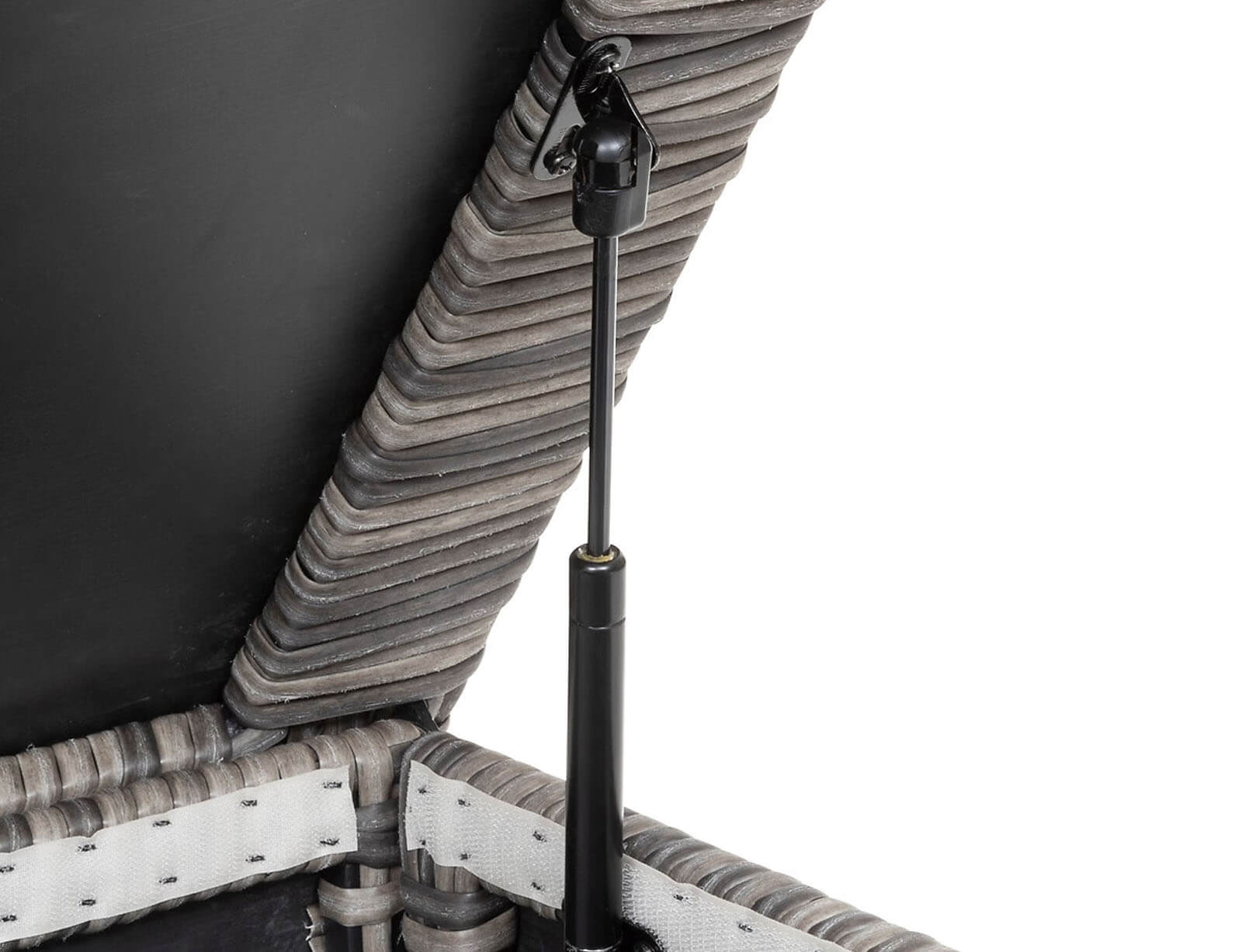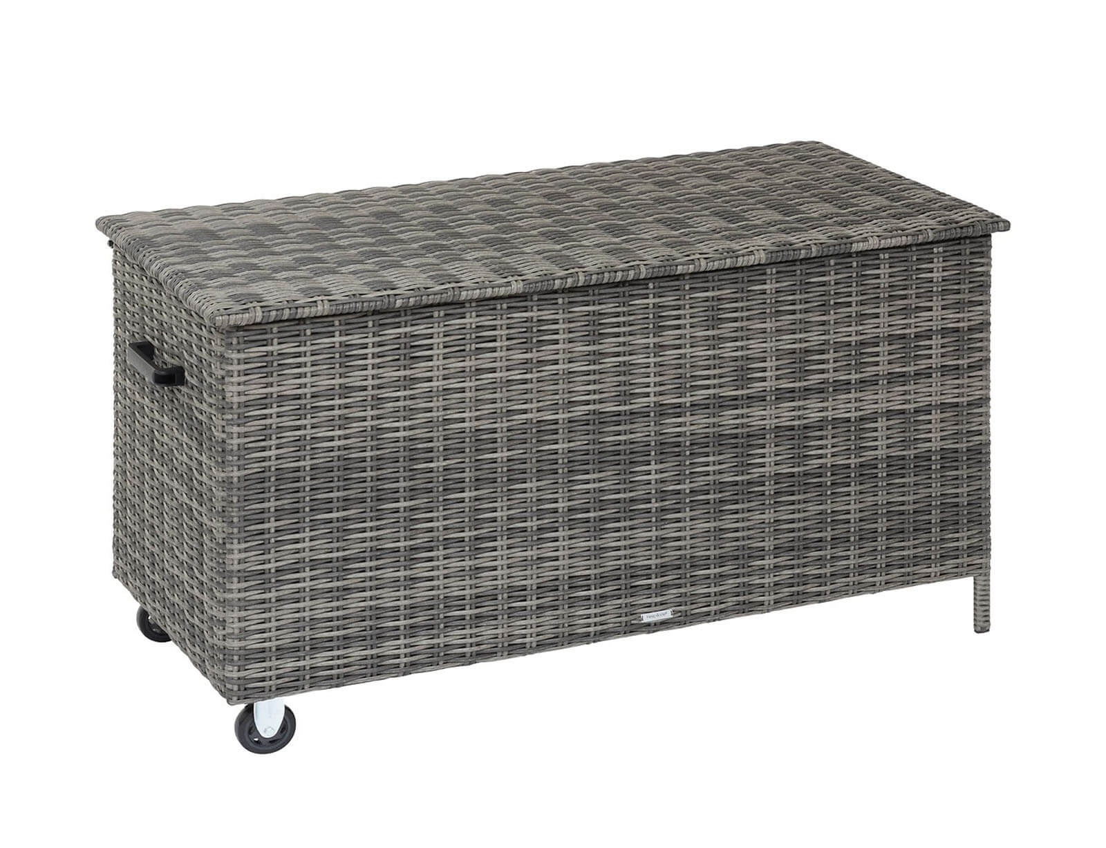 Ανακαλύψτε το ιδανικό μπαούλο αποθήκευσης για τον κήπο ή τη βεράντα σας με το Bayana από τη Hespéride. Με χωρητικότητα 600 λίτρων, αυτό το κομψό και ανθεκτικό έπιπλο προσφέρει άφθονο χώρο για την αποθήκευση μαξιλαριών, εργαλείων ή καλοκαιρινών αντικειμένων, κρατώντας τα οργανωμένα και προστατευμένα. Κατασκευασμένο από συνθετική πλεκτή ρητίνη, το Bayana συνδυάζει την κομψότητα με την αντοχή, προσδίδοντας στυλ στον εξωτερικό σας χώρο. Η στιβαρή κατασκευή του με εποξειδικά επεξεργασμένο ατσάλινο σκελετό εξασφαλίζει μακροχρόνια ανθεκτικότητα στις καιρικές συνθήκες, ενώ η εσωτερική επένδυση με φερμουάρ προσφέρει επιπλέον στεγανότητα και προστασία από την υγρασία. Η καθημερινή χρήση γίνεται πιο εύκολη χάρη στα πλαϊνά χερούλια και τους δύο τροχούς, που επιτρέπουν εύκολη μετακίνηση, καθώς και στο καπάκι με υδραυλικά αμορτισέρ (jacks) για ασφαλές και άνετο άνοιγμα.