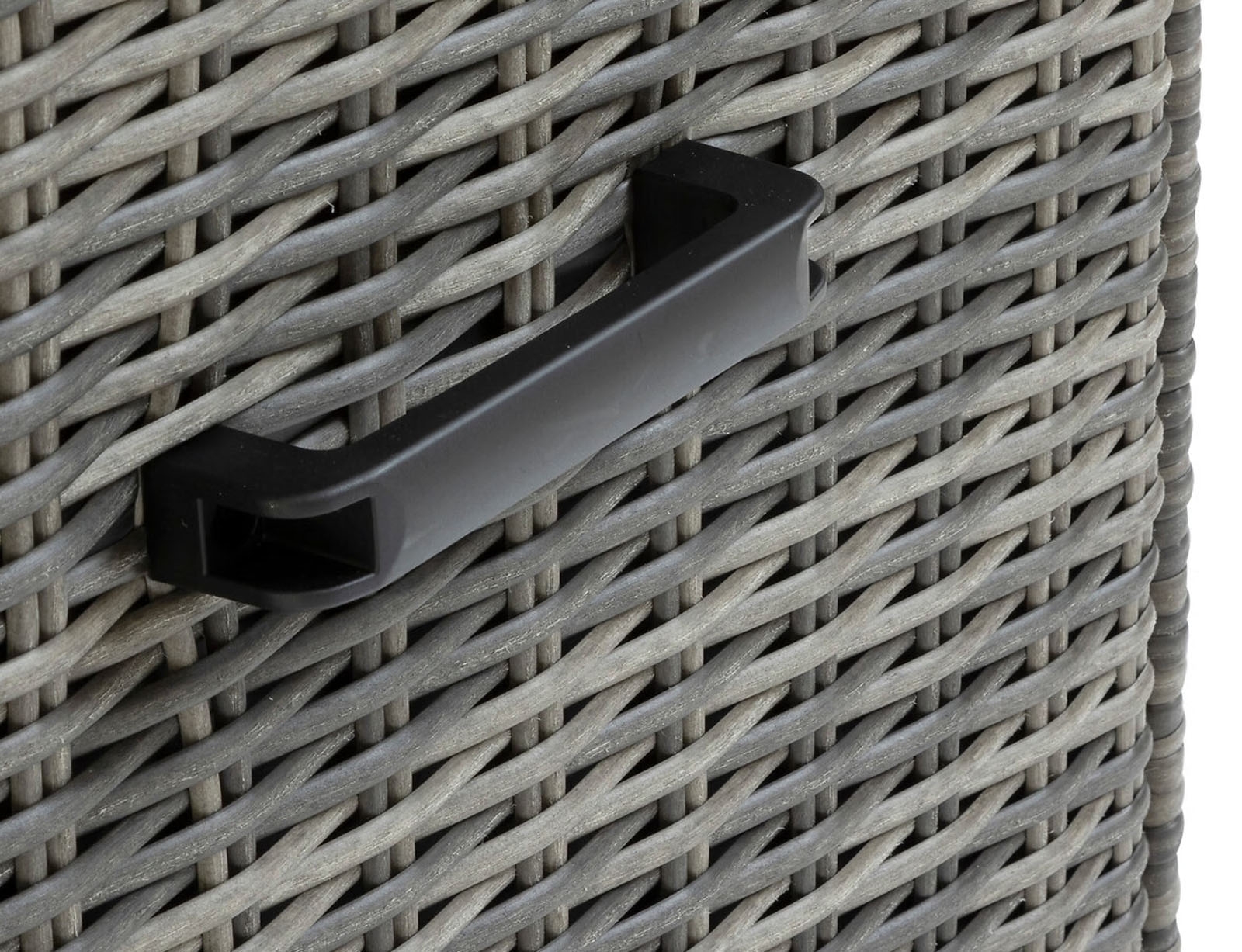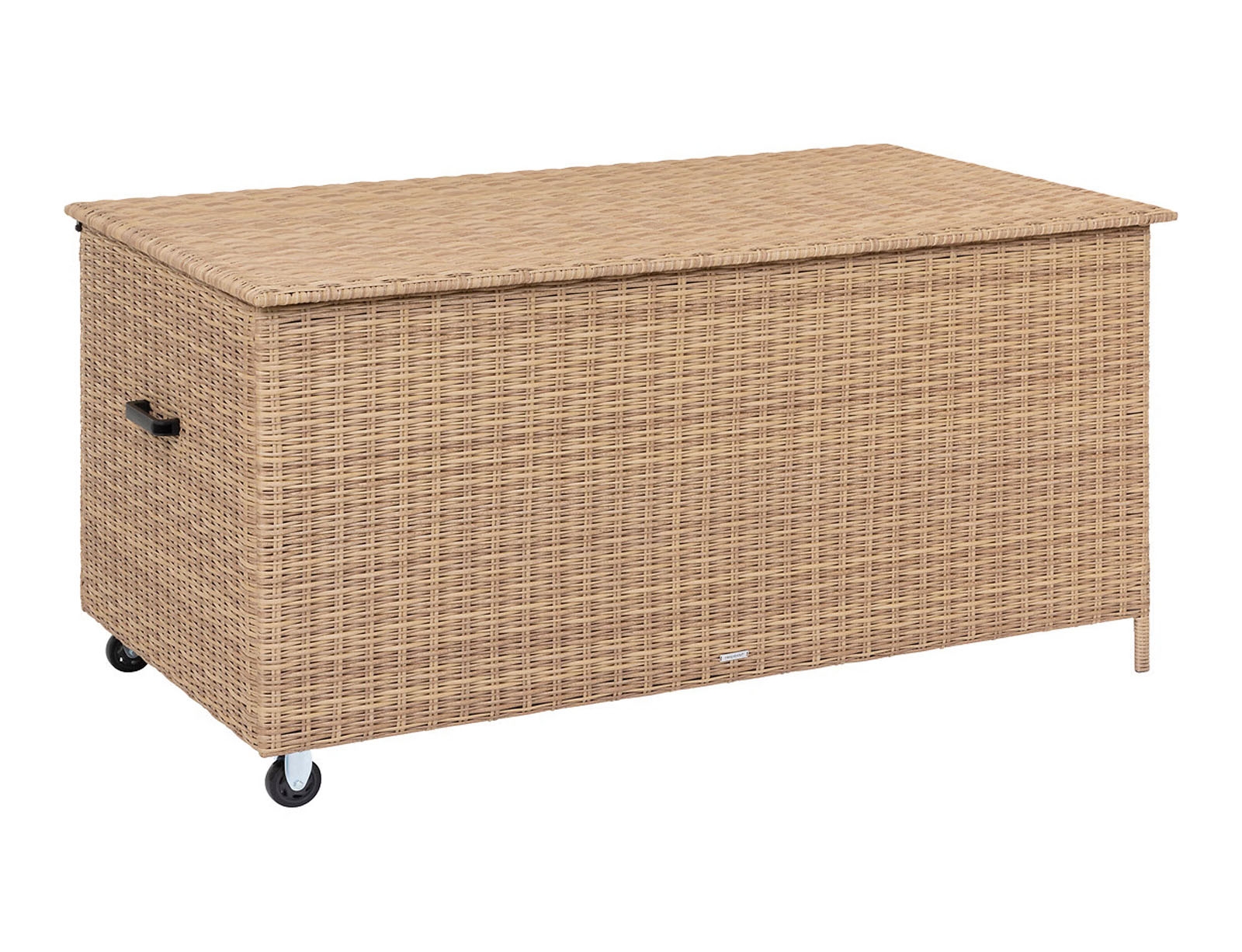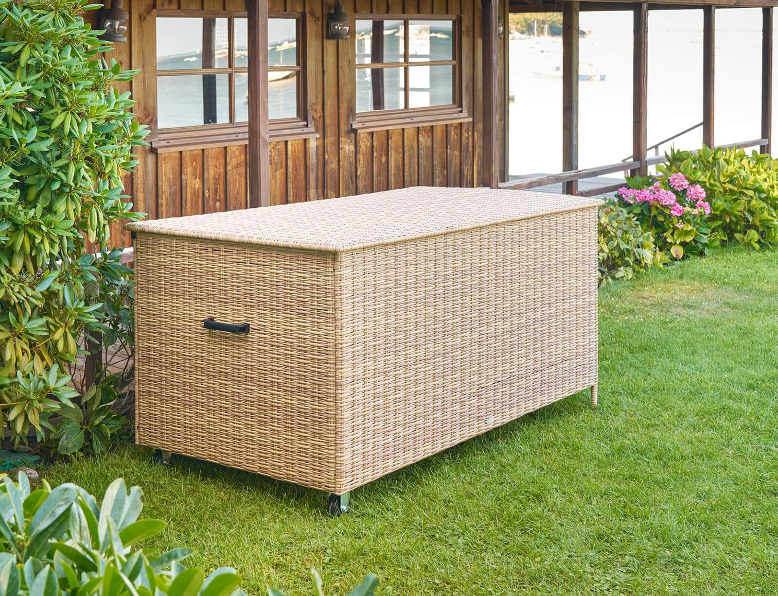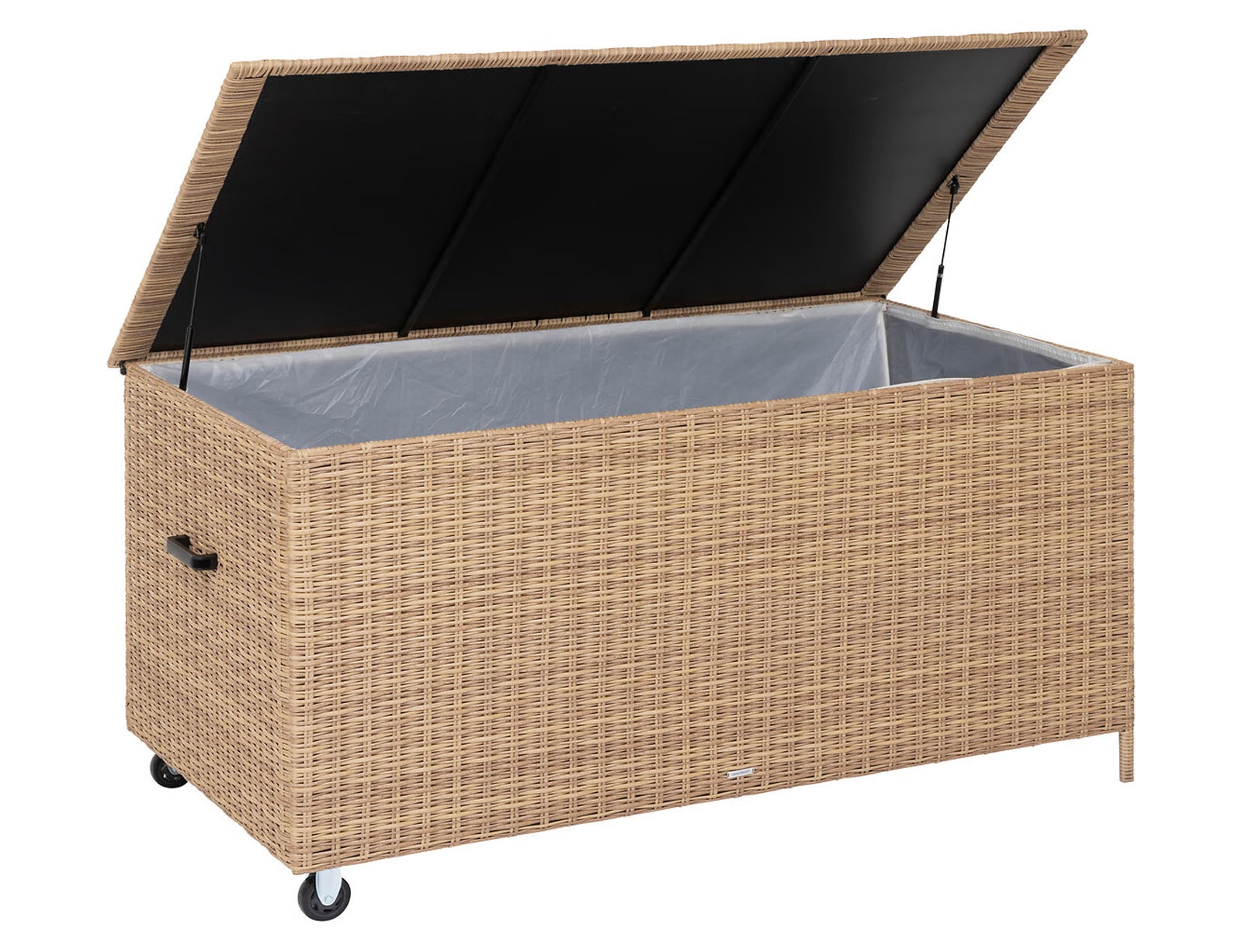 Ανακαλύψτε το ιδανικό μπαούλο αποθήκευσης για τον κήπο ή τη βεράντα σας με το Bayana από τη Hespéride. Με χωρητικότητα 600 λίτρων, αυτό το κομψό και ανθεκτικό έπιπλο προσφέρει άφθονο χώρο για την αποθήκευση μαξιλαριών, εργαλείων ή καλοκαιρινών αντικειμένων, κρατώντας τα οργανωμένα και προστατευμένα. Κατασκευασμένο από συνθετική πλεκτή ρητίνη, το Bayana συνδυάζει την κομψότητα με την αντοχή, προσδίδοντας στυλ στον εξωτερικό σας χώρο. Η στιβαρή κατασκευή του με εποξειδικά επεξεργασμένο ατσάλινο σκελετό εξασφαλίζει μακροχρόνια ανθεκτικότητα στις καιρικές συνθήκες, ενώ η εσωτερική επένδυση με φερμουάρ προσφέρει επιπλέον στεγανότητα και προστασία από την υγρασία. Η καθημερινή χρήση γίνεται πιο εύκολη χάρη στα πλαϊνά χερούλια και τους δύο τροχούς, που επιτρέπουν εύκολη μετακίνηση, καθώς και στο καπάκι με υδραυλικά αμορτισέρ (jacks) για ασφαλές και άνετο άνοιγμα.
