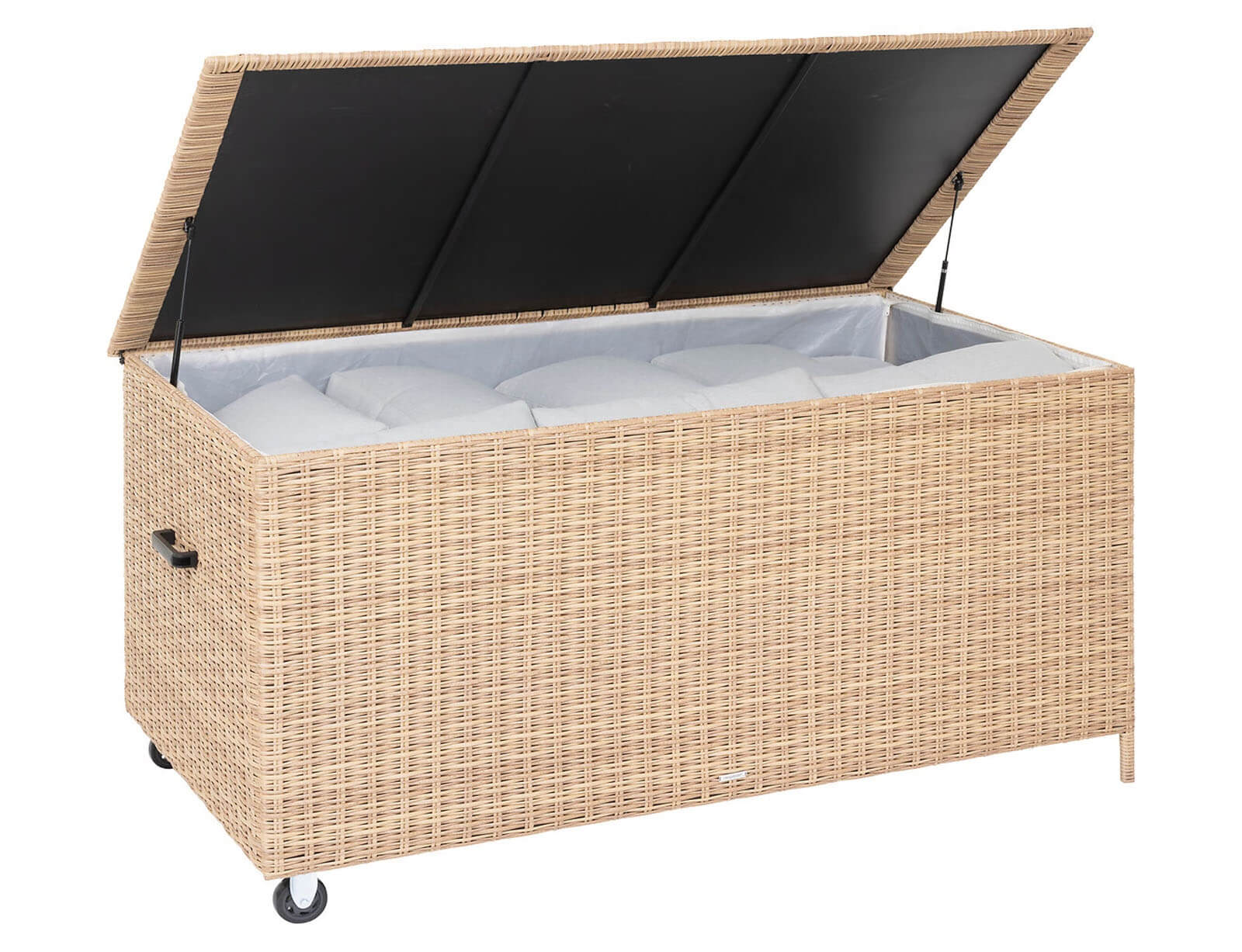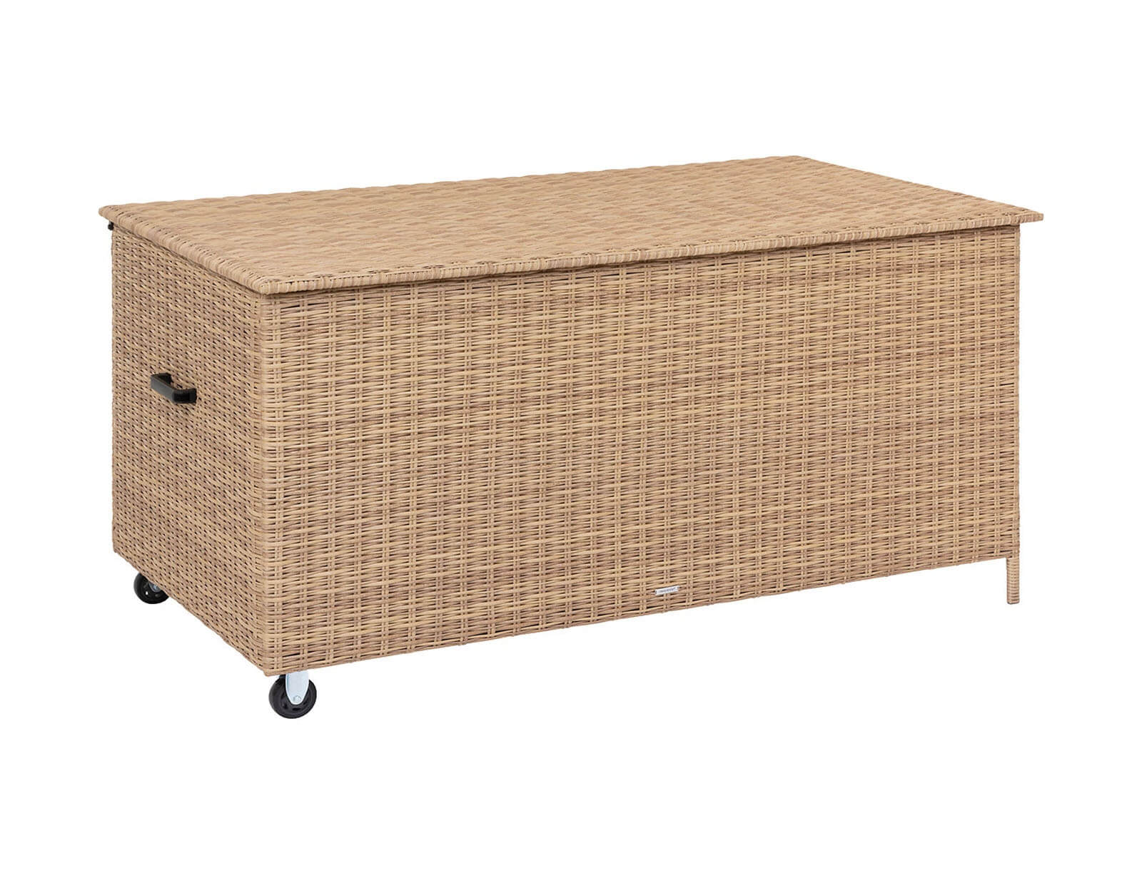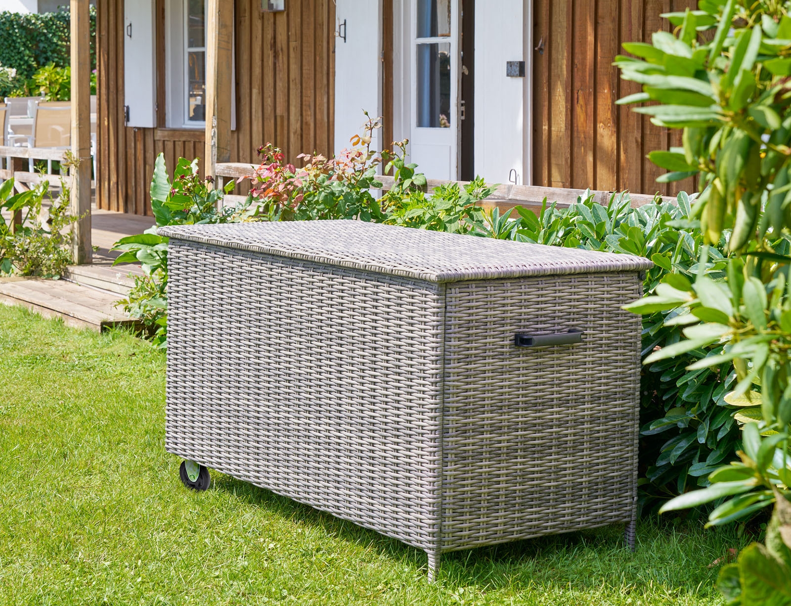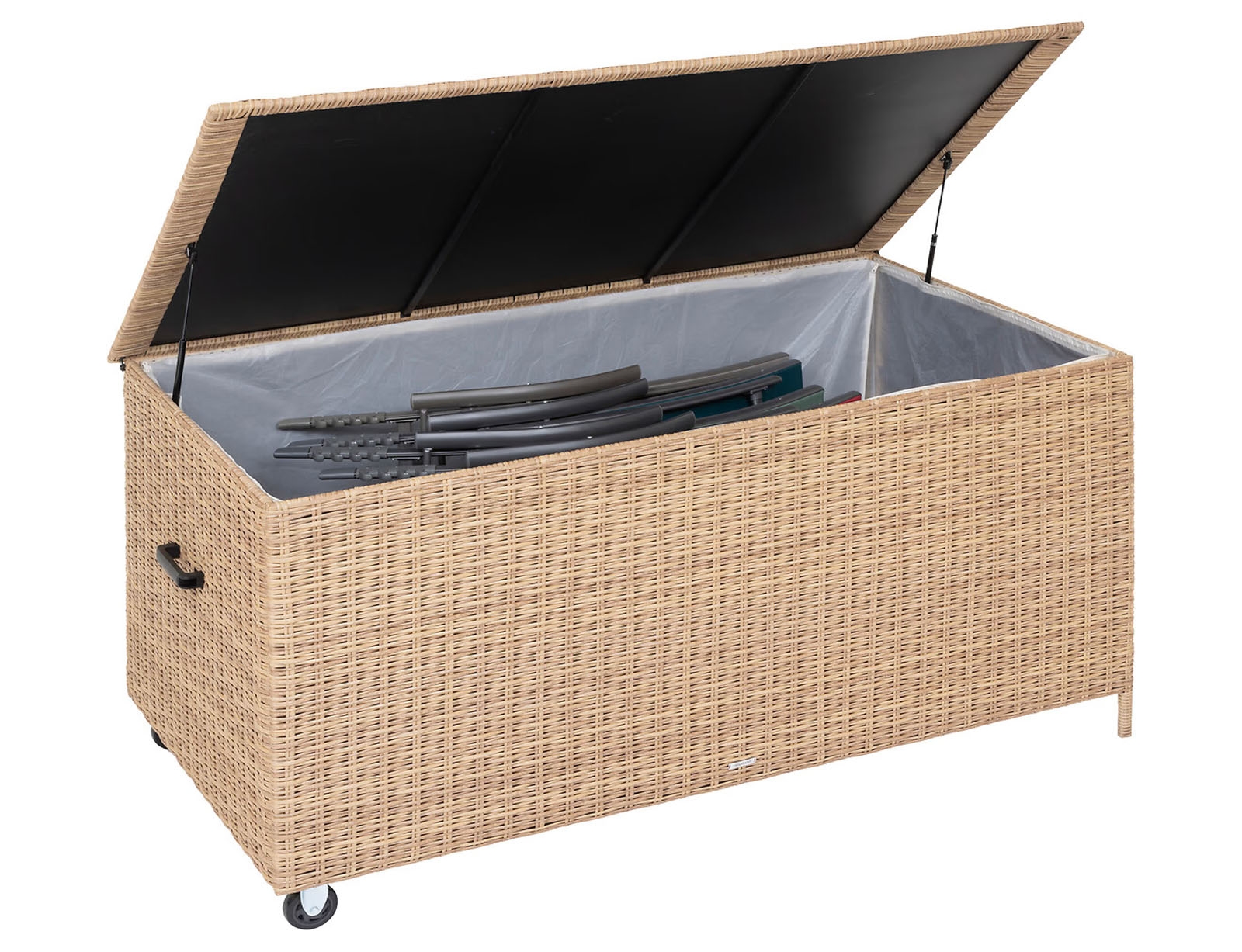 Ανακαλύψτε το ιδανικό μπαούλο αποθήκευσης για τον κήπο ή τη βεράντα σας με το Bayana από τη Hespéride. Με χωρητικότητα 600 λίτρων, αυτό το κομψό και ανθεκτικό έπιπλο προσφέρει άφθονο χώρο για την αποθήκευση μαξιλαριών, εργαλείων ή καλοκαιρινών αντικειμένων, κρατώντας τα οργανωμένα και προστατευμένα. Κατασκευασμένο από συνθετική πλεκτή ρητίνη, το Bayana συνδυάζει την κομψότητα με την αντοχή, προσδίδοντας στυλ στον εξωτερικό σας χώρο. Η στιβαρή κατασκευή του με εποξειδικά επεξεργασμένο ατσάλινο σκελετό εξασφαλίζει μακροχρόνια ανθεκτικότητα στις καιρικές συνθήκες, ενώ η εσωτερική επένδυση με φερμουάρ προσφέρει επιπλέον στεγανότητα και προστασία από την υγρασία. Η καθημερινή χρήση γίνεται πιο εύκολη χάρη στα πλαϊνά χερούλια και τους δύο τροχούς, που επιτρέπουν εύκολη μετακίνηση, καθώς και στο καπάκι με υδραυλικά αμορτισέρ (jacks) για ασφαλές και άνετο άνοιγμα.