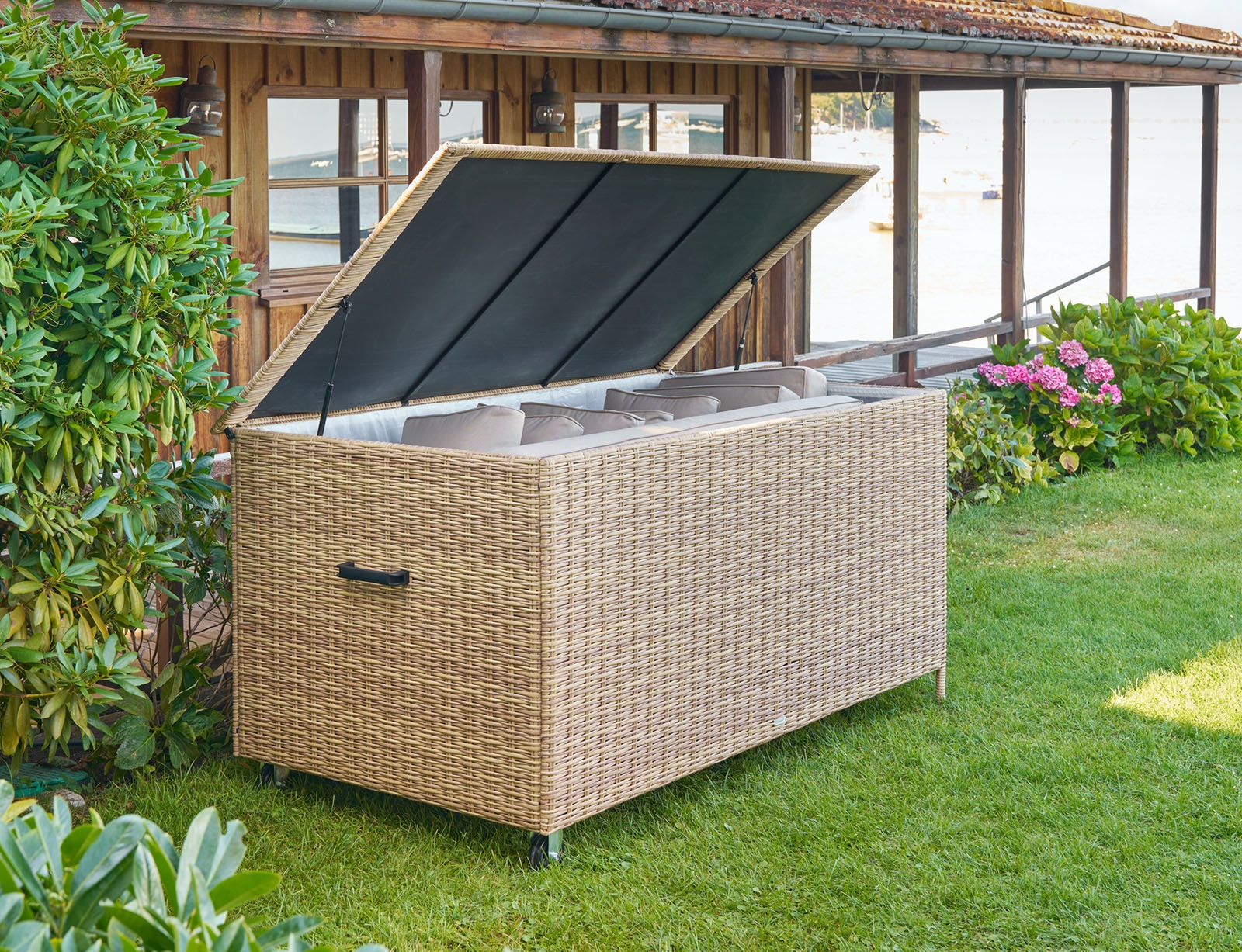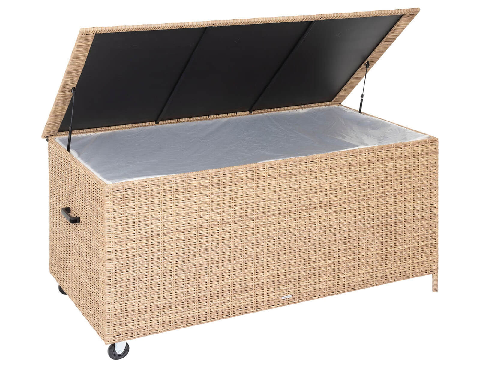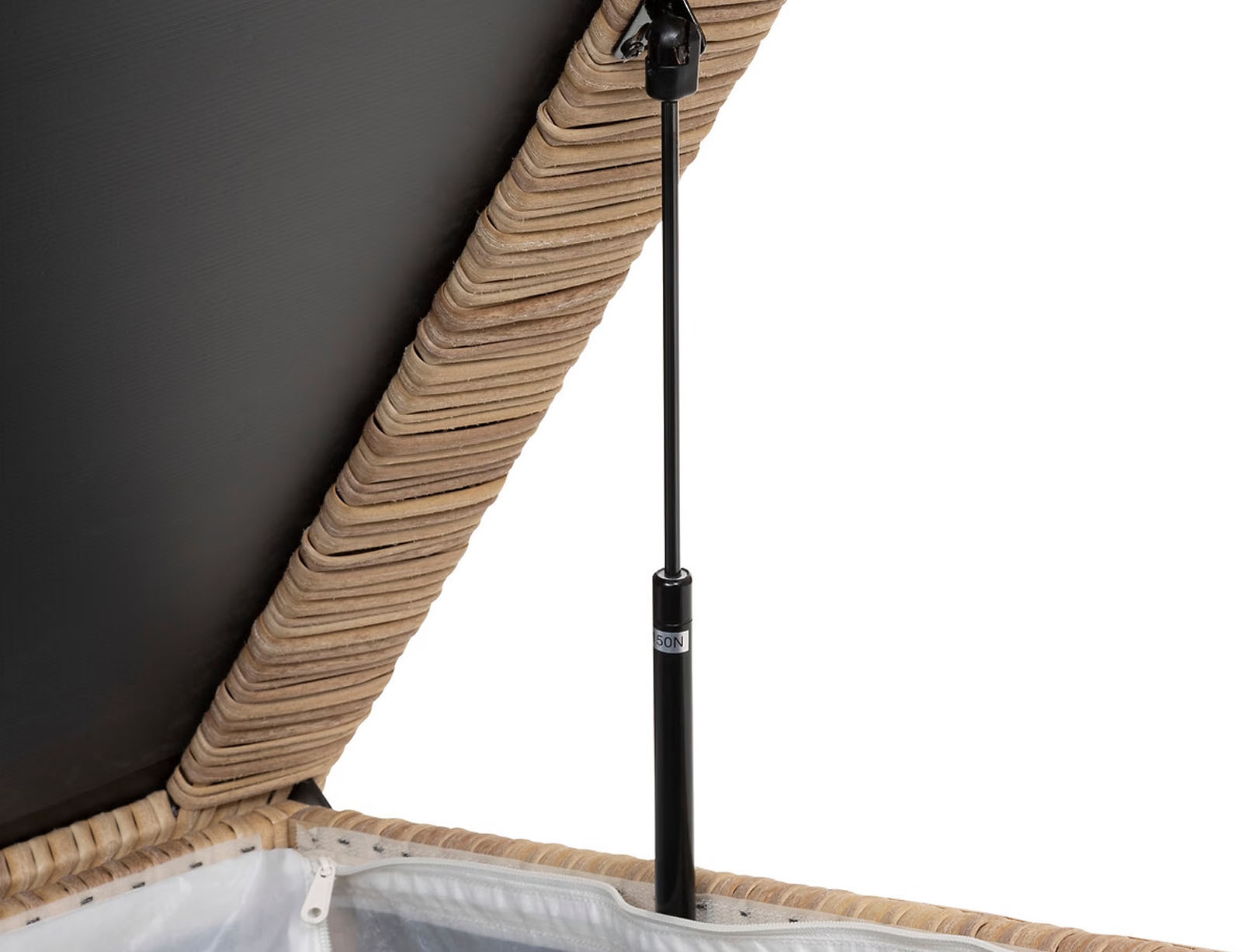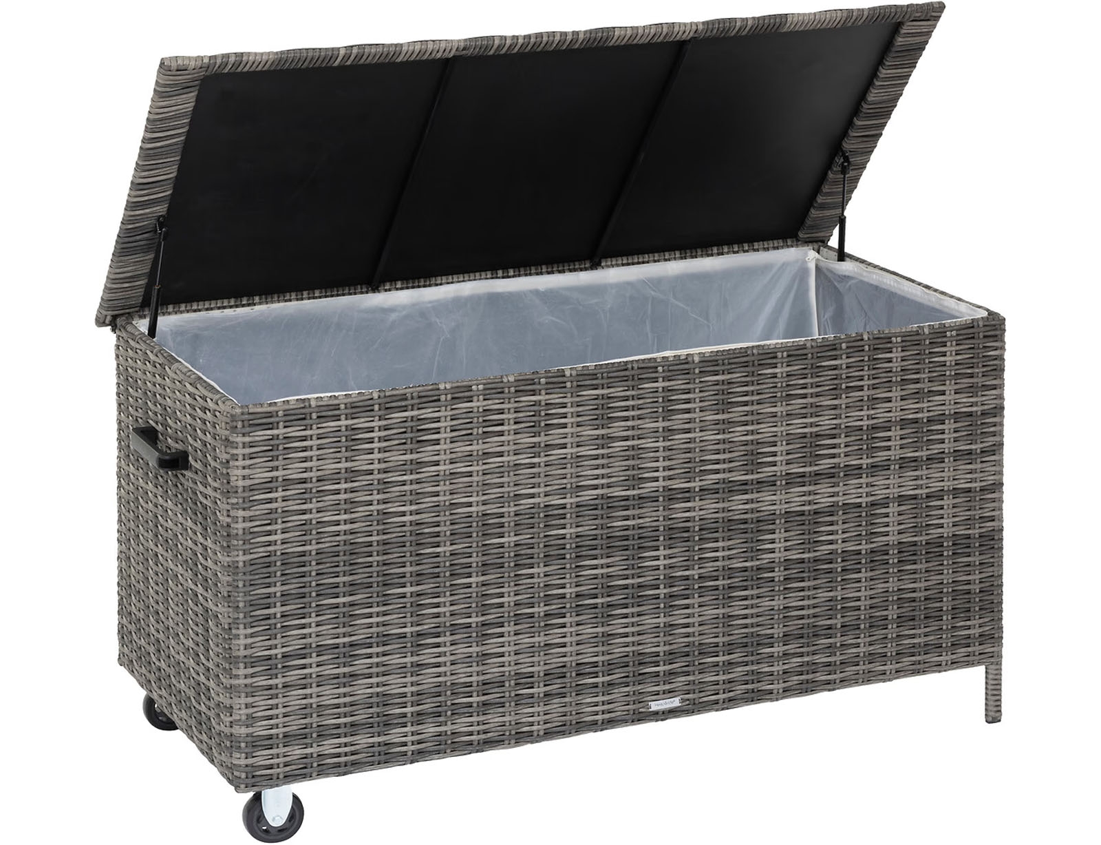 Ανακαλύψτε το ιδανικό μπαούλο αποθήκευσης για τον κήπο ή τη βεράντα σας με το Bayana από τη Hespéride. Με χωρητικότητα 600 λίτρων, αυτό το κομψό και ανθεκτικό έπιπλο προσφέρει άφθονο χώρο για την αποθήκευση μαξιλαριών, εργαλείων ή καλοκαιρινών αντικειμένων, κρατώντας τα οργανωμένα και προστατευμένα. Κατασκευασμένο από συνθετική πλεκτή ρητίνη, το Bayana συνδυάζει την κομψότητα με την αντοχή, προσδίδοντας στυλ στον εξωτερικό σας χώρο. Η στιβαρή κατασκευή του με εποξειδικά επεξεργασμένο ατσάλινο σκελετό εξασφαλίζει μακροχρόνια ανθεκτικότητα στις καιρικές συνθήκες, ενώ η εσωτερική επένδυση με φερμουάρ προσφέρει επιπλέον στεγανότητα και προστασία από την υγρασία. Η καθημερινή χρήση γίνεται πιο εύκολη χάρη στα πλαϊνά χερούλια και τους δύο τροχούς, που επιτρέπουν εύκολη μετακίνηση, καθώς και στο καπάκι με υδραυλικά αμορτισέρ (jacks) για ασφαλές και άνετο άνοιγμα.