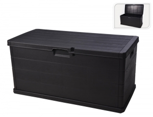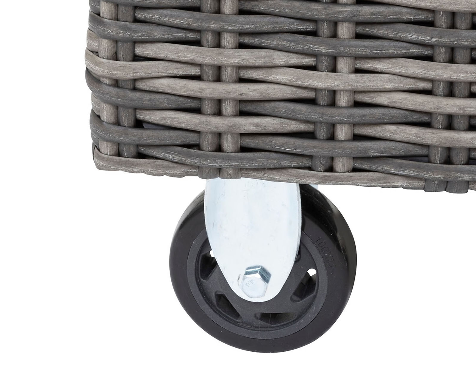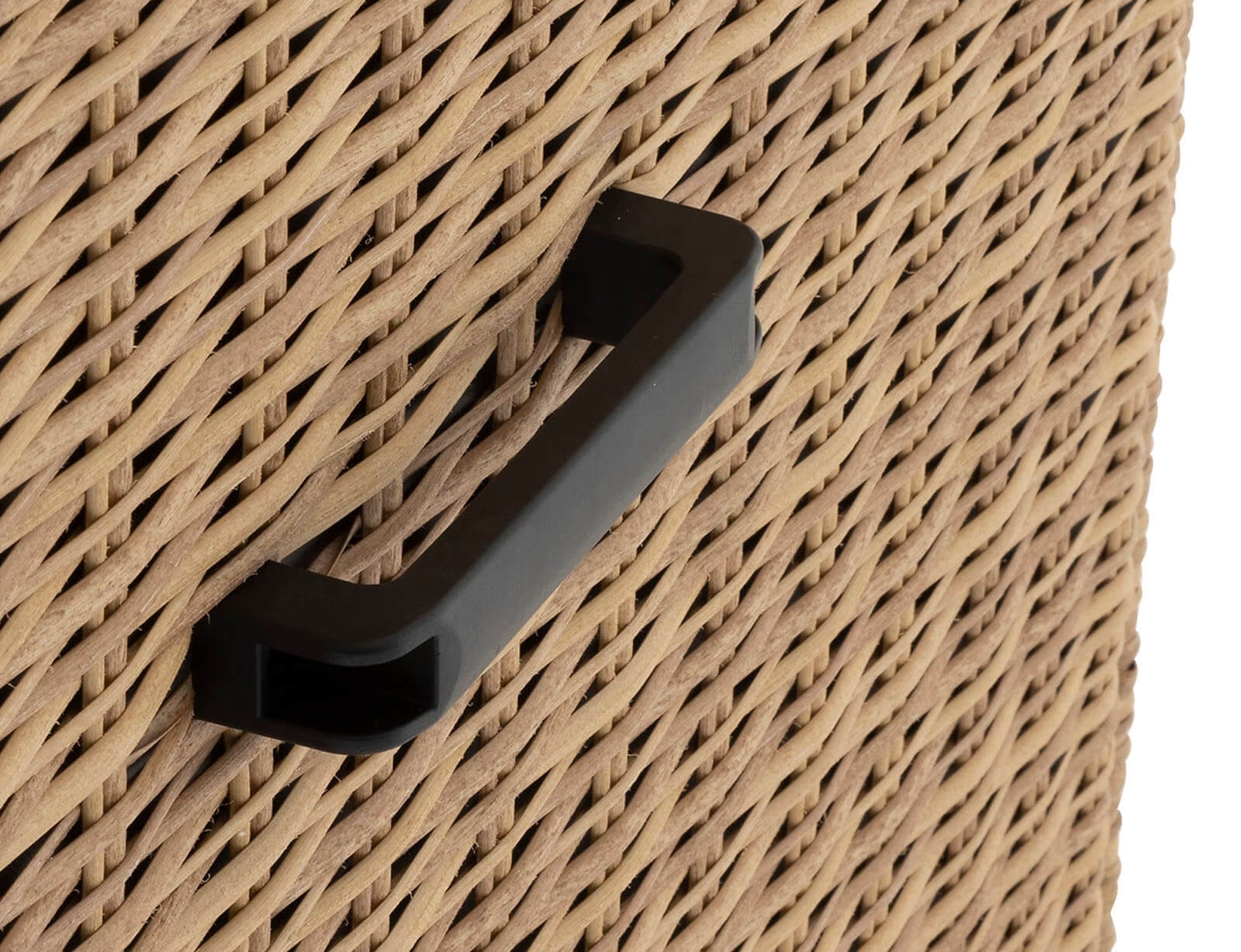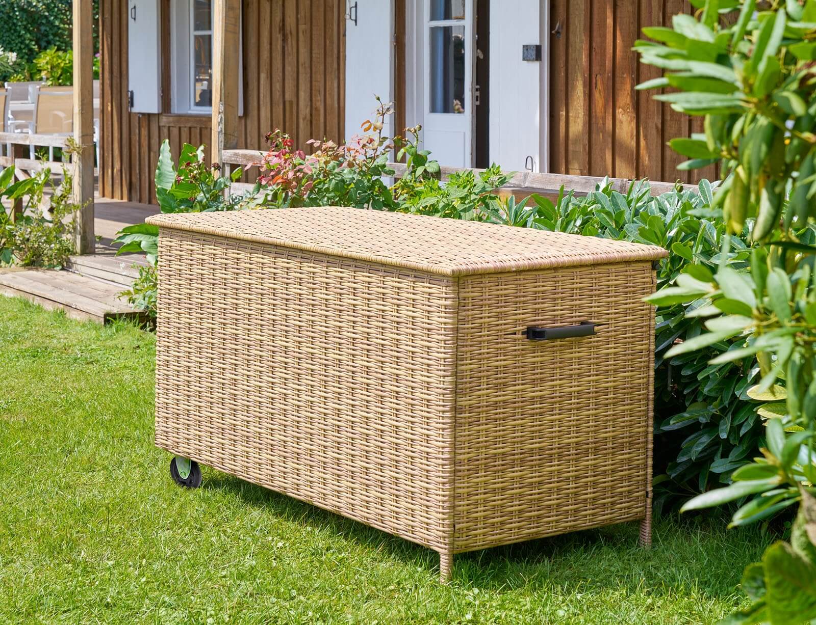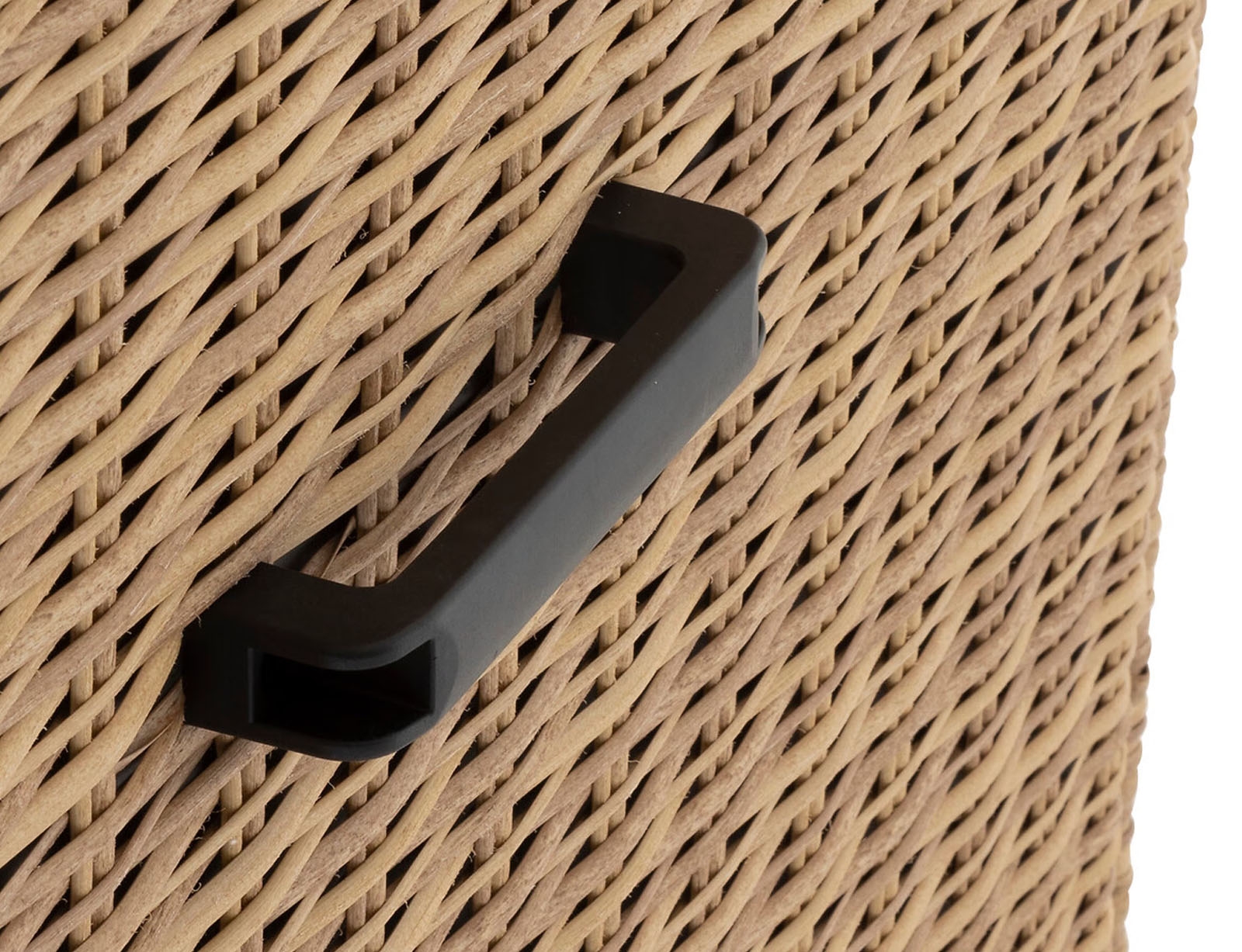 Ανακαλύψτε το ιδανικό μπαούλο αποθήκευσης για τον κήπο ή τη βεράντα σας με το Bayana από τη Hespéride. Με χωρητικότητα 600 λίτρων, αυτό το κομψό και ανθεκτικό έπιπλο προσφέρει άφθονο χώρο για την αποθήκευση μαξιλαριών, εργαλείων ή καλοκαιρινών αντικειμένων, κρατώντας τα οργανωμένα και προστατευμένα. Κατασκευασμένο από συνθετική πλεκτή ρητίνη, το Bayana συνδυάζει την κομψότητα με την αντοχή, προσδίδοντας στυλ στον εξωτερικό σας χώρο. Η στιβαρή κατασκευή του με εποξειδικά επεξεργασμένο ατσάλινο σκελετό εξασφαλίζει μακροχρόνια ανθεκτικότητα στις καιρικές συνθήκες, ενώ η εσωτερική επένδυση με φερμουάρ προσφέρει επιπλέον στεγανότητα και προστασία από την υγρασία. Η καθημερινή χρήση γίνεται πιο εύκολη χάρη στα πλαϊνά χερούλια και τους δύο τροχούς, που επιτρέπουν εύκολη μετακίνηση, καθώς και στο καπάκι με υδραυλικά αμορτισέρ (jacks) για ασφαλές και άνετο άνοιγμα.