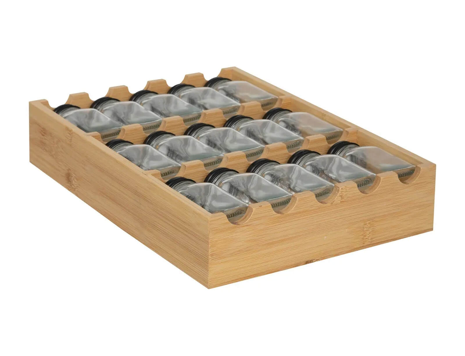 Οργανώστε και τακτοποιήστε τα μπαχαρικά σας με το σετ δοχείων από τη 5five. Το σετ αποτελείται από 15 δοχεία για μπαχαρικά και μια βάση, η οποία δεν καταλαμβάνει πολύ χώρο στον πάγκο ή το συρτάρι σας. Μπορεί να τοποθετηθεί είτε οριζόντια είτε όρθια με το ξύλινο σταντ. Τα δοχεία έχουν χωρητικότητα 70ml το καθένα και κλείνουν αεροστεγώς ώστε τα μπαχαρικά σας να παραμένουν φρέσκα χωρίς να χάνουν το άρωμά τους για μεγάλο χρονικό διάστημα. Η βάση είναι κατασκευασμένη από ξύλο μπαμπού και τα δοχεία από γυαλί και πολυπροπυλένιο.