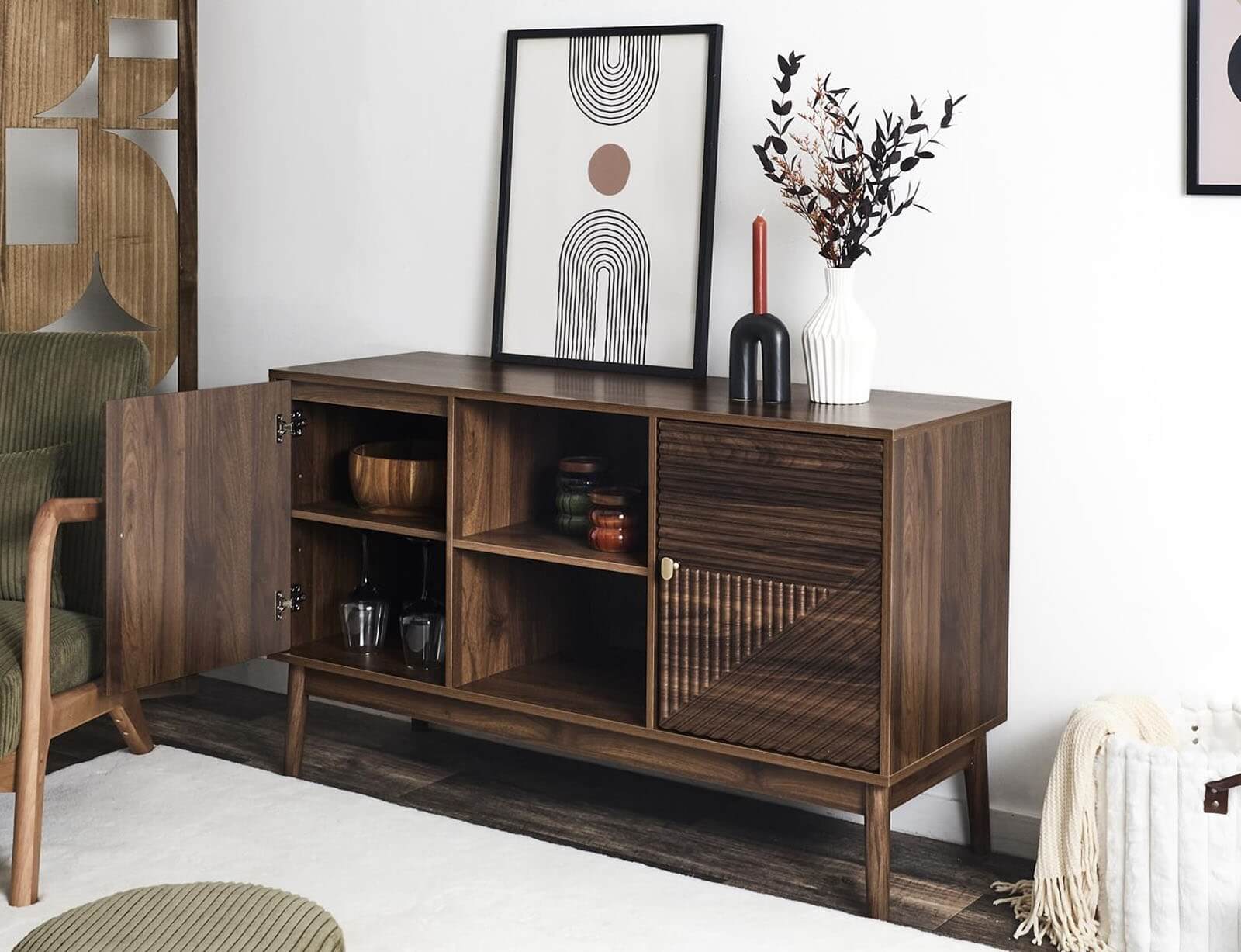 Διακοσμήστε και οργανώστε το χώρο σας με το μπουφέ Tiffany από την Home Deco Factory. Αποτελείται από 2 ντουλάπια και ράφια, όπου μπορείτε να αποθηκεύσετε και να οργανώσετε ό,τι θέλετε. Συνδυάζεται ιδανικά με έναν καθρέπτη ή έναν διακοσμητικό πίνακα και διάφορα διακοσμητικά και θα δώσει μια αίσθηση κομψότητας στο χώρο σας. Είναι κατασκευασμένος από MDF και στηρίζεται σε 4 πόδια που δένουν αρμονικά με το σύνολο.