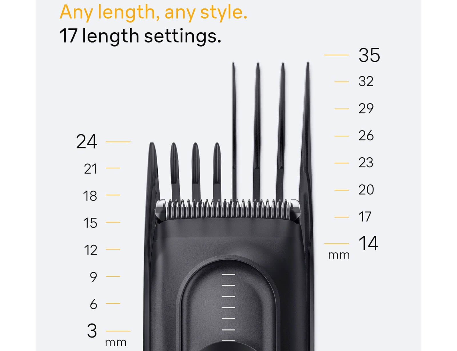 Διαθέτει δύο αποσπώμενες χτένες, τις οποίες μπορείτε εύκολα να εφαρμόσετε στην κεφαλή της κουρευτικής μηχανής. Με πολλαπλές ρυθμίσεις μήκους, καλύπτει εύρος διαφορετικών στυλ και κουρεμάτων. Η λειτουργία κλειδώματος μήκους διασφαλίζει σταθερότητα και συνέπεια — κάθε φορά.
