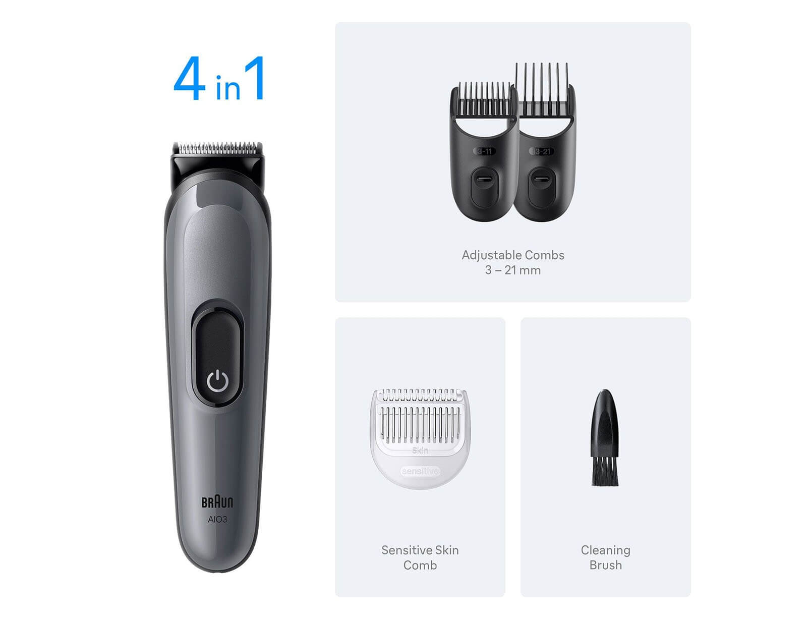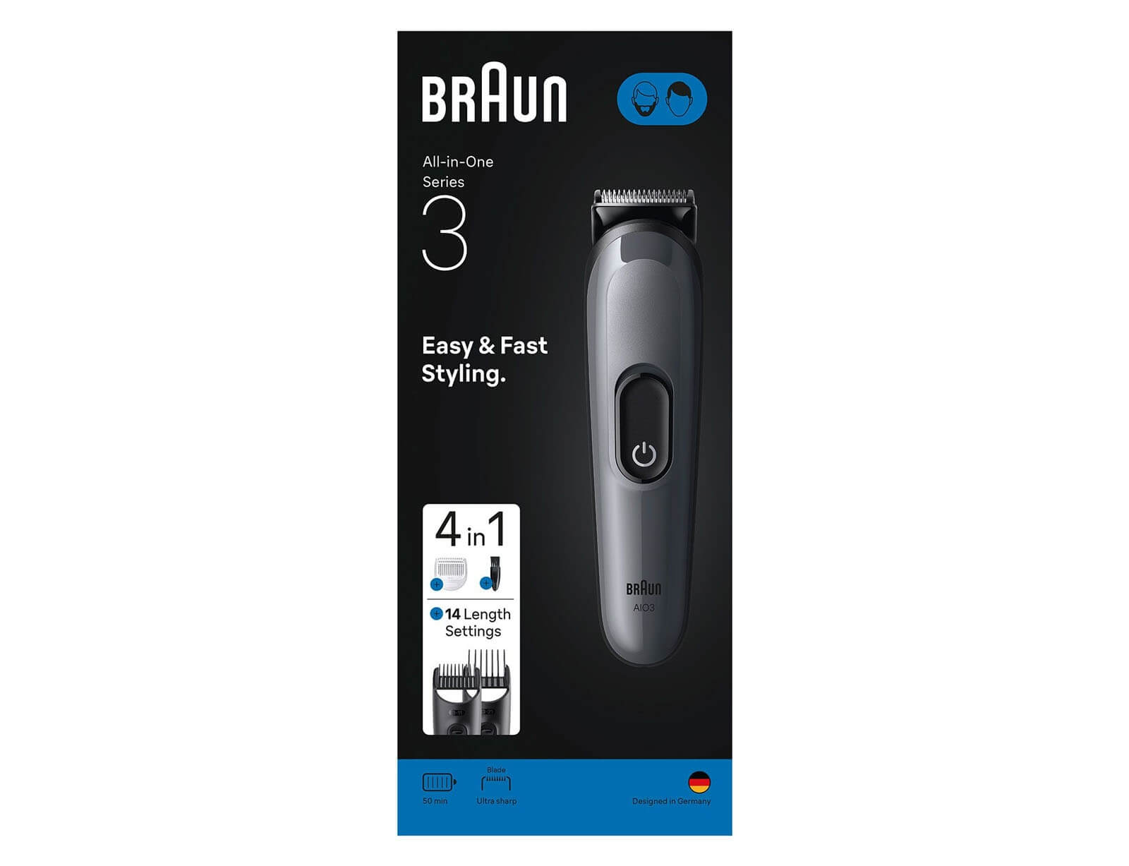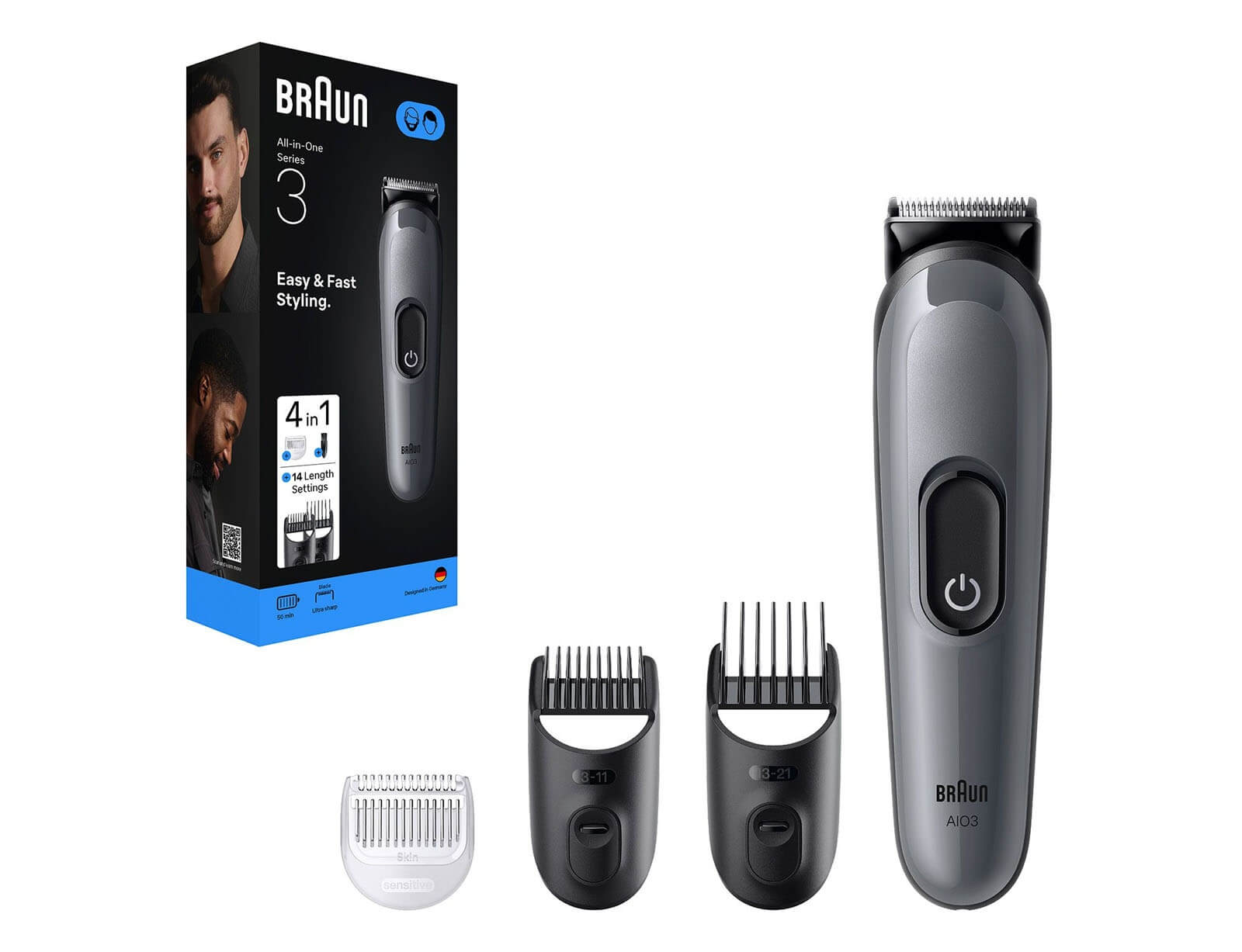 Σετ Ανδρικής Περιποίησης 4 σε 1 Braun Series 3 AIO3500 με 3 εξαρτήματα και 14 ρυθμίσεις κοπής