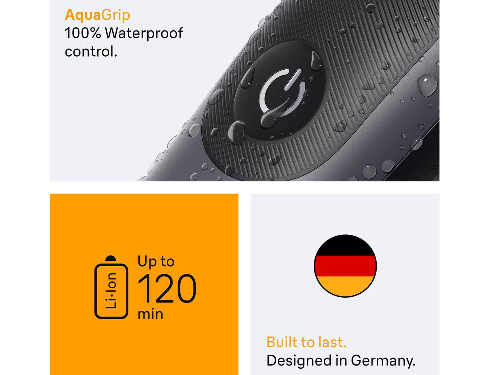 Χάρη στην τεχνολογία AquaGrip, η συσκευή προσφέρει ασφαλές κράτημα ακόμα και με βρεγμένα χέρια, ενώ μπορείτε να την χρησιμοποιήσετε και μέσα στο ντους για μεγαλύτερη ευκολία και υγιεινή.