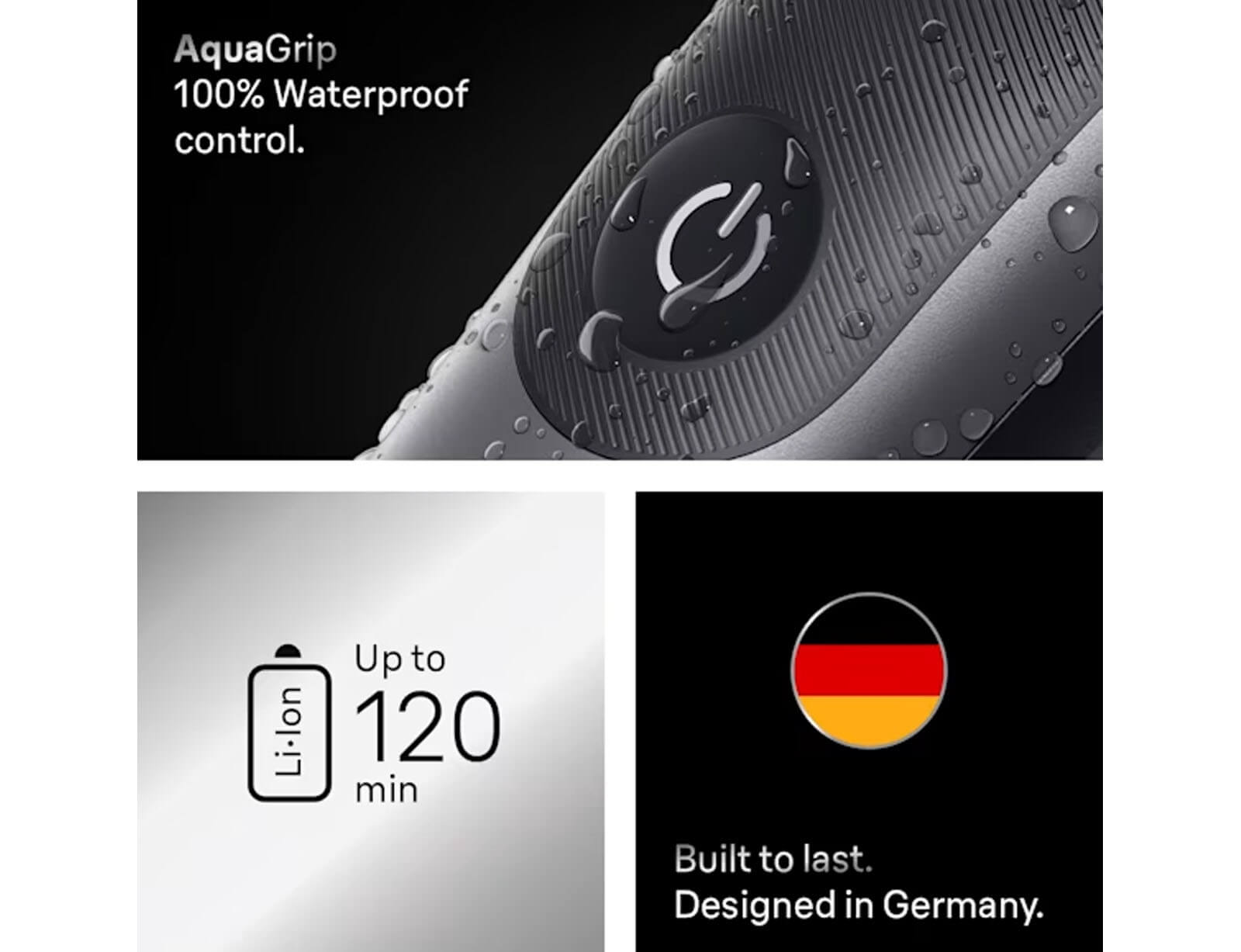 Χάρη στον αδιάβροχο σχεδιασμό και τη λαβή AquaGrip, το grooming kit προσφέρει άνετο κράτημα ακόμα και στο ντους, ενώ καθαρίζεται εύκολα με τρεχούμενο νερό. Ιδανικό για χρήση παντού, χωρίς περιορισμούς.