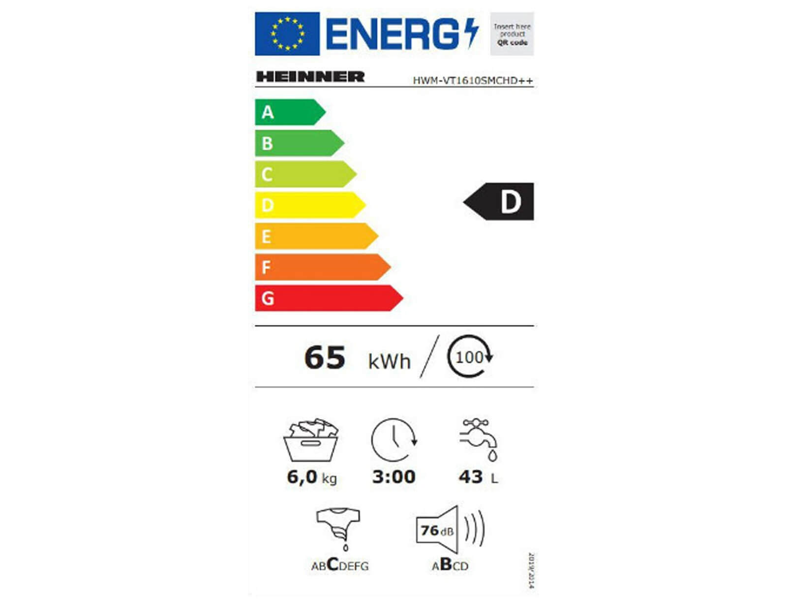Πλυντήριο ρούχων Heinner HWM-VT1610SMCHD++ με χωρητικότητα 6kg, 1000rpm και ενεργειακή κλάση D