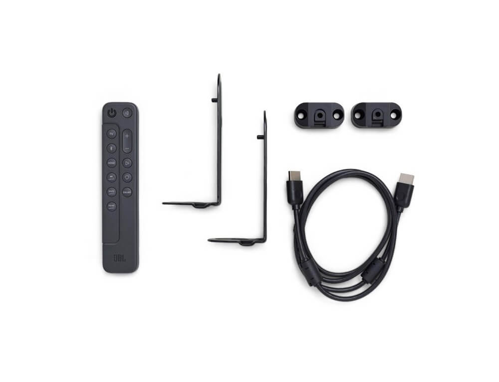 - 2x στηρίγματα τοίχου σε σχήμα L (κύρια μπάρα) + 2x στηρίγματα τοίχου σε σχήμα U (για ηχεία surround) κιτ με βίδες