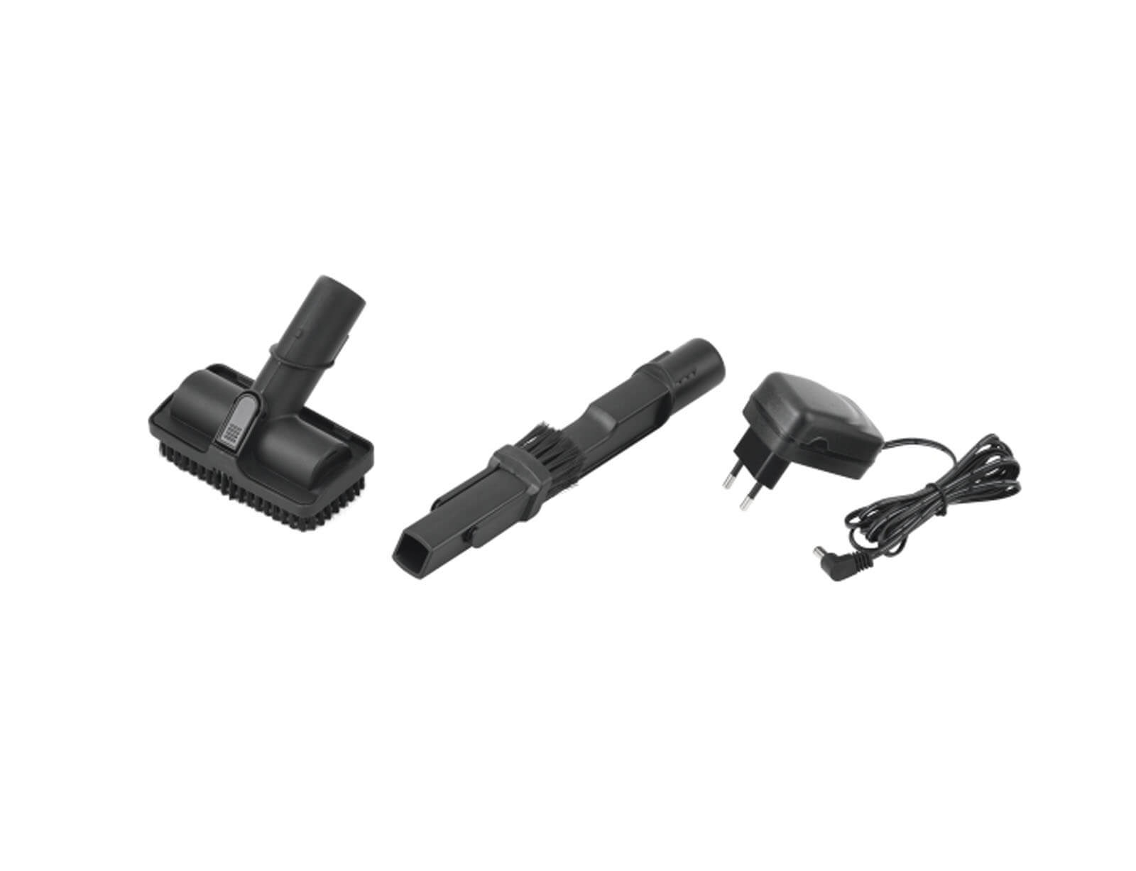 Σωλήνας επέκτασης, ευέλικτο πέλμα δαπέδου, ακροφύσιο 2 σε 1, εξάρτημα στρωμάτων και επίπλων 2 σε 1, φορτιστής, ιμάντας επιτοίχιας τοποθέτησης